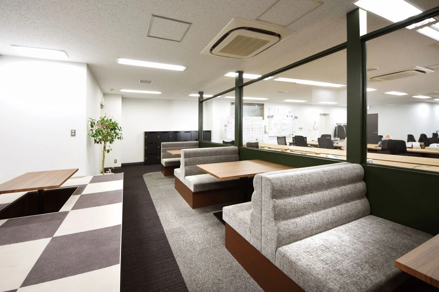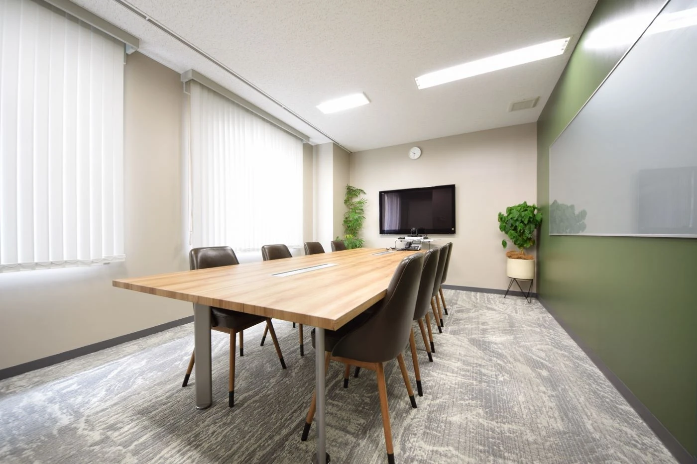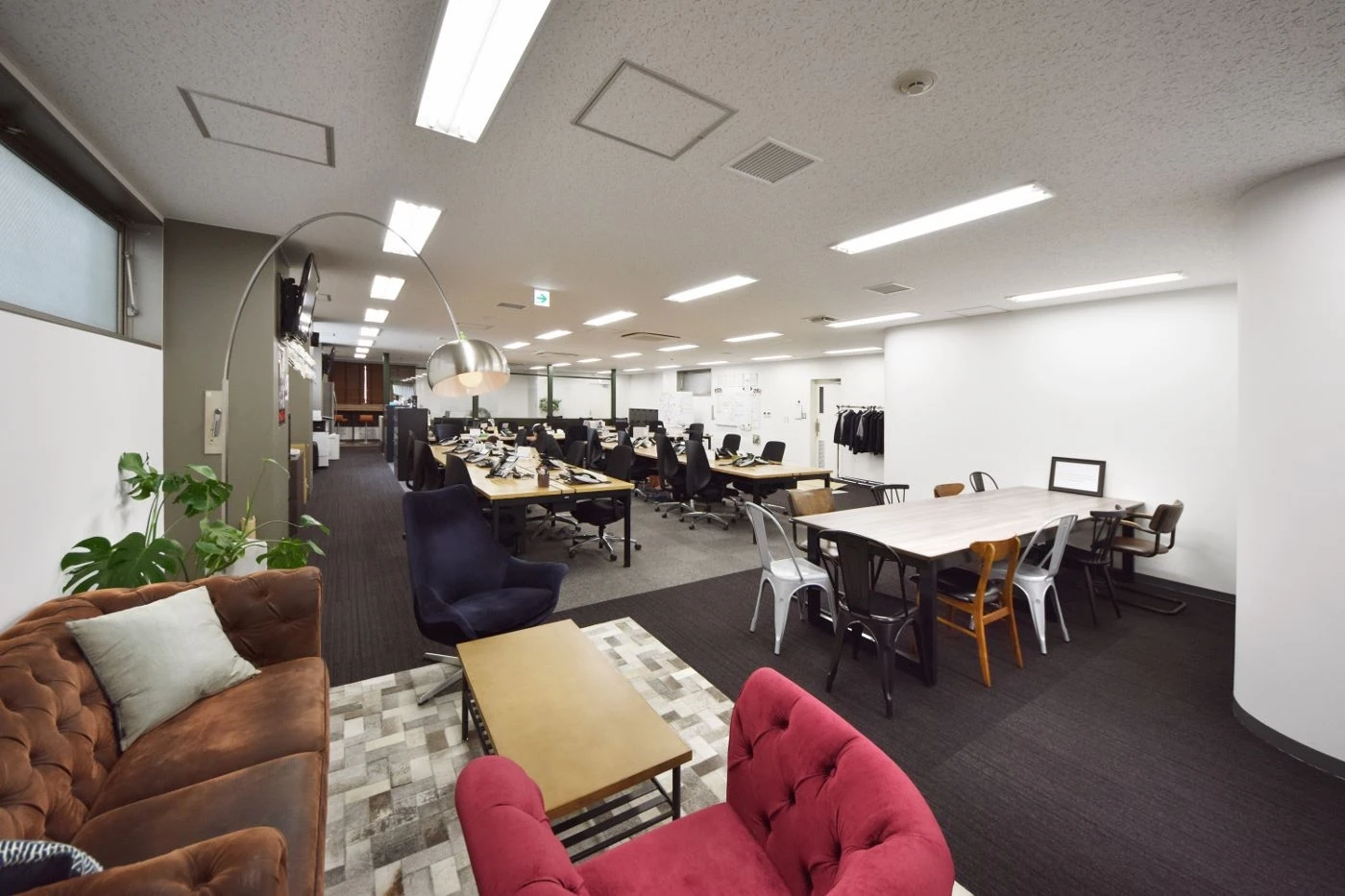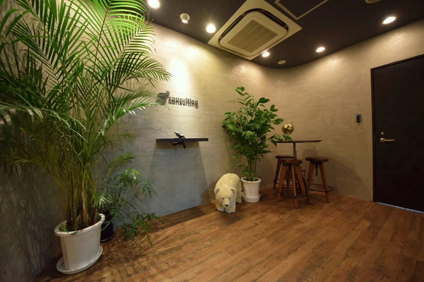 居抜き物件でのご移転だった為、残された壁などは最大限活用しつつも、エントランス・会議室・ワークスペースの全ての空間にて”アン・コンサルティング様らしさ”を感じさせるデザインに一新させました。エントランススペースは天井をチャコールグレーに塗装し空間全体をクールな印象に仕上げつつ、壁は左官塗装を施すことで高いデザイン性と独創性を演出。床材はリアルな素材感を感じさせるフローリング材を使用することで、よりワイルドな印象にデザインしました。会議室ごとにデザインイメージを変え、アースカラーとブルーカラーそれぞれを基調としてコーディネイし、床材・壁仕上げ・家具全てにこだり空間を仕上げました。