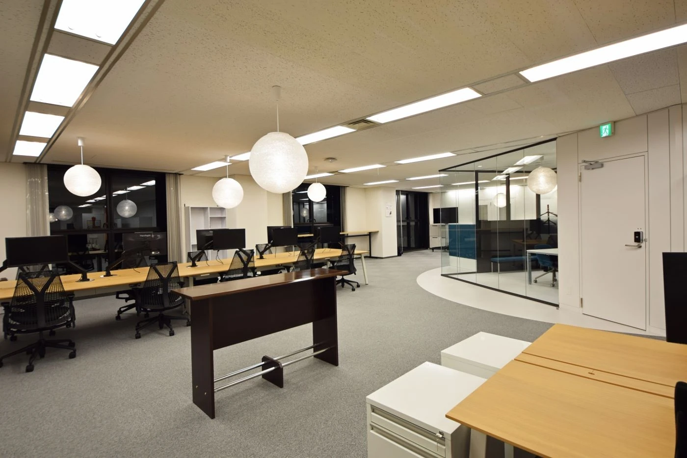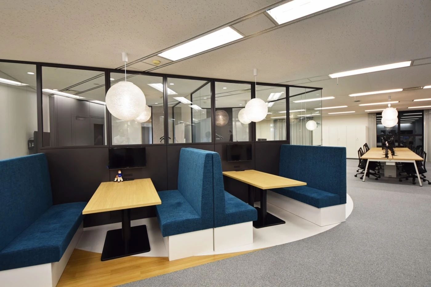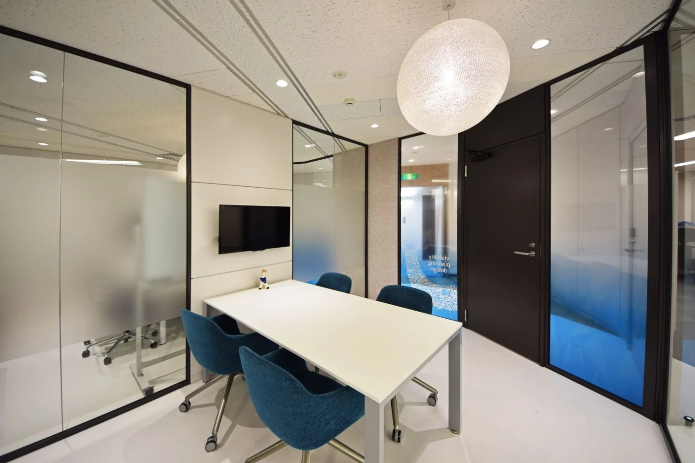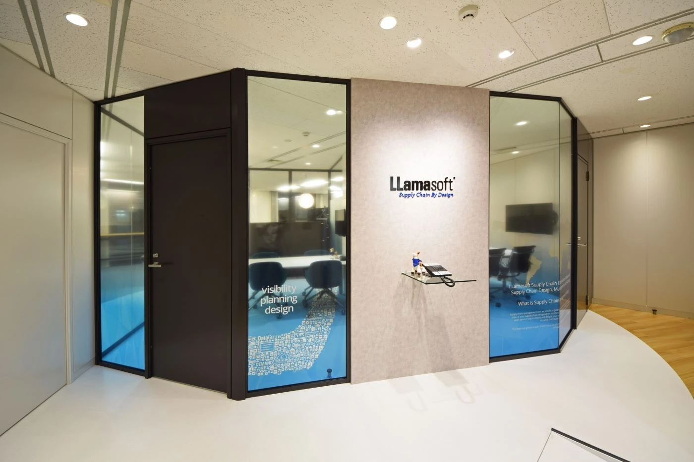 エントランスと会議室を隔てる壁、会議室とワークスペースの間にある壁を共にガラスを採用いたしました。空間に広がりを持たせ、透明性のあるオープンなオフィス空間に仕上がりました。エントランス入ってすぐのガラス面に貼ってあるグラフィックには、コーポレートカラーのブルーとアイコンであるラマやメッセージで構成されており、来客者へのブランディングの発信の場となっております。オープンな空間にすることでデザインメッセージが社外への発信だけでなく社内へも発信され、空間だけではなく『BORDERLESS』のコンセプトがオフィス全体に広がっています。