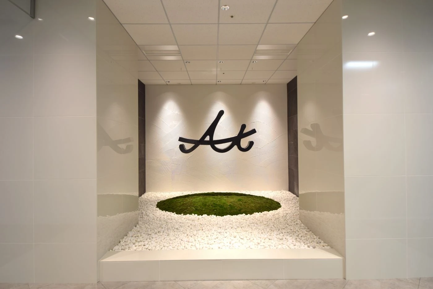エントランスに足を踏み入れると、長く続く通路の先に存在感を放つロゴサインが印象的です。壁面にはテクスチャーの特徴的な左官、高級感のあるタイル、苔をイメージしたグリーンを取り入れるなど、当初からお客様の中でキーワードとしてあげられていた”和モダン”というテイストを、シンプルな空間の中に織り交ぜました。ワークスペースは、無機質な空間とならないよう全体を木目調にまとめ、随所にミーティングスペースを設ける事で、コミュニケーションが生まれる空間となるよう設計しました。