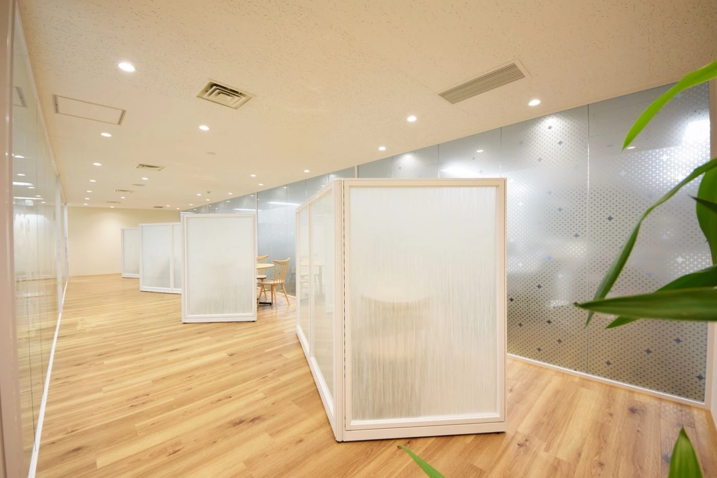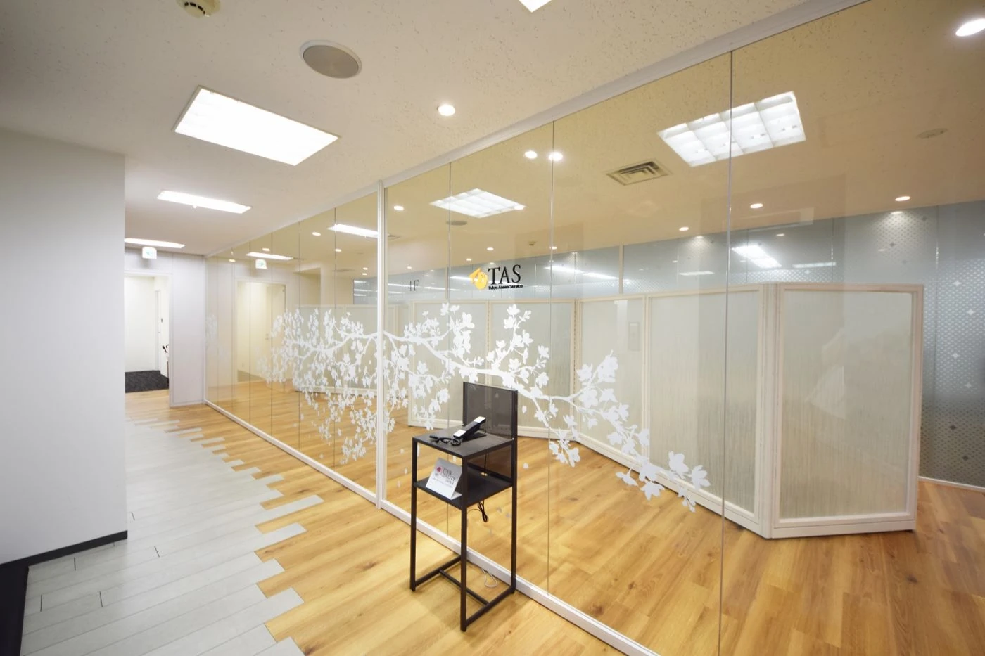 事業拡大に伴う、ご移転のお手伝いをさせて頂きました。"和をベースとしたテイストで日本の魅力を発信できるようなオフィス"というご要望を頂き、来客スペース4つを日本の四季を感じるデザインとしました。エントランス兼オープンスペースは「春」とし、ガラス壁に桜のカッティングシート、和紙のようなワーロンシート、幾何学模様のデザインシートを施し、3層にわたり表情の異なるガラス壁で奥行きと解放感を演出しつつ和の空間をデザインしました。個室の会議室には「夏」「秋」「冬」のそれぞれのテーマカラーを全面的に強調したデザインとし、来訪されたお客様もワクワクするオフィス空間となりました。