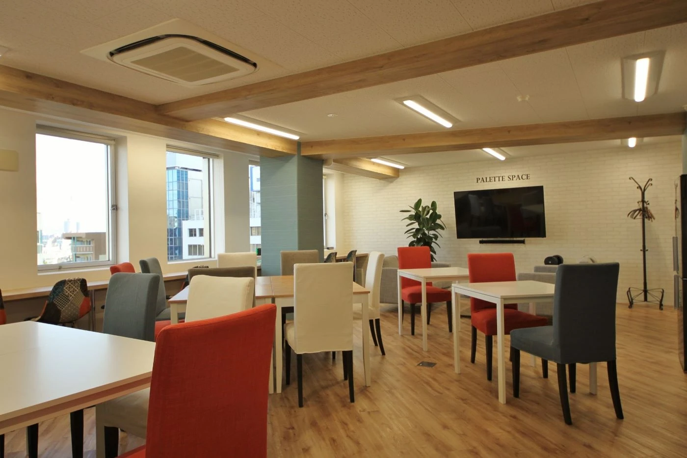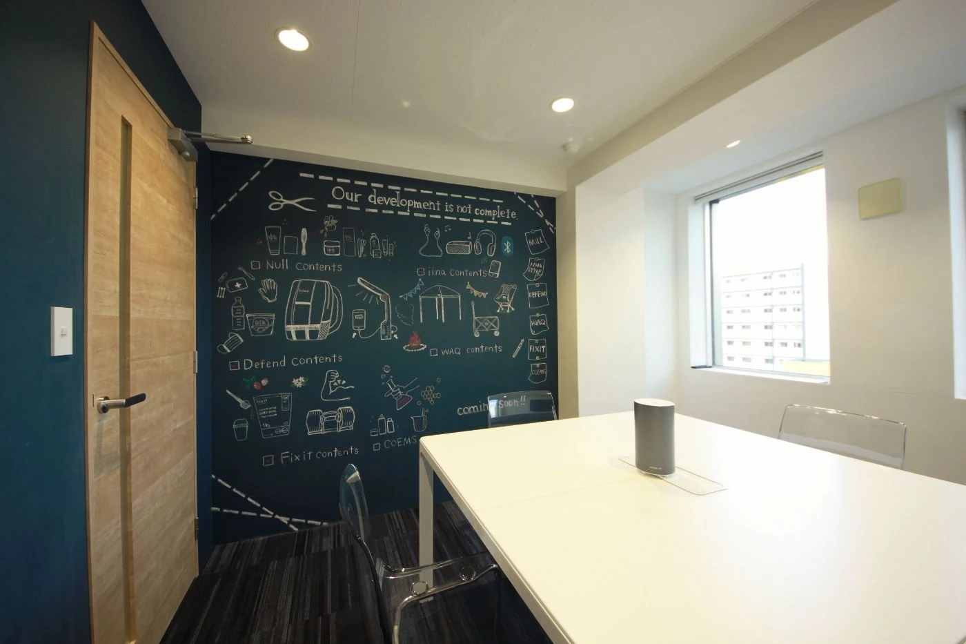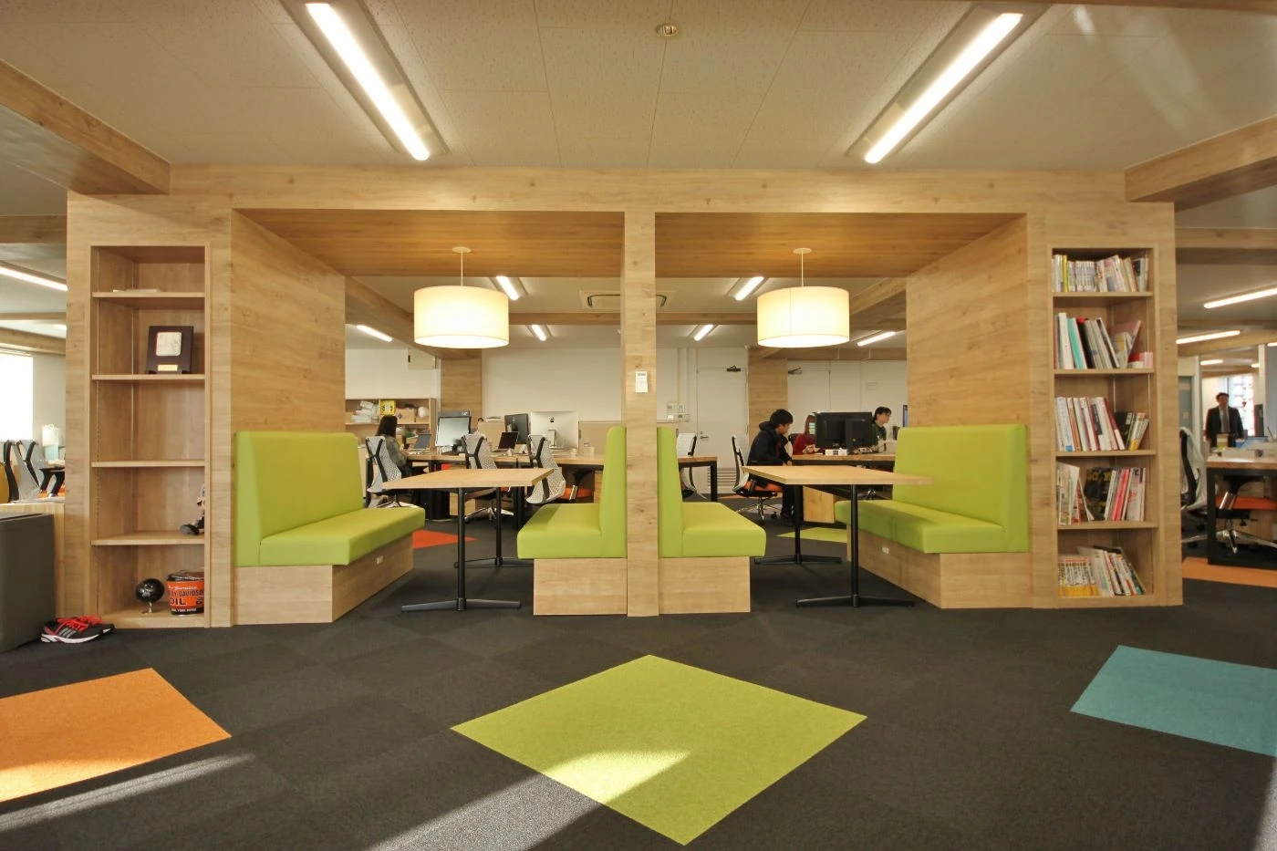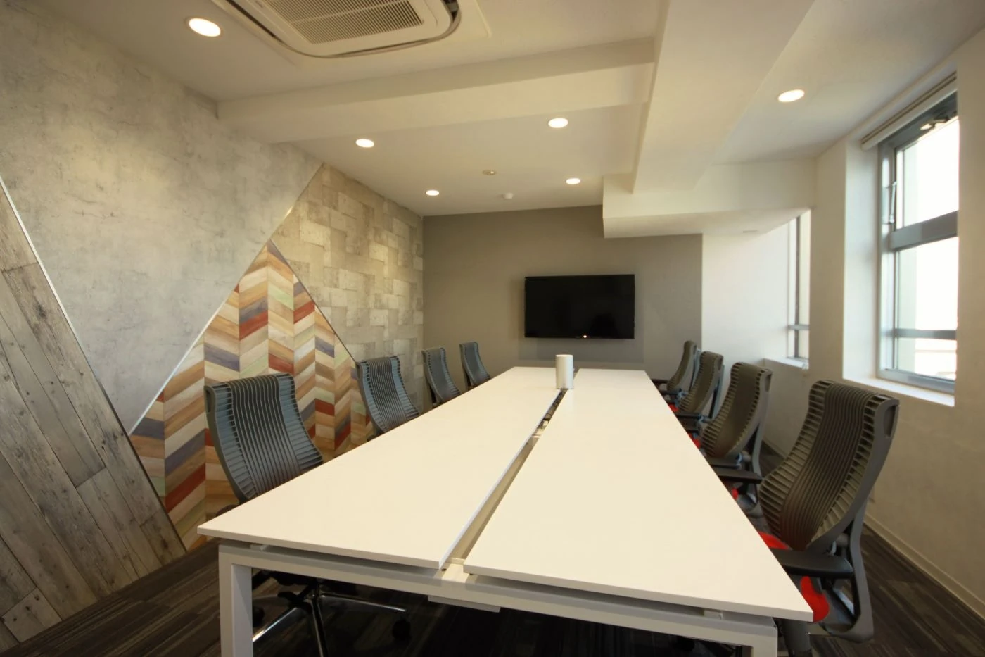 今後のさらなる事業拡大を見据え、今回のオフィスデザインをご依頼いただきました。「従業員1人1人を大事にする社風をオフィスに表現したい」というご希望のもと、社員さまがワクワクしながら働ける空間づくりを意識しました。エントランスデザインでは白壁と木目の床で落ち着いたイメージを演出しながらも、社名ロゴサインをLED発光サインにすることで空間にインパクトを。ワークスペースは床をカラフルにデザイン張りし、個性豊かで賑やかな空間になるようにデザインしました。天井から一段下がっている梁が多いという特徴的なオフィス物件でしたが、敢えて梁に木目のシートを貼る事で梁さえもデザインの一部に。各会議室のコンセプトも全て変えることで、内装デザイン、選定家具までひとつひとつが特徴的なものとなりました。会議室の名前もお客様で決めて頂き、さらに愛着の湧くオフィスづくりが実現しました。