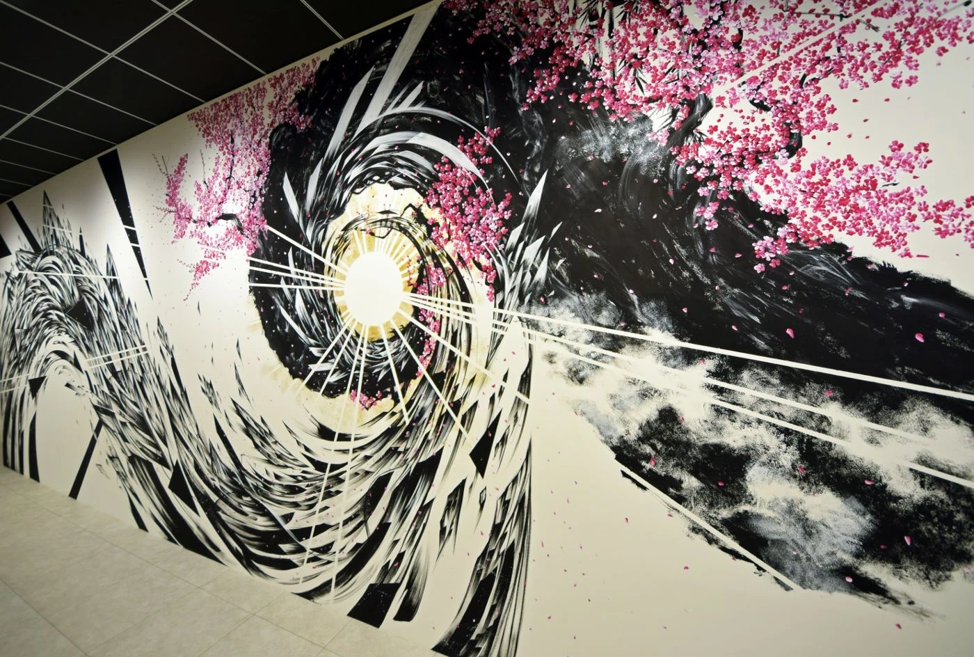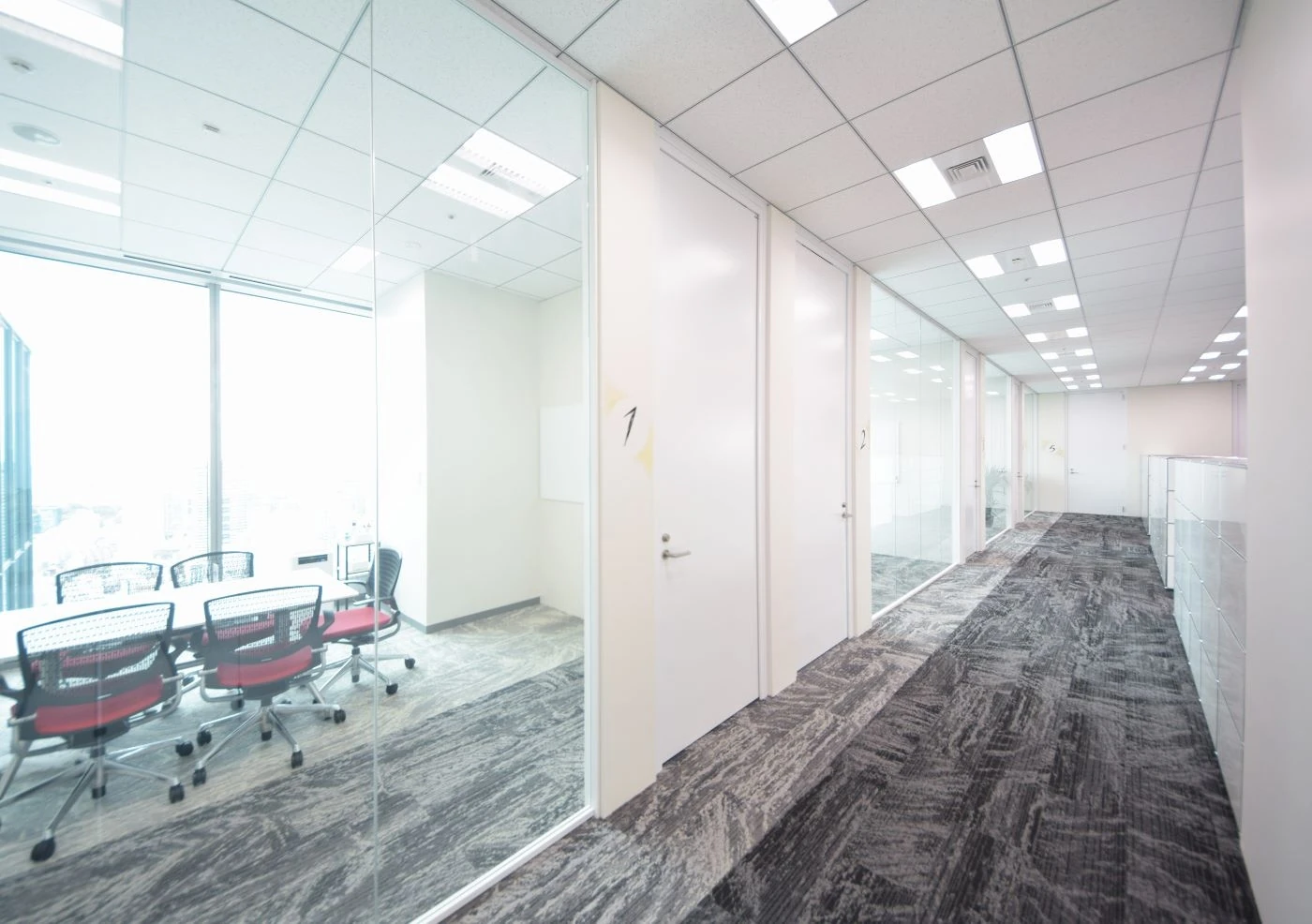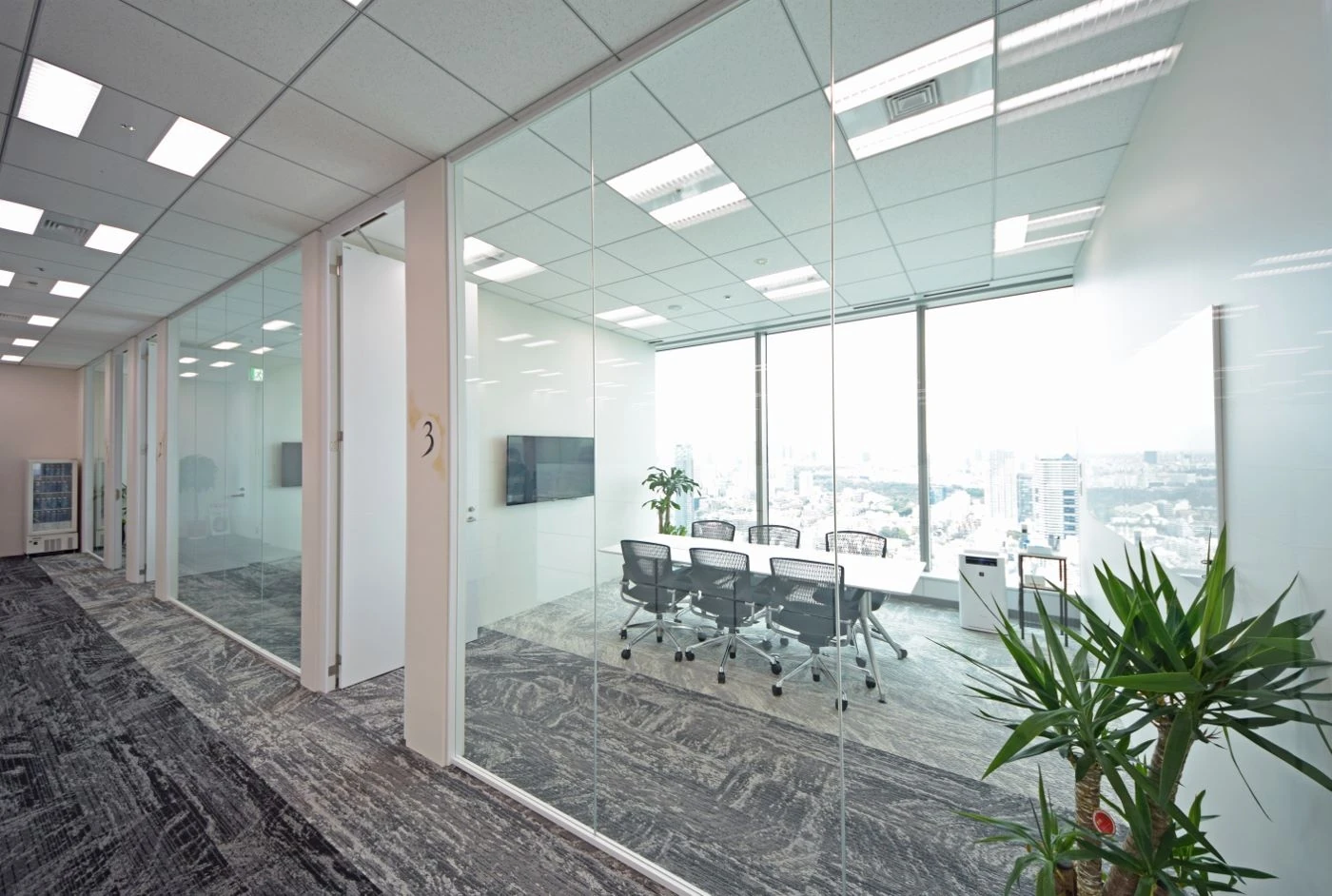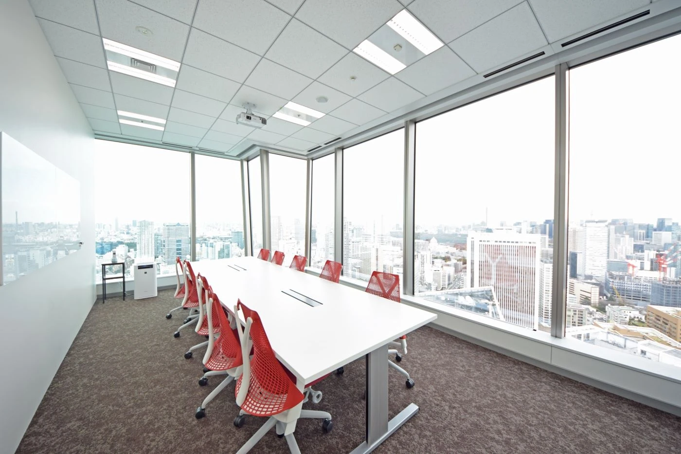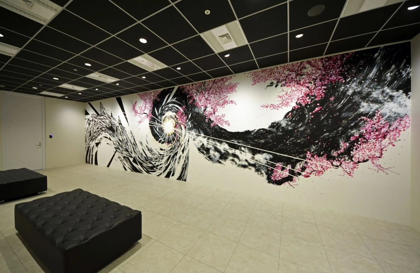インパクトのあるエントランスを実現すべく、10mある壁面にアーティスト2名のコラボペイントを施し、大胆且つ唯一無二のデザインを取り入れました。会議室は、32Fからの絶景を活かすため全面窓を取り入れ、ワークスペースと廊下の仕切りは壁面ではなく、目線高までのハラーシステムキャビネットを置く事により、空間の一体感・開放感を尊重しました。ホワイトでまとめた空間の中、床はグレー系グラデーションで貼り分け、明るさを感じさせつつも、大人っぽい落ち着きのあるオフィスへと仕上がりました。