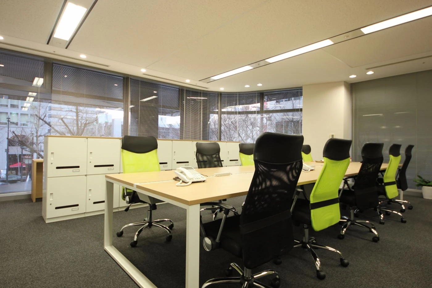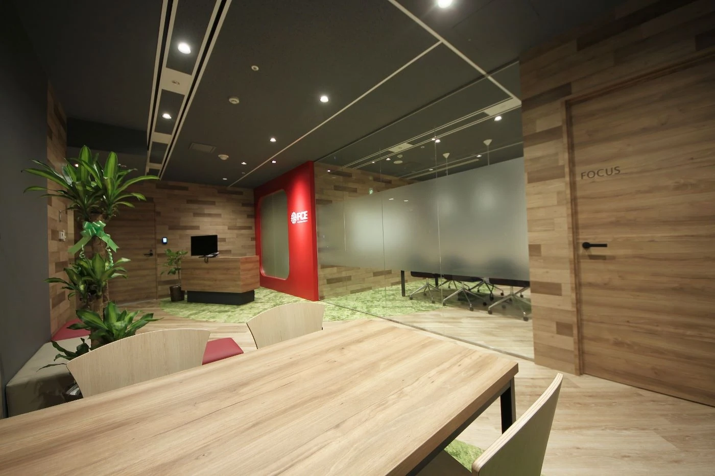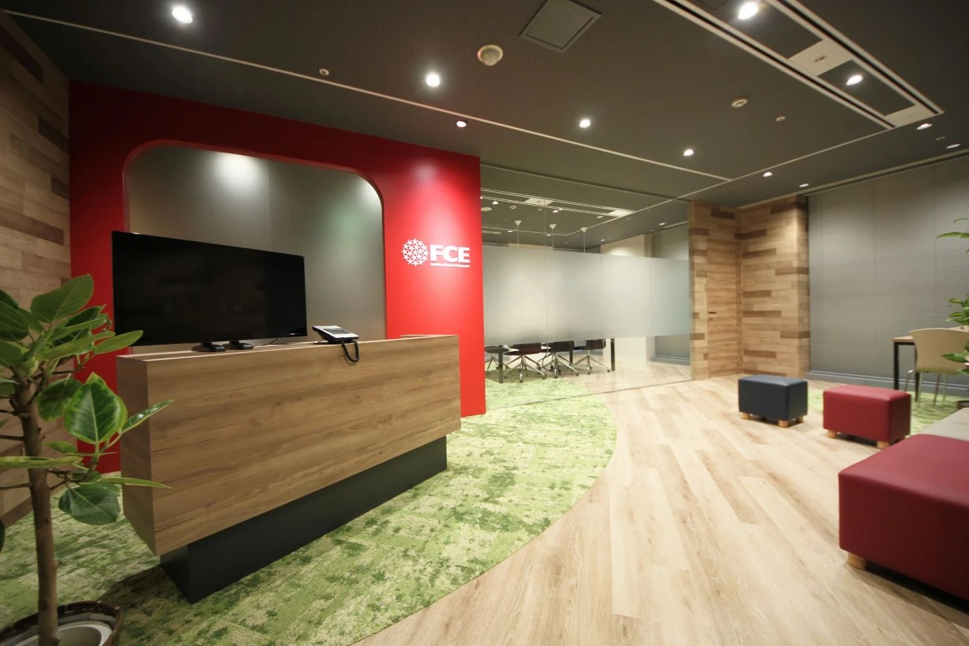 「セミナーに参加される方々がワクワクして、ポジティブになれるような空間にしたい」というご要望から、セミナー参加者の期待感を高められるようなオフィスデザインを意識しました。セミナーに参加される方の休憩スペースとなるエントランススペースは広々とした空間を設け、床をグリーンのタイルカーペットと木目の塩ビタイルで緩やかなウェーブを描くように張りわけることで空間に動きを演出しました。会議室の間仕切り壁は全面ガラスにすることで、開放的で自然を感じられる空間となりました。またFCEとしてのブランドイメージもしっかり感じられるよう、インパクトのある赤で壁面をデザイン。東京本社のデザインイメージを一部取り入れながらも、大阪営業所の特徴である温かみを感じられる特別なオフィス空間が出来上がりました。