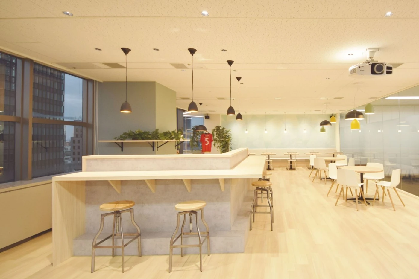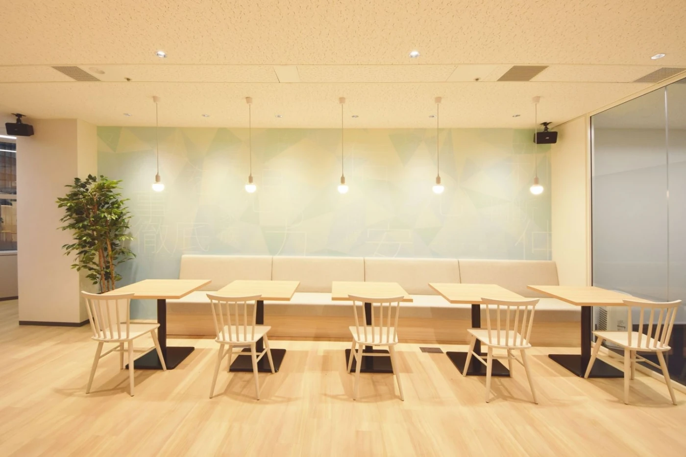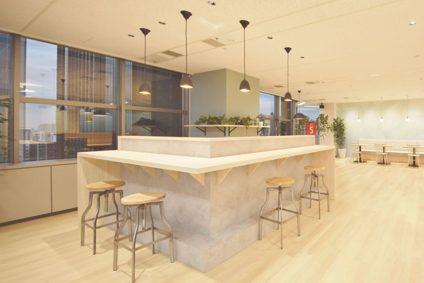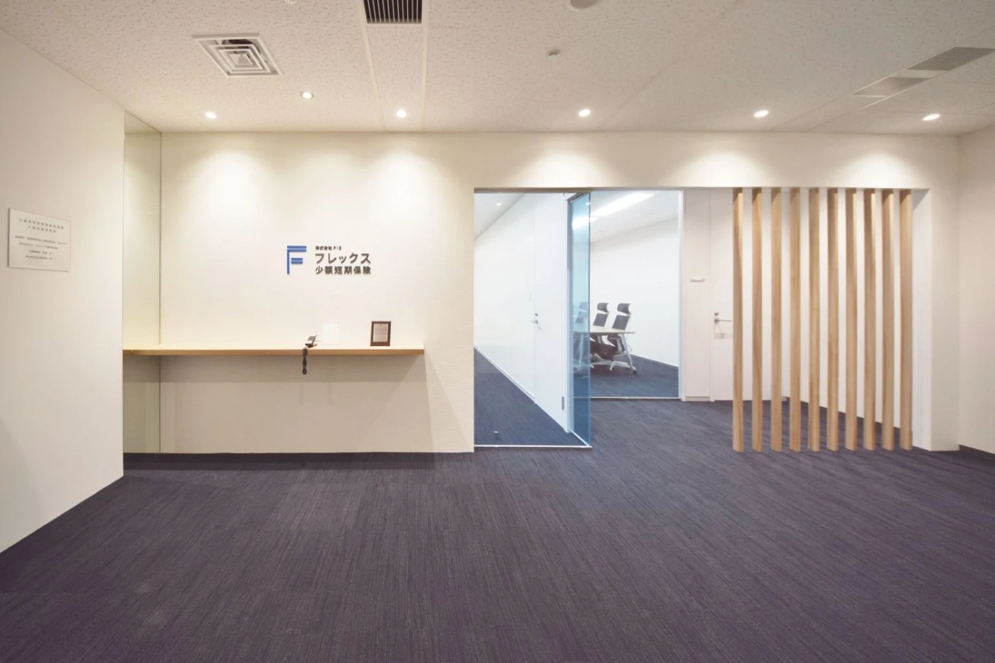 少額短期保険会社である株式会社FIS様の新オフィスはベンチャー企業でありながら、訪れた方へ安心と信頼を感じて頂ける空間を意識したデザインとなっております。ガラスの壁にはコーポレートカラーであるブルーのシートを貼りコーポレートアイデンティティを表現。ポイントとしてルーバーや受付カウンターに木目を加える事で、スタイリッシュ且つ温かみを感じられるようなデザインとなっています。リフレッシュエリアにはバーカウンターを設け、コミュニケーションの活性化を、壁面には企業理念をイメージしたグラフィックを施し、オフィスで働く皆様の士気向上に繋がるスペースが実現できました。