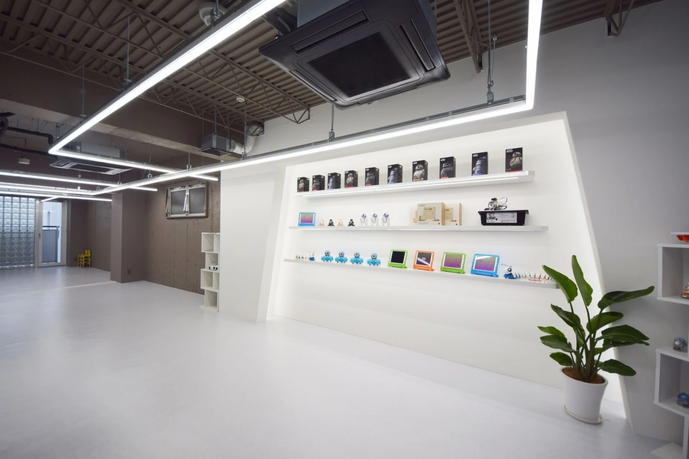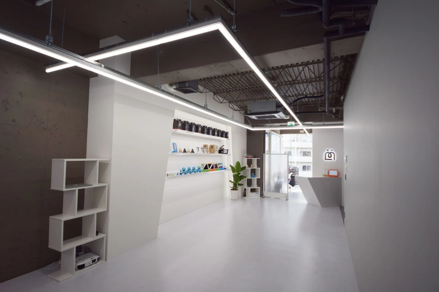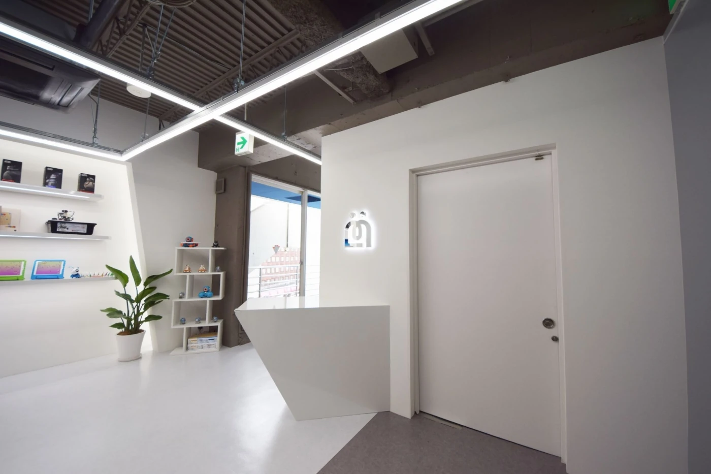 「渋谷に話題性のある空間を」というところから出発し、文字通りの空間をお客様と一緒に作り上げる事ができました。子供たちの「みらい」を応援する企業として"近未来"をコンセプトとしデザイン。光るエントランスサインや天井のLED照明、壁面の造作棚に設置した間接照明など、ライティングにこだわることで近未来をイメージさせる宇宙船のような空間を演出しています。可動式間仕切もガラスを使用することで、広がりのある空間となっています。大人から子供まで集える素敵な空間が完成しました。