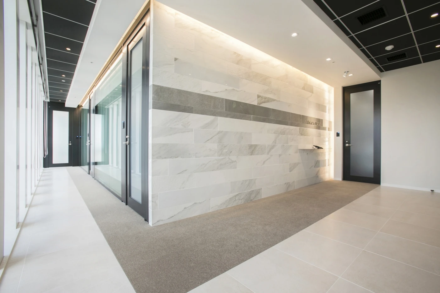 「洗練」をキーワードに全体のカラーやマテリアルにこだわり、シンプルながらも優美性を感じられるオフィスを実現しました。信頼や安心感、品を感じさせるGRAY+BEIGEで色彩を統一しつつ、壁面には石材を用い素材の質感にこだわったエントランスとなっています。お客様をおもてなしする会議室は、壁面にデザインパネルを施すことでまるで上質なラウンジに招かれているような空間を演出しています。どこの空間からも崇高な印象を与える、素敵なデザイナーズオフィスとなりました。