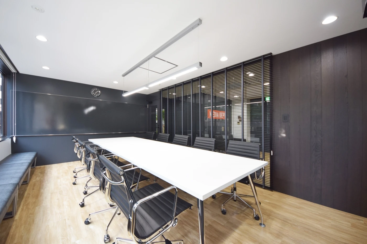 黒と木目を基調にした洗練されたクールなデザインで、更なる期待感を感じさせるオフィスとなりました。エントランスを入ってすぐの会議室には全面にガラスを使い、空間の広がり演出。同じビルでも少しのアイディアとデザインで、今までのオフィスとは全く違う空間になるという事を体感をしていただける、そんなクリエイティブな発想を刺激するリノベーションオフィスができました。