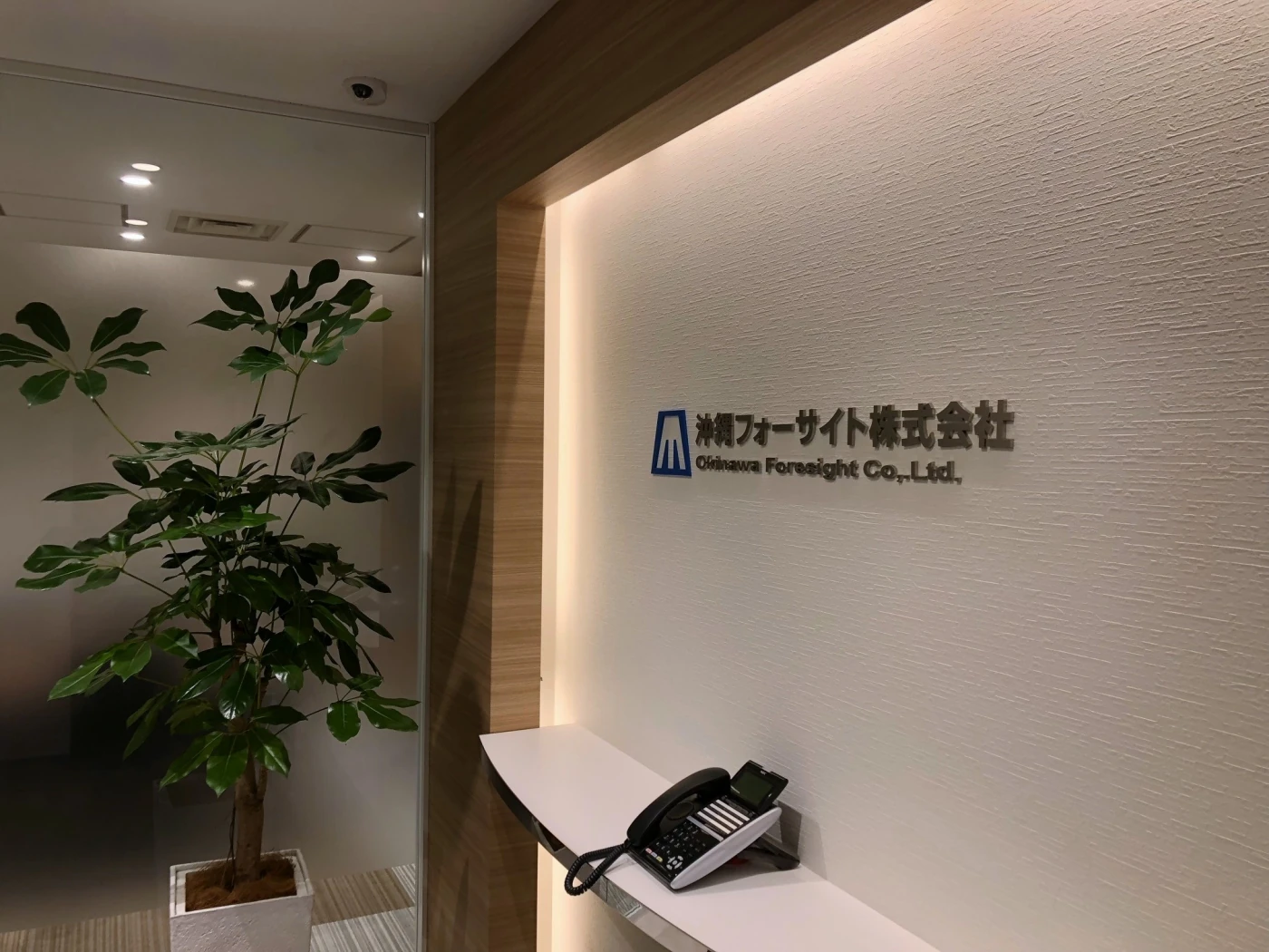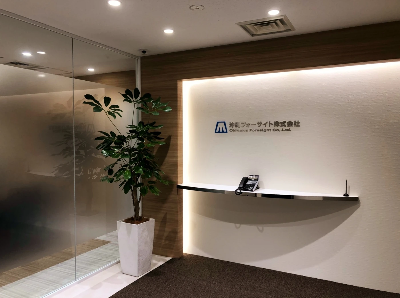 大阪のフォーサイトシステム様に続き、沖縄でのご移転もお手伝いをさせて頂きました。間仕切り壁を最低限に抑え、フレームのないガラスで空間を区切る事ですっきりと開放的な印象のエントランスに仕上がりました。ロゴサインの背景となるタイルにこだわり、ロゴのブルーとタイルのホワイトがマッチするようにデザインし、また淡い木目が入ることで、明るく品の良い高級感と信頼感を表現。誠実で爽やかな印象の沖縄フォーサイト様らしいオフィスになりました。
