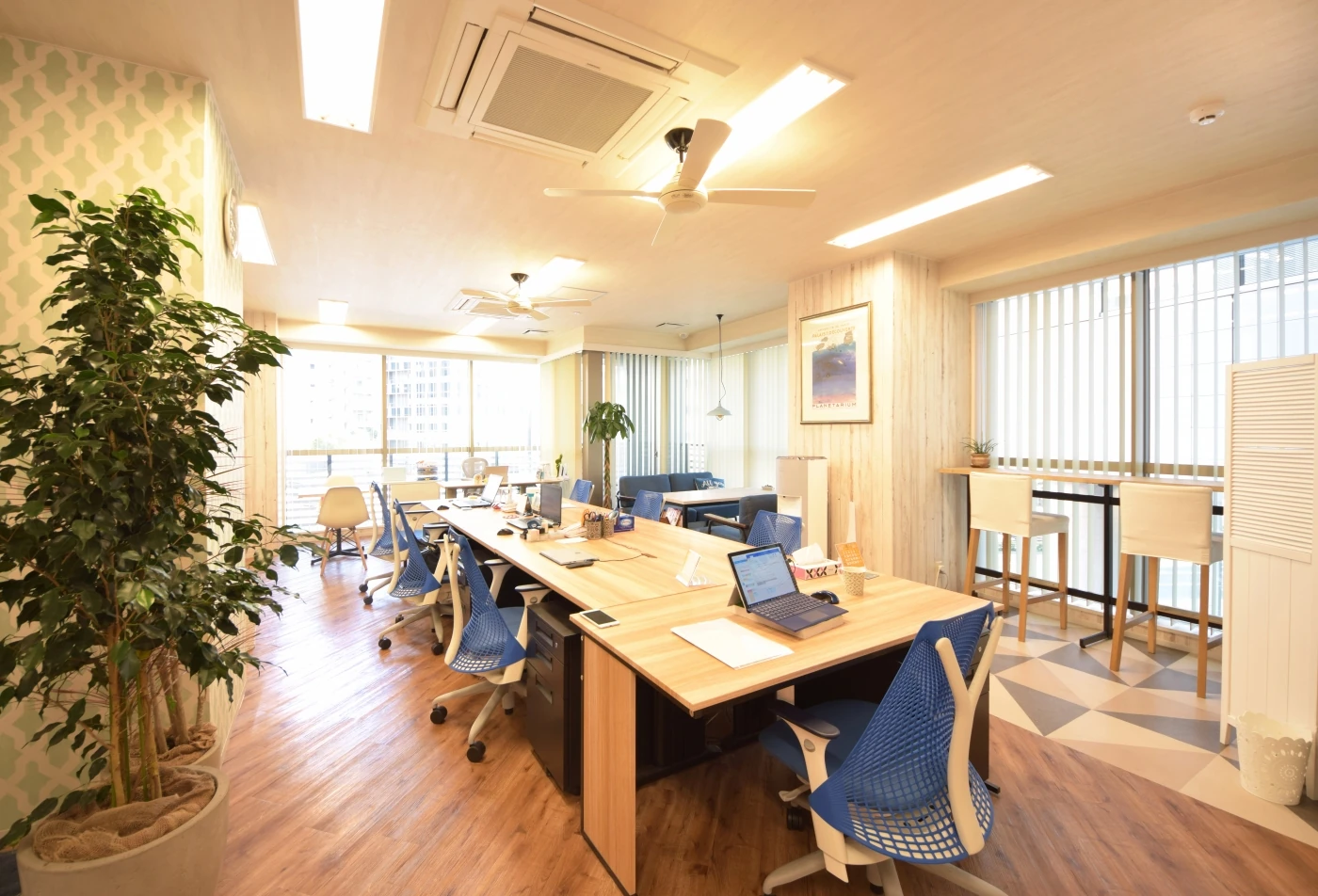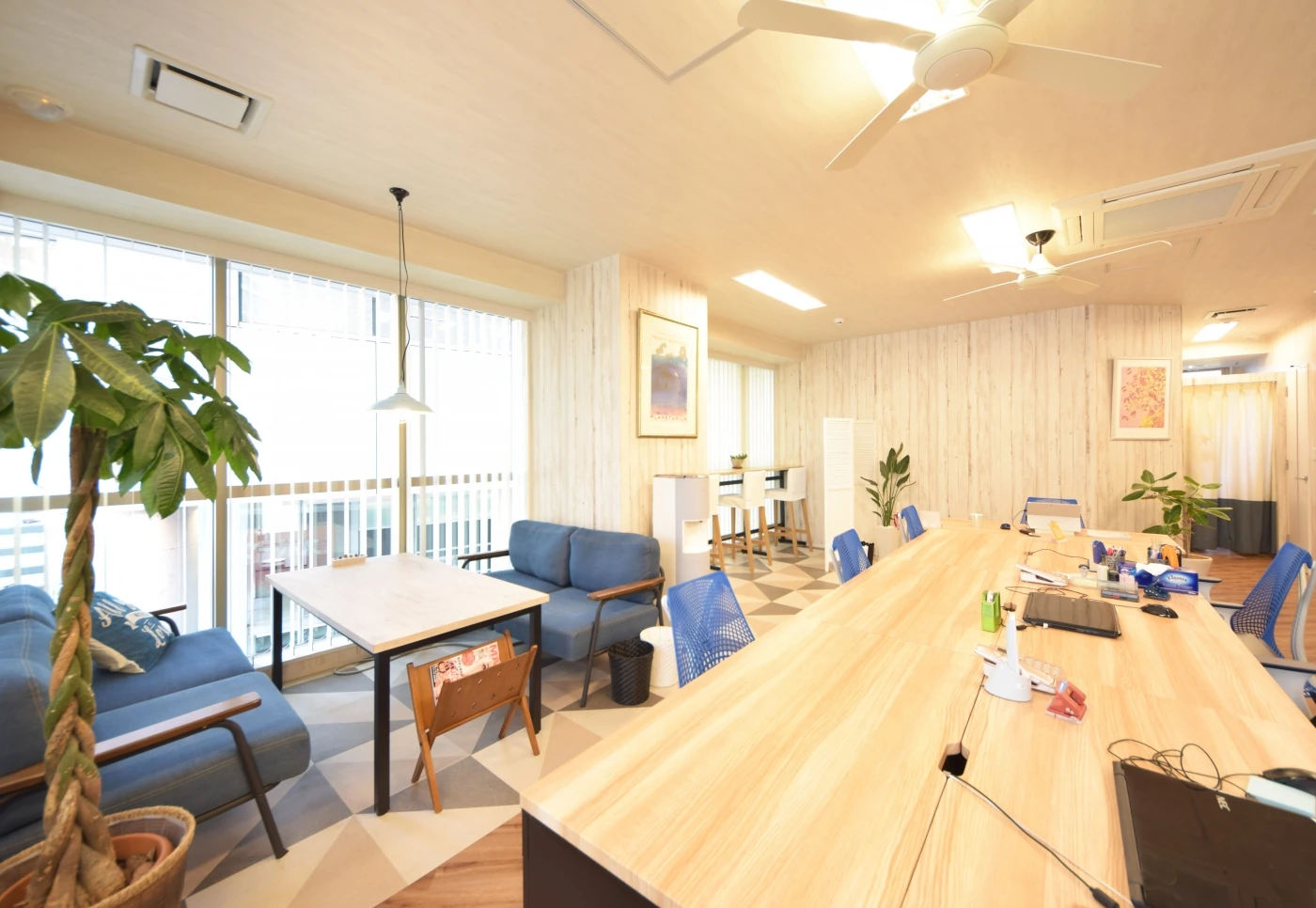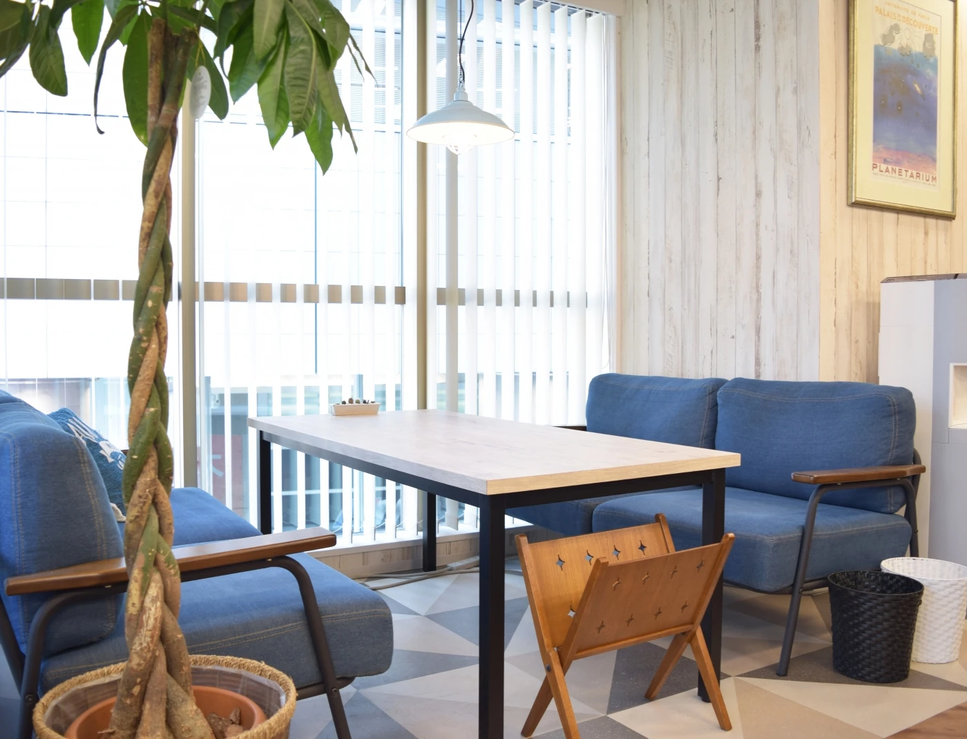 デザインについては、空間を明るく開放的なイメージに導くことを目的に"西海岸テイスト"というご要望を頂き、設計いたしました。ワークスペースは古材風のクロスを基調にしてヴィンテージ感を表現しつつ、デニム素材のソファやワークチェアでブルーの差し色で入れることで青い海を連想させる爽やかさを強調しています。カウンターやソファスペースの床には幾何学的な模様を用い、限られた空間の中でも雰囲気を一変させる効果をねらっています。岡田社長をはじめ社員の皆様や来客の皆様にまでもご好評の、居心地のいいデザイナーズオフィスが完成しました。