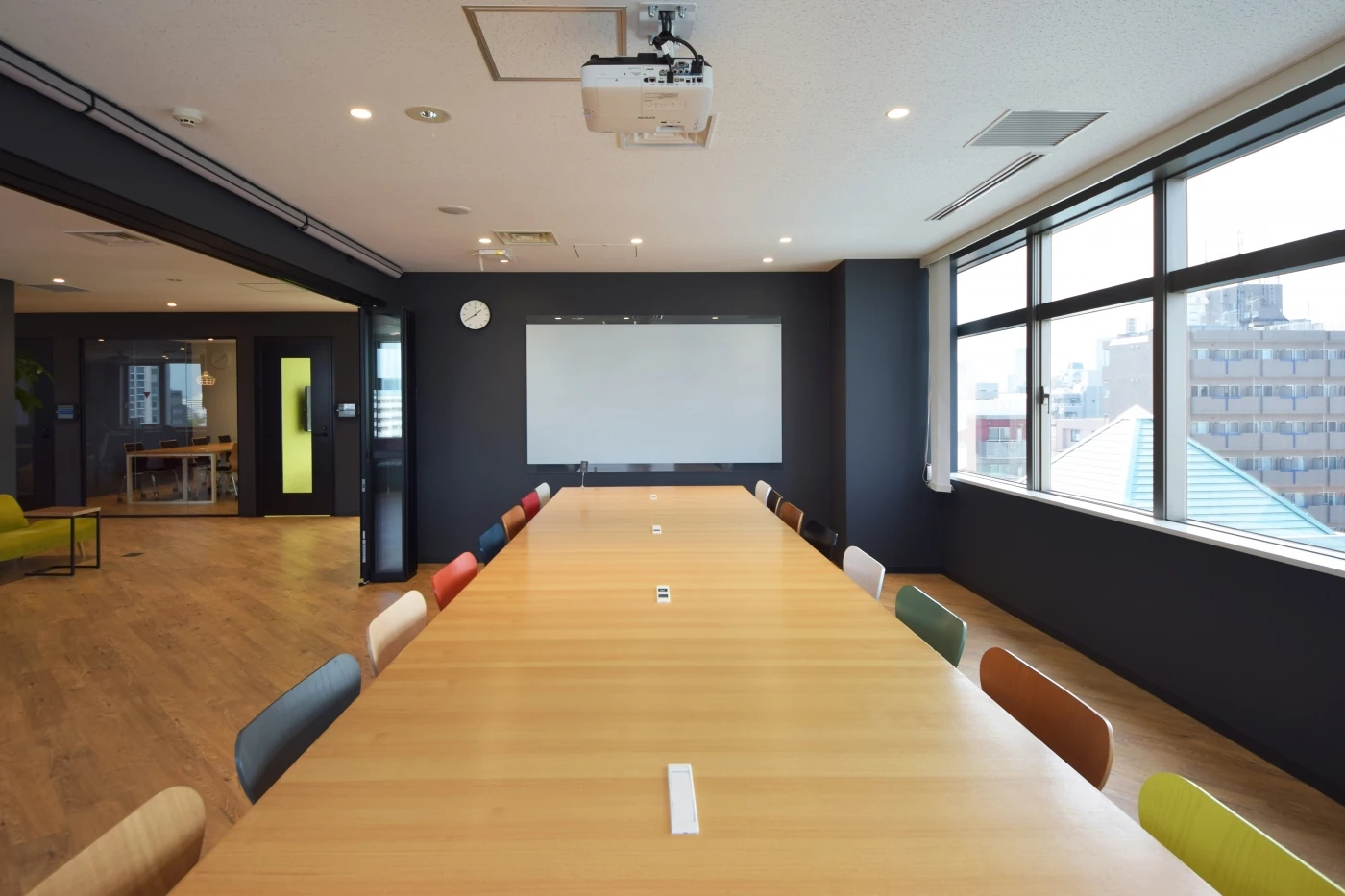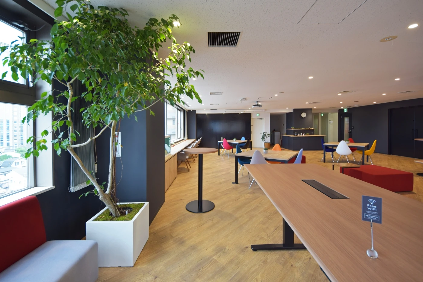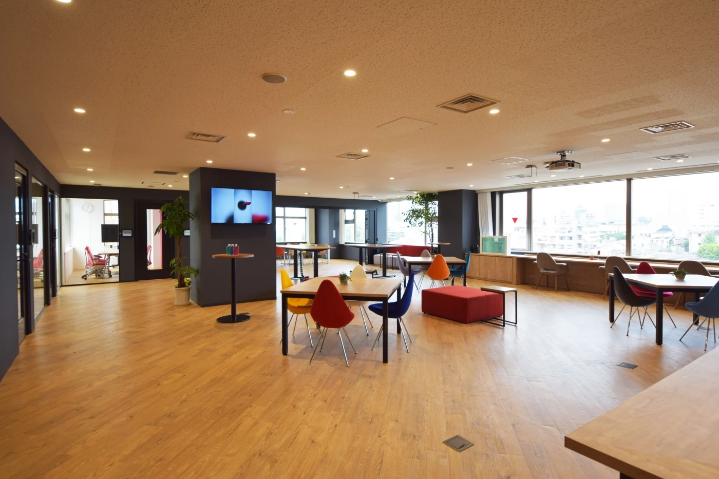 1フロアから2フロアへの増床プロジェクトに携わらせて頂きました。GUMIKEと呼ばれる展示会の開催やセミナー等も行えかつ、通常はコワーキングスペースとして利用できるような空間を設けました。斜めに広がる木目床と黒色の柱とパーティションで構成された空間(パレット)に、様々な色の家具がオープンスペースに彩りを与えています。いろいろなシーンに合わせて使えるよう据付の家具も最小限に抑えており、大会議室はイースターカーテンでオープンにもクローズドにもできます。各会議室もレッド・ブルー・グリーンと光の三原色にちなんだ個性的な部屋に仕上げました。いろいろな色(個性)が混ざり合うことで新たなアイデアが生まれる、そんなパレットオフィスの完成です。