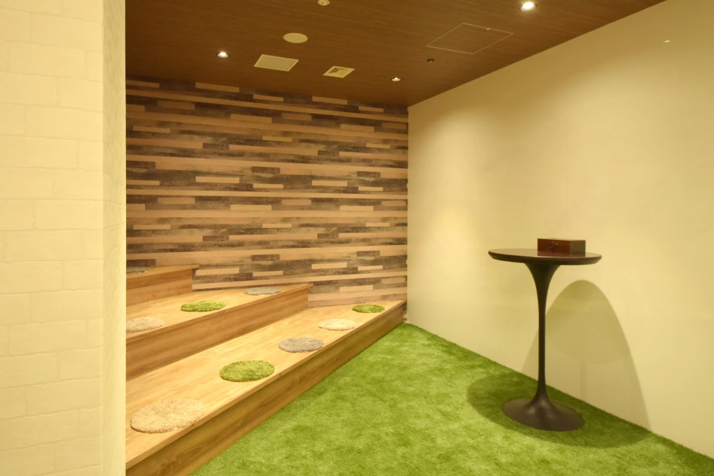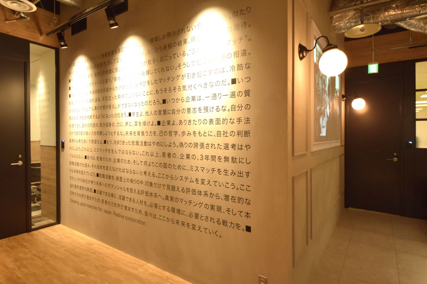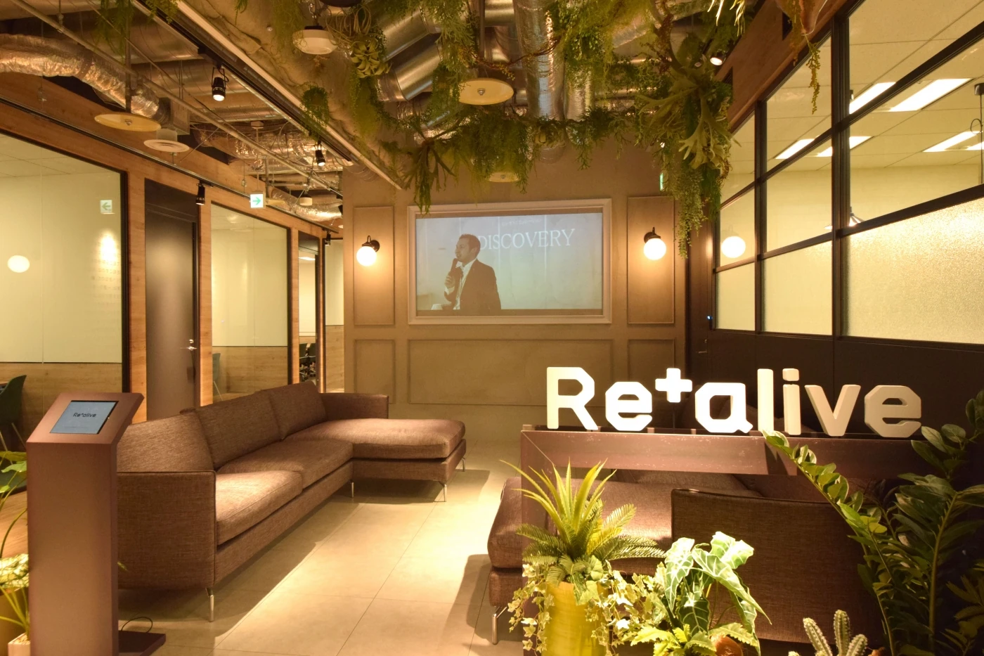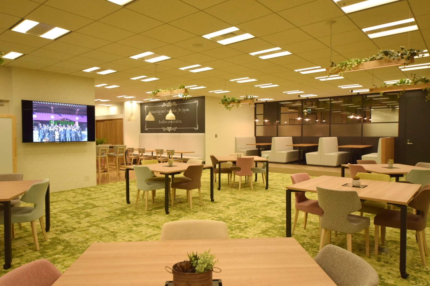リアライブ様のスマートで大人なカッコよさと、チャレンジングな好奇心旺盛さをオフィス空間で表現しました。エントランスはスケルトン天井を施しライティングも少し暗めに、クラシックで落ち着いたイメージを、執務エリアは白と木目とグリーンを基調とした温もりの中に、家具の色使いで無邪気さを再現しています。社員の皆様に更に楽しく働いていただけるよう、執務エリアにはカフェスペースや集中スペース、壁一面にホワイトボードを施したブレストルームを設けました。来客スペースと執務スペースでメリハリをつけた2面性のあるオフィスとなりました。