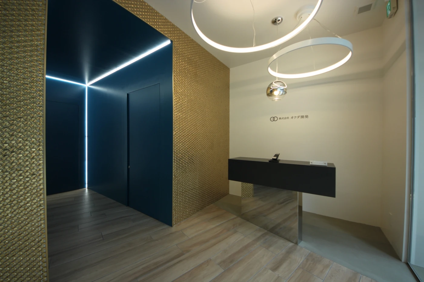 通りに面した1Fというロケーションを活かし、外観から高級感を感じられるようにエントランス空間はガラス面で開放的にデザインしています。壁面のゴールドの繊細なタイルが、外光を取り入れ上質な輝きに。シンボリックなブルーの通路には、奥に繋がる空間に導かれるように間接照明を施しました。さらに、サインを設置した壁面の頭上にあるペンダント照明は、オクダ開発さまのロゴマークをイメージさせます。細やかなこだわりをバランスよく詰め込んだ空間は、まさにSpecialに溢れたデザイナーズオフィスとなりました。