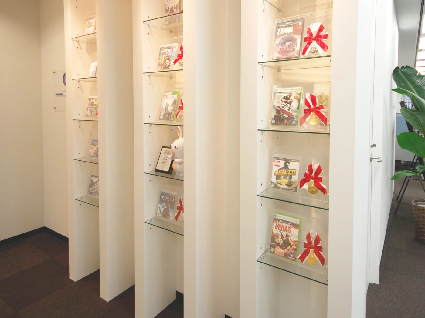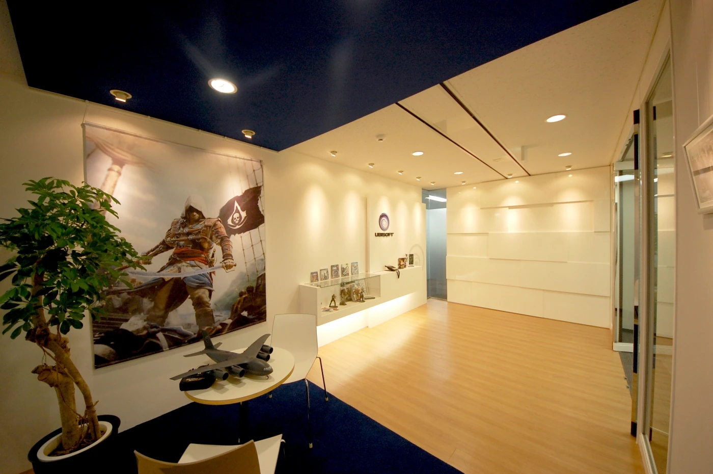 白を基調にした大きなロゴマークが印象的なエントランス。天井を一部造作し、コーポレートカラーを意識した配色にしました。ショーケースには自社制作のゲームソフトを展示できるスペースを設けました。執務室の中に入るとゲームに登場するキャラクターの等身大人形がお出迎え。会議室への動線にしっかり配置しました。