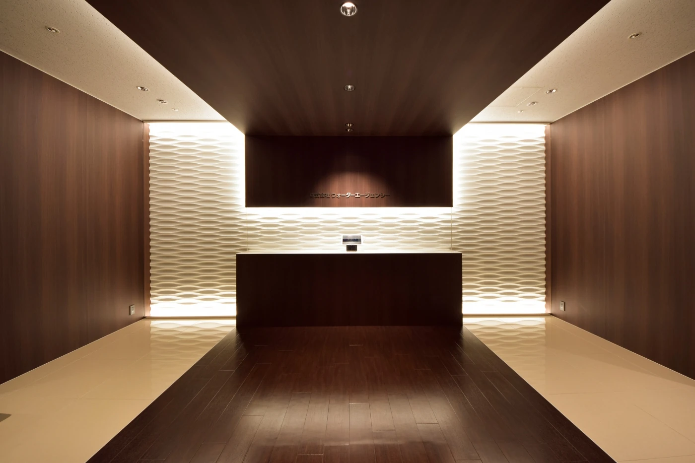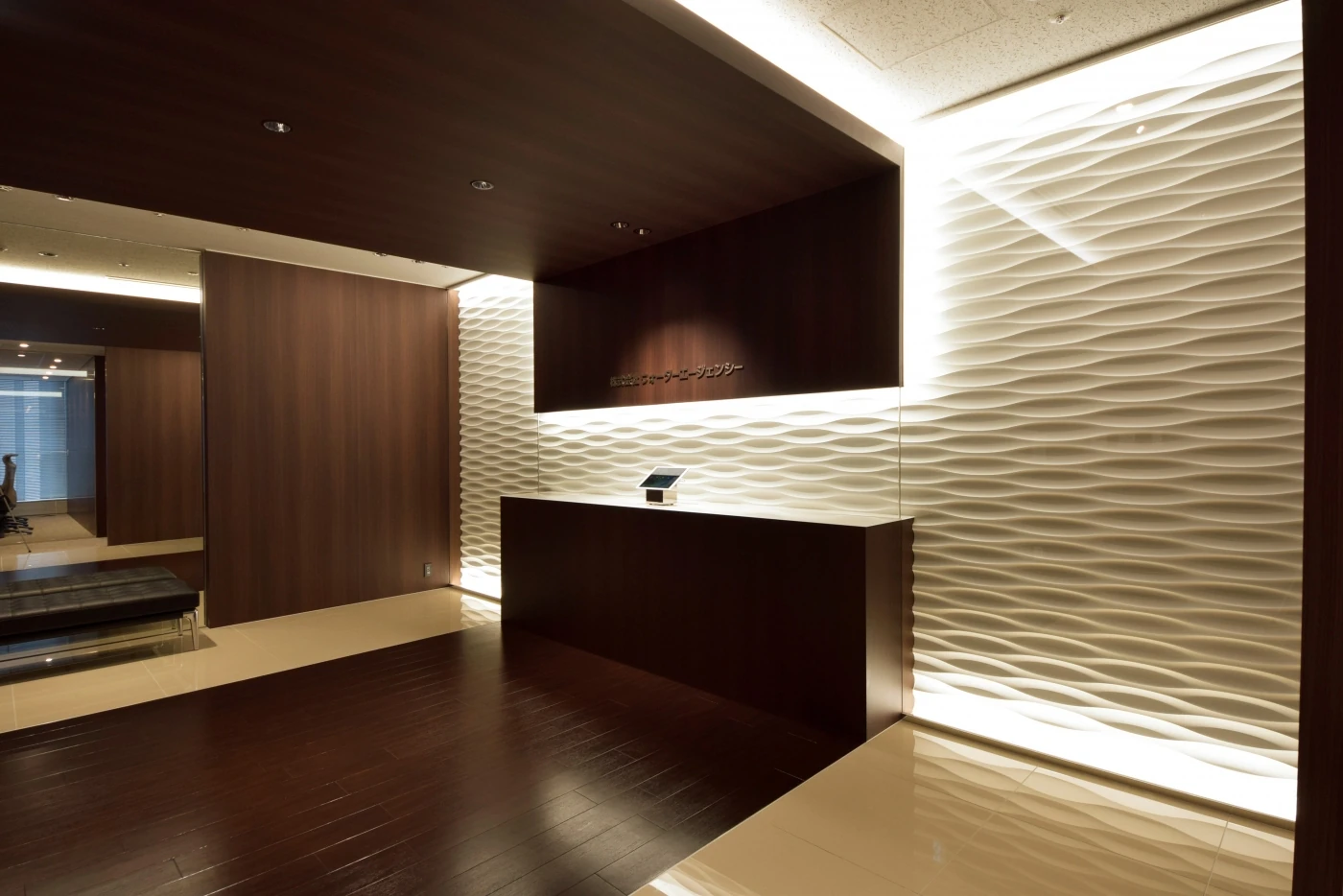 エントランスは天井と床の木目を合わせ、左右の壁面のガラスとミラーも左右対称になる様に計画し、シンメトリーによる視覚的な安心感と信頼性の向上を狙いました。正面の壁面には波形を想起させるリブ材を用い、さりげなくCIを演出しています。