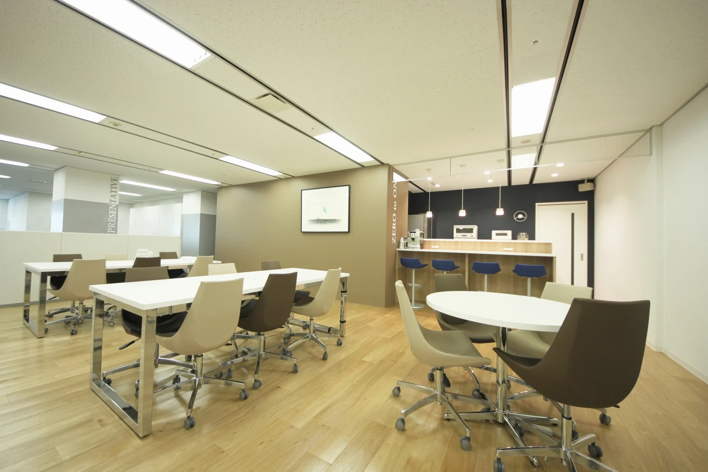 「こんな会社で働きたいと思って貰える空間にしたい」、「社内のメンバーが快適に働ける環境を作りたい」。そんな想いのもと、お客様と2人3脚でオフィスを創り上げました。エントランスや会議室は、幅広い年齢層、業種の来客者の方々に、信頼感や親しみやすさを感じてもらえるよう、白と木目を基調に空間を構成しました。社内スペースには執務スペースの周辺にフリースペースや、カフェカウンタースペースを設ける事で、多目的な運用、偶発的なコミュニケーションを促す、”オンオフ”をお客様自ら選択し、働けるオフィス環境となりました。