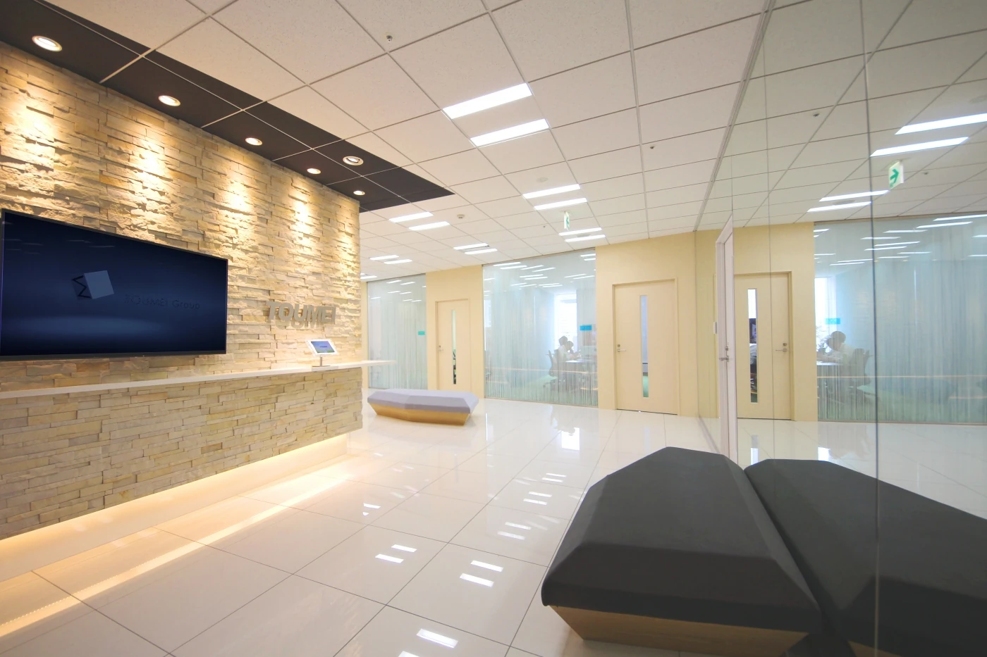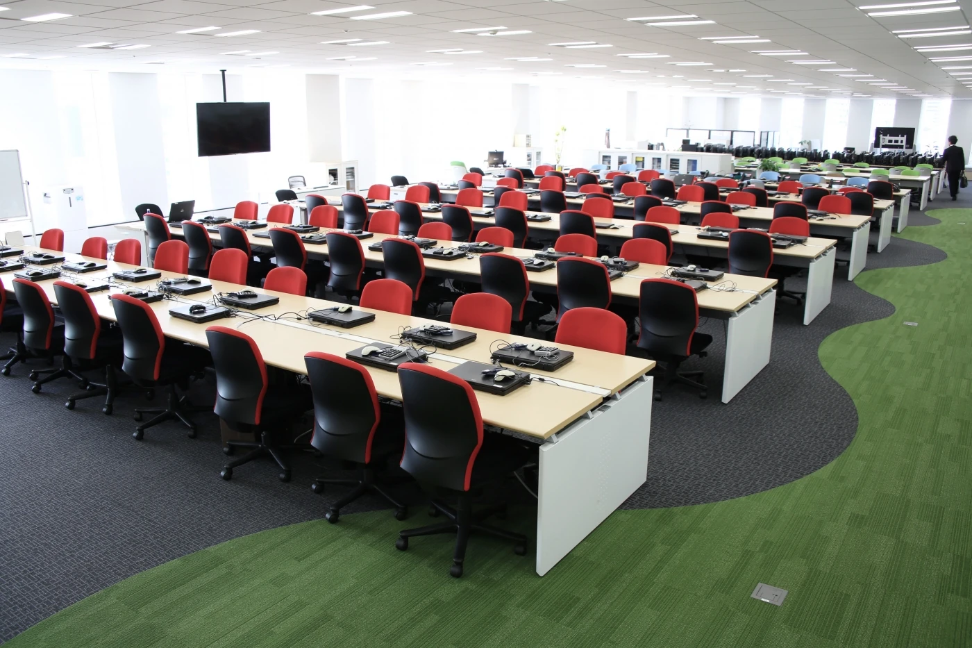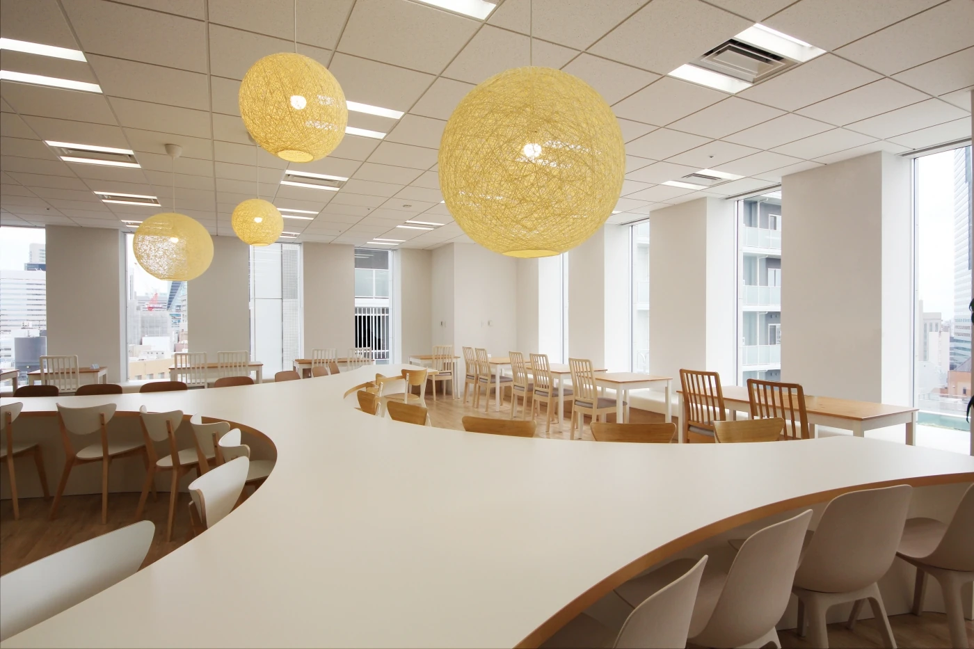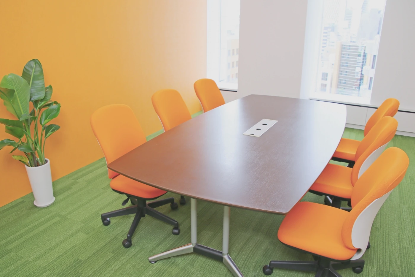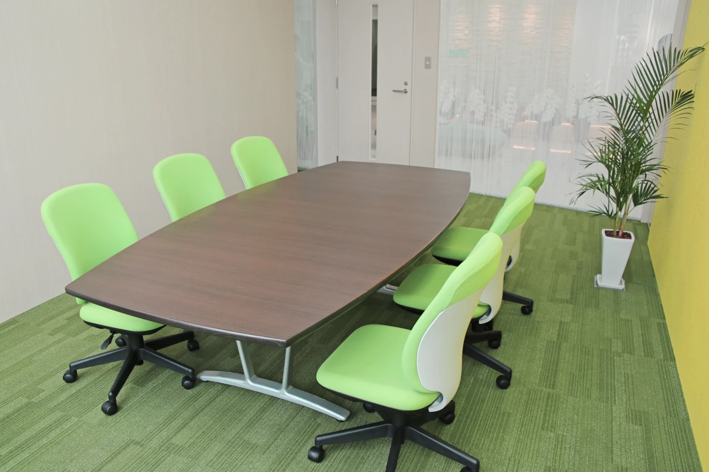 エントランスは壁面にガラスを多用し、床には白いタイルを施す事で空間全体を明るい雰囲気にし、あわせて壁のタイルや木目の色合いも明るい色調でセレクト。一方では、天井を黒色に塗装することで、空間を引き締めてメリハリを表現しました。会議室は部屋ごとに壁紙の色を分けてイメージに違いを表したり、ワークスペースには有機的なデザインのグリーンカーペットを敷きシンプルながらも動きのあるデザインに仕上げたりと、オフィス全体にこだわりのデザインを取り入れています。また、リフレッシュスペースには大人数で座れる造作テーブルを配置し、暖かみのある空間づくりを。透明性と明るさのある開放的なオフィス空間になりました。