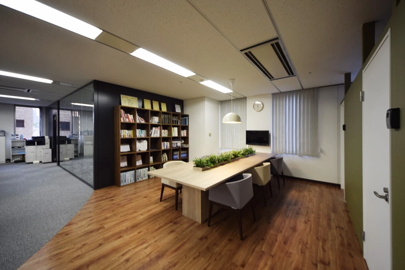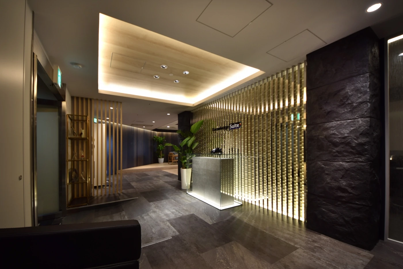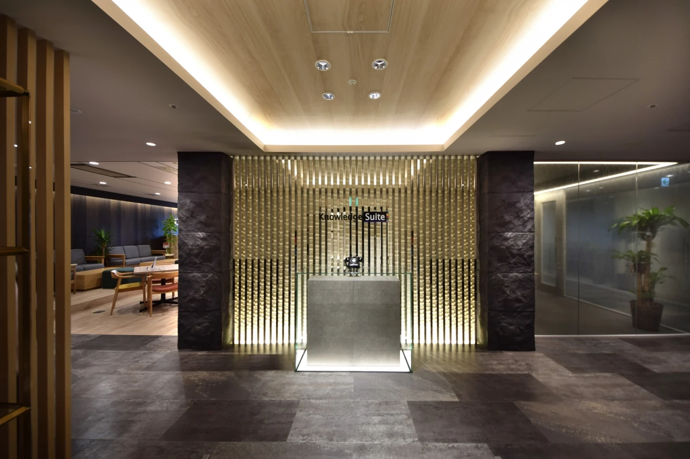 日本の企業が成長していく過程を想起させる和モダンをベースとしたデザインに、「起承“展“結」をキーワードとした働き方改革を推進していくため、多くの必要機能が実装されているワークスペースを構成しました。エントランスは素材や間接照明など意匠性の高いデザインで訪れる方をお出迎えし、高級感や信頼感を与えます。ワークスペースには社員間のコミュニケーションの場や新しいアイデアが生まれる場としてワークラウンジやコラボレーションブースを設けました。また、企業と企業、人と人を結ぶ場としてセミナースペースを充実させ、全社ミーティングだけでなく、採用セミナーや勉強会など、シナジーが生まれる場となっております。