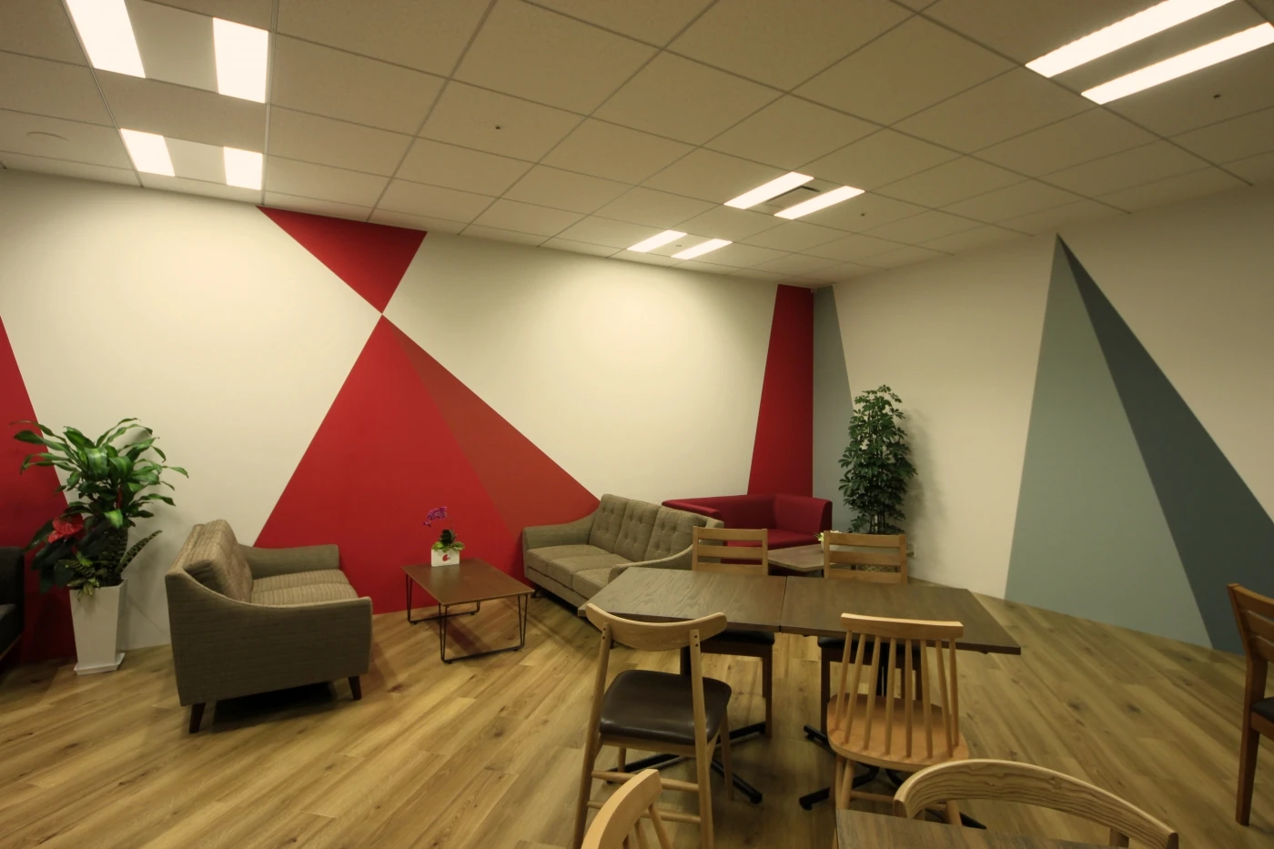 ビルの高層階というロケーションを活かし、エントランスのアプローチは敢えてロートーンな照明演出をおこない、奥の待合に進むと大きな窓から入り込む太陽光や絶景を臨める、サプライズが隠れた来客エリアとなっています。壁面もタイルと木目をバランスよく配分し、重厚感と高級感を表現しながらも、どこかアーバンでスタイリッシュさも感じられるデザインです。そんな来客エリアとはうって変わって、社内用フリースペースはカラーも明るく、カジュアルでエッジの効いたオフィスデザインで、企業風土を表す空間となりました。