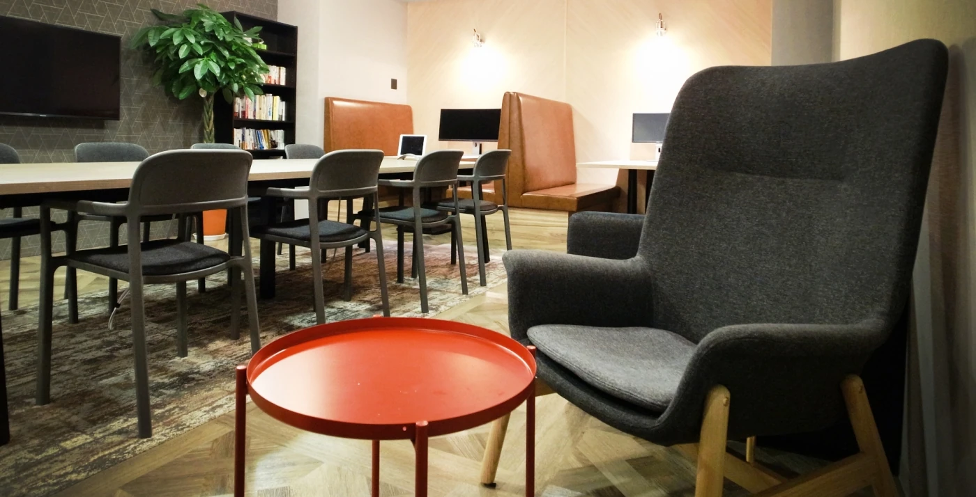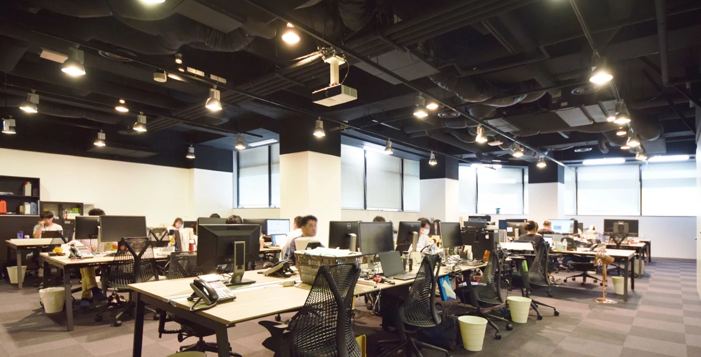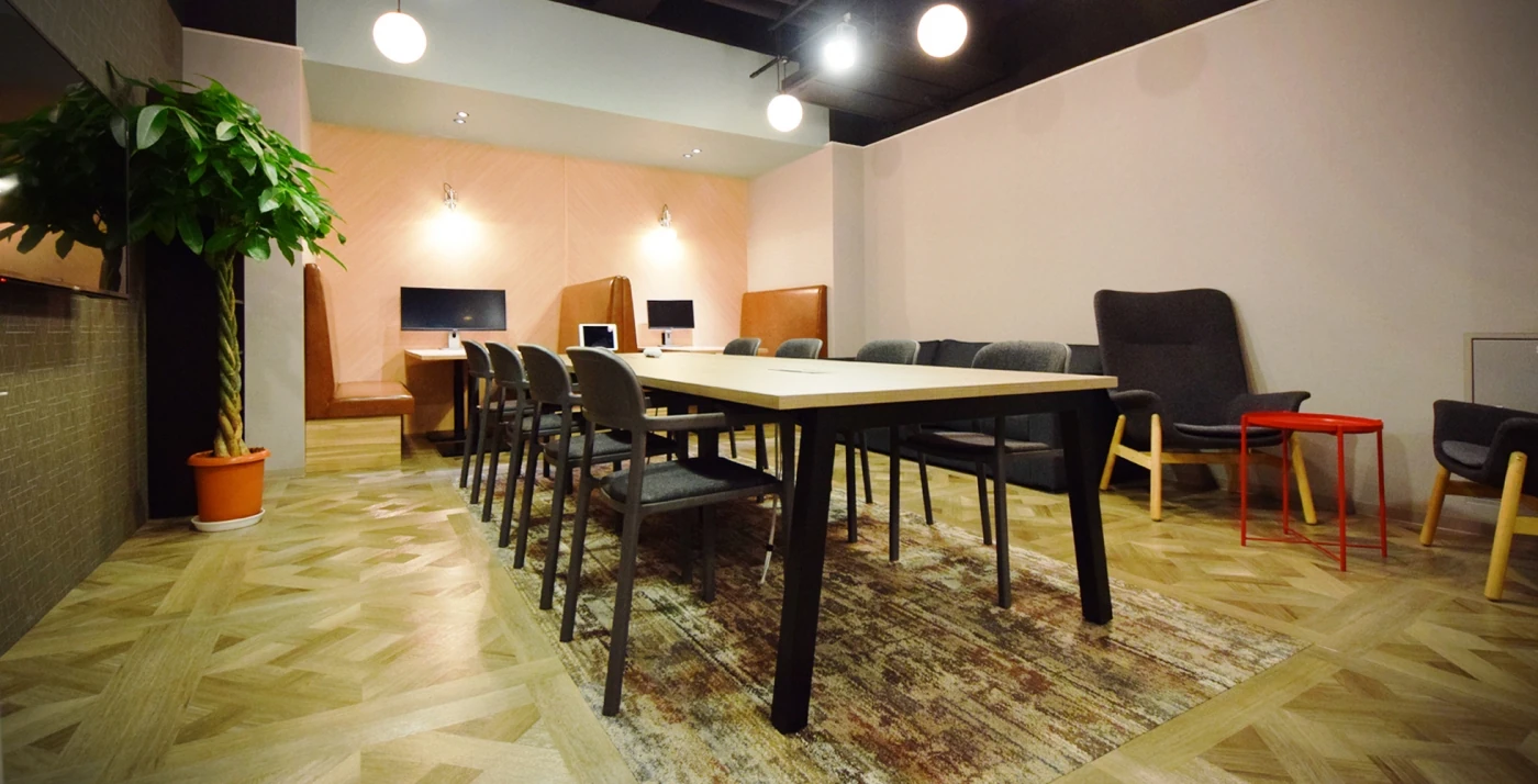 フリースペースはパーケットの床材を敷き、少し照度を落とすことで、カジュアルで居心地の良い空間に。スケルトン天のため、解放感がありスタッフの皆さまが気持ちよく働いて頂けるデザイナーズオフィスとなりました。