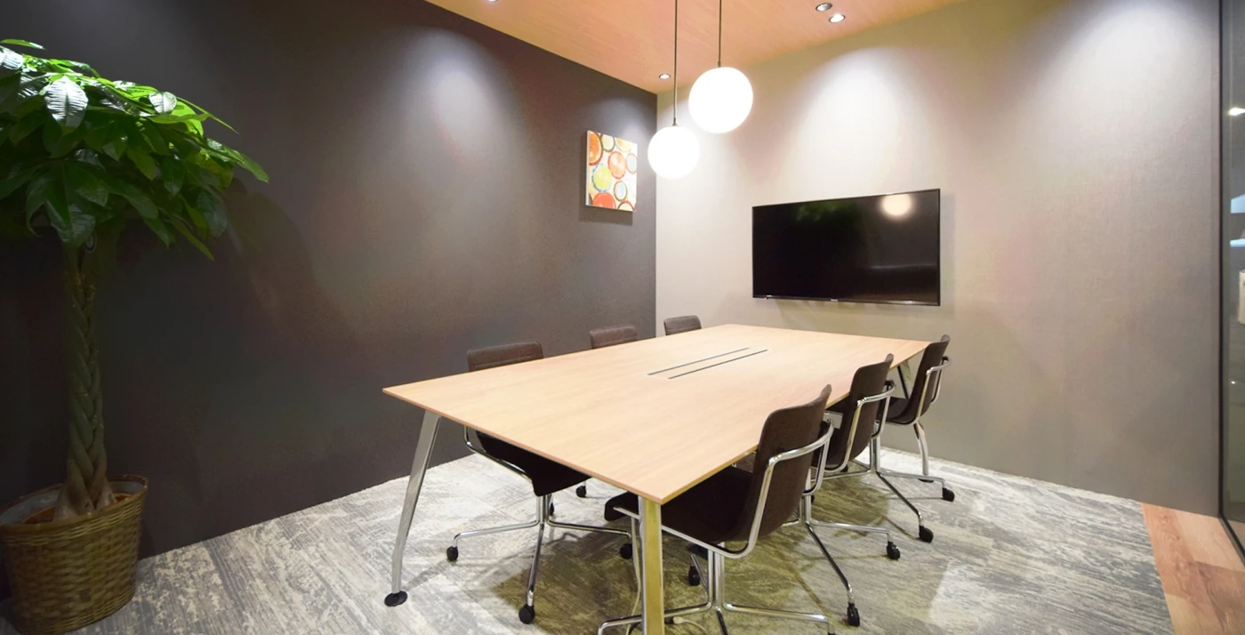 スタイリッシュで落ち着いた空間のエントランスには、特徴的な受付iPad台と、ブラックフレームのガラス張りの会議室が調和し、全体的に洗練されながらも木目を取り入れた柔らかい空間デザインです。
