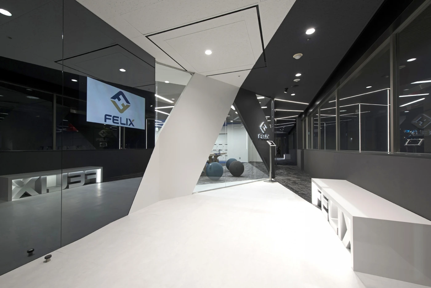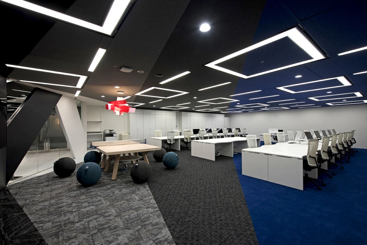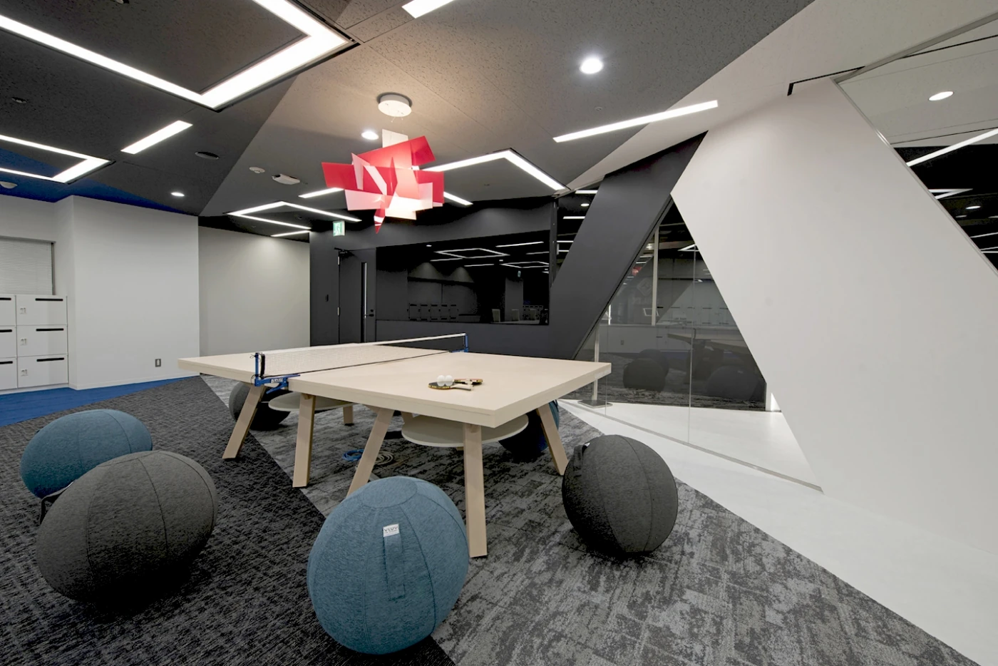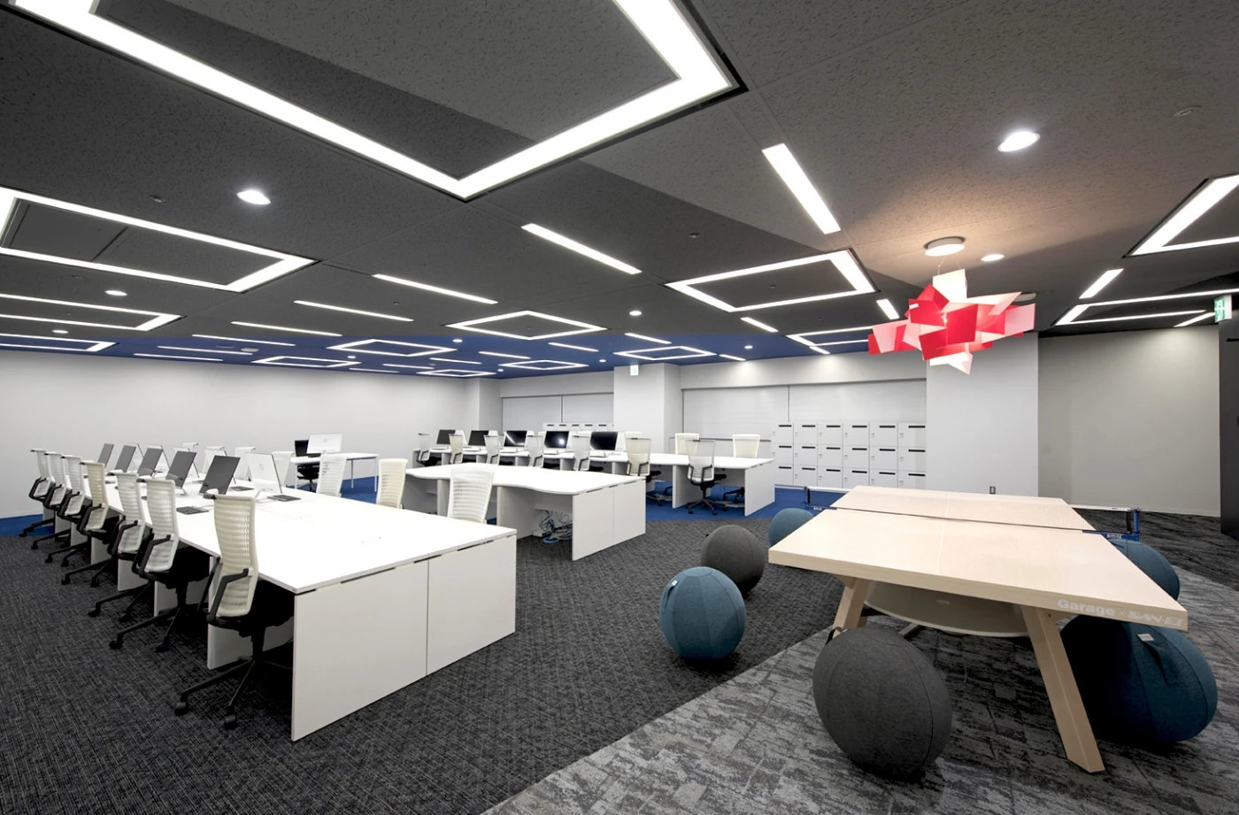 更なる成長を求め、新社名に変更となるタイミングでのオフィス拡張プロジェクト。業界に大きなインパクトを与え、メンバーにやりがいと幸せをもたらす決意を新しいオフィスに込めました。エントランスはブラックガラスとミラー、LED照明で演出された上質なモノトーン。床から壁、天井まで斜めに切れ上がっていくデザインが同社の持つスピード感と成長性を感じさせます。エントランスから眺めることが出来るワークスペースには、ミーティングテーブルとしても使用出来る卓球台にバランスボールのスポーツMIX。社内コミュニケーションの活性化、リクルーティングのトピックスとしても活躍しており、デザインの軸である『革新性と遊び心』が表現されています。