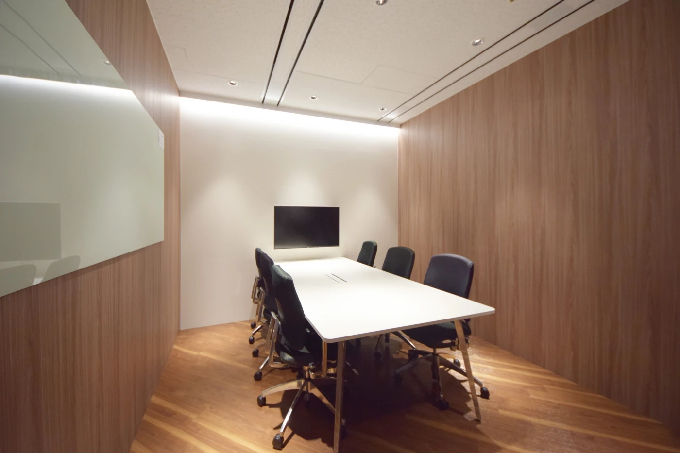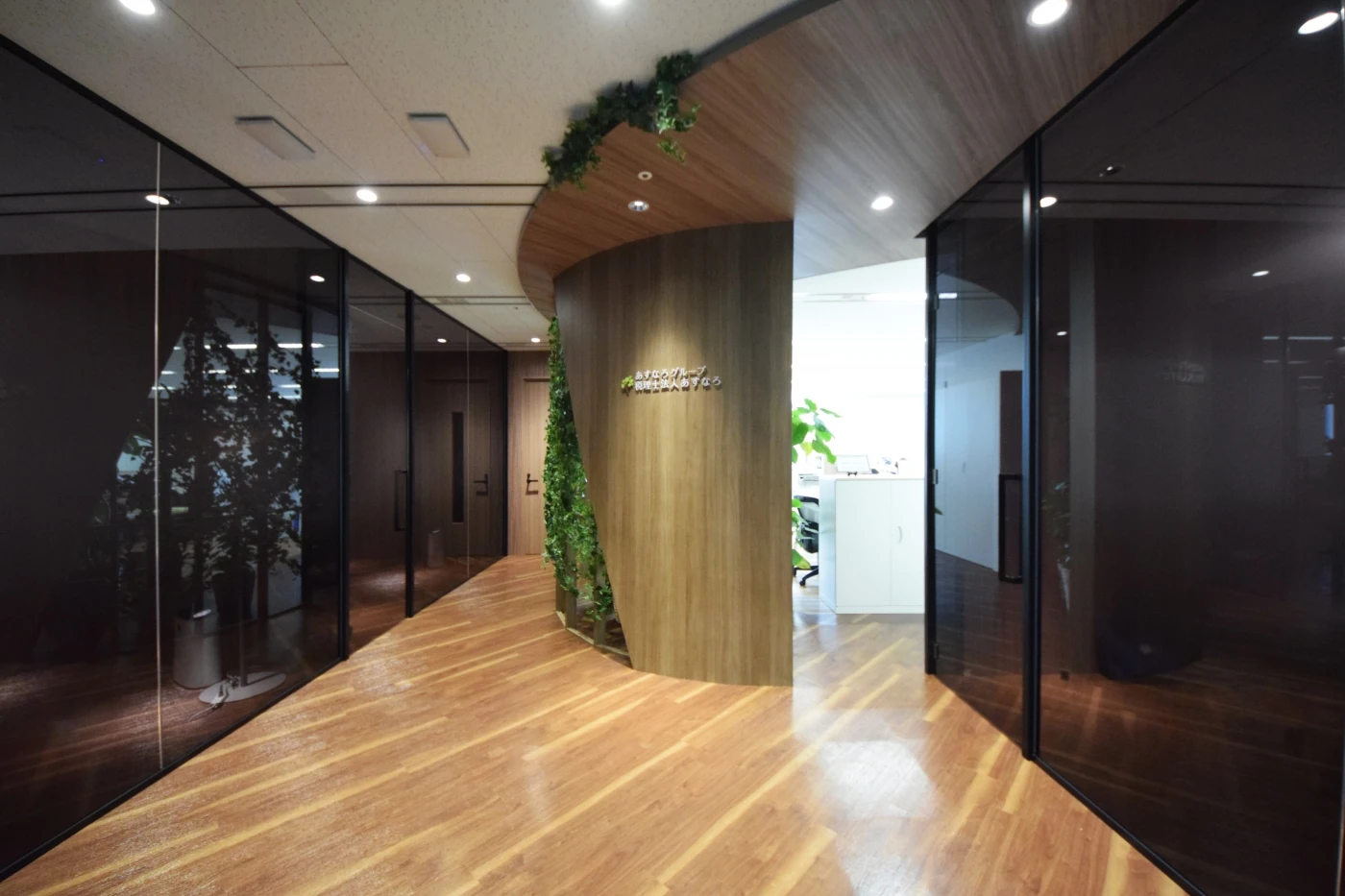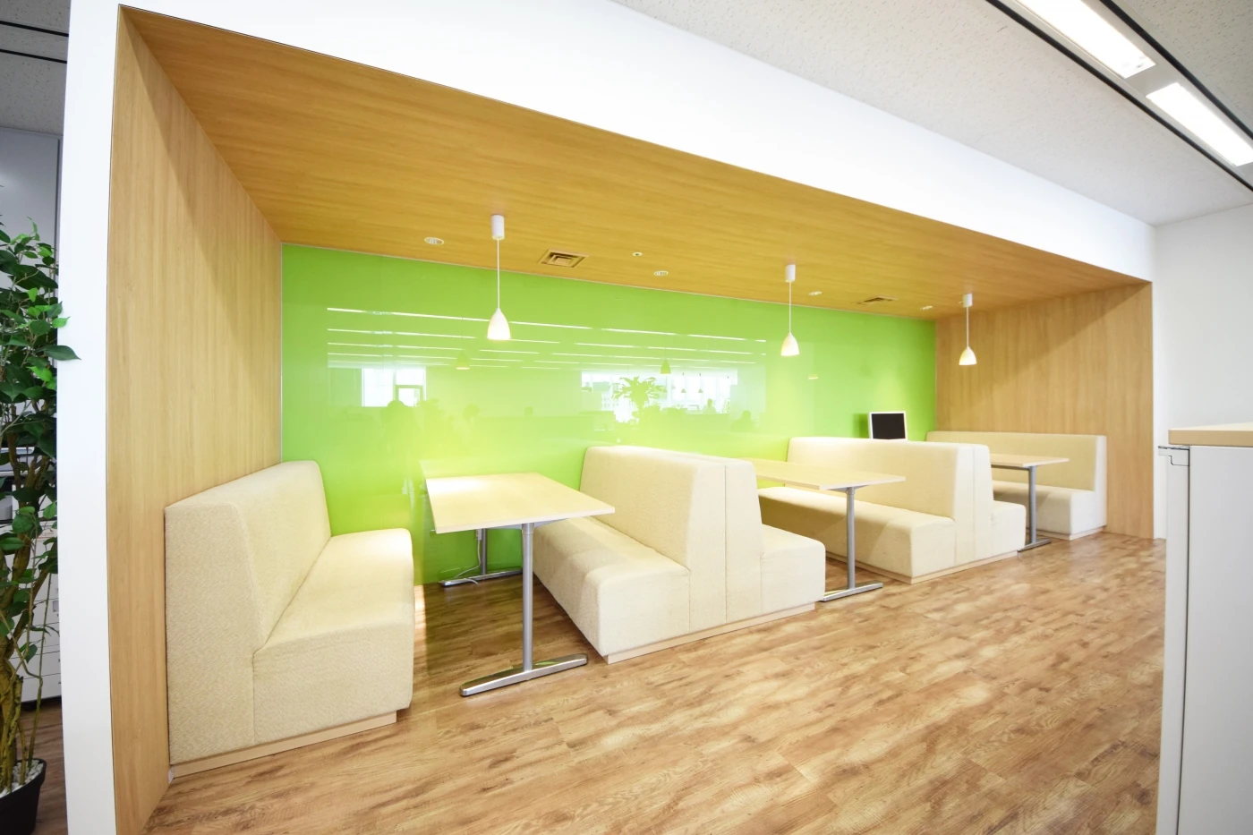 落ち着いた木調を基調とし、温もりのあるエントランスを演出しました。会議室はガラスで間仕切りをし、開放感を出しつつ、大事な会議も行えるようグラデーションシートを貼り、プライバシーも確保しております。執務スペースへと続く動線は完全に仕切らず、色々なお客様をお出迎えするオープンな雰囲気を感じさせます。同時に、黒のスチールやシックな色のガラスシートを併用し、信頼感を感じるデザインとしております。ワークスペース内にもカフェスペースやファミレスブースなどを設け、働く場所を選べるレイアウトとしました。ファミレスブースのグリーンのカラーガラスはコーポレートカラーを彷彿させ、明るく爽やかな印象を与えます。