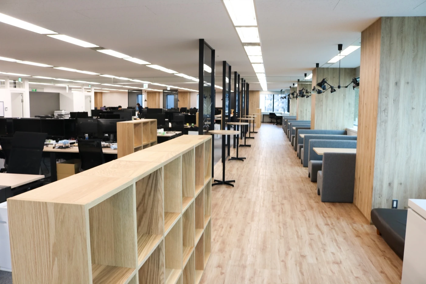 代表の社員の皆様を大切にする想いをカタチにするべく、チームを超えたコミュニケーションを誘発させ、社員全員が快適に仕事ができるような居心地の良さをシェアできる空間を目指しました。グッドな景観を共有できるよう窓側にコラボレーションスペースとして、ソファスタイルの打合せスペースやスタンディングMTG、ドライパントリーコーナーを設けました。木目調とグレー・ブラックの色調でシンプルにまとめたワークスペースは仕事にしっかりと取り組める快適空間です。来客エリアは、簡易ミーティングやセミナー等にも対応できるよう動かしやすい什器で構成しました。社員皆んなでShare(シェア)する快適オフィスの完成です。