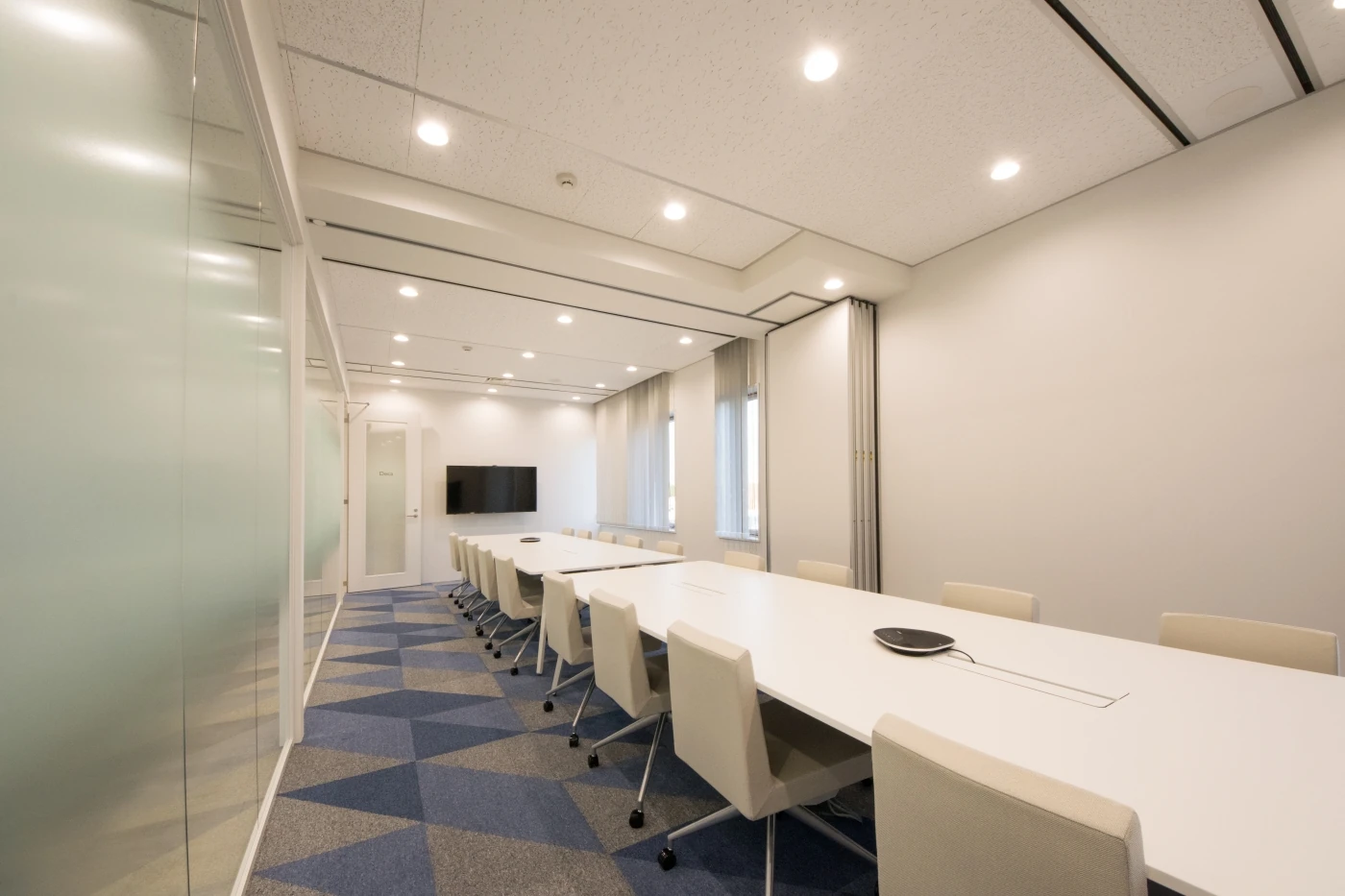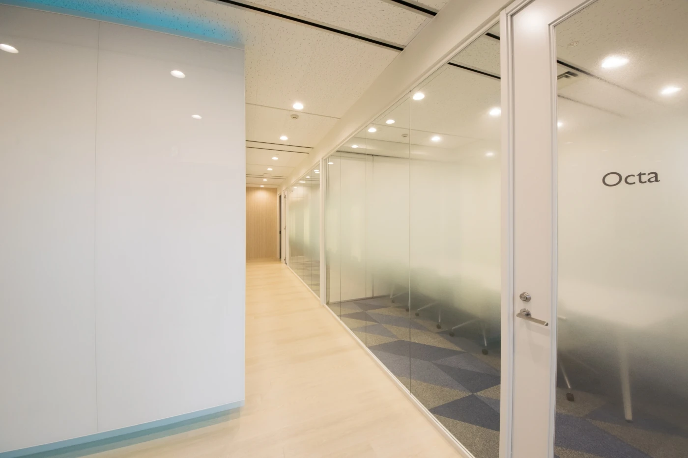 自然光の入る温かみのある空間にロゴの色調を加えて企業イメージを反映し、更なるステップアップを感じさせるオフィス作りのお手伝いをさせていただきました。エントランスにはカラーガラスと大画面モニターを設置し、ドローン事業という先進性をご来社されたお客様に感じていただけるような空間としています。ブランディングを意識し、会議室の床はロゴカラーを用いた幾何学模様に貼り替えました。ワークスペースは床や壁面に木目を使用し自然光と合わせて温かみのあるスペースにし、社員同士のコミュニケーションが活発になるような家具を配置しました。ビルの最上階という眺望を生かし、できるだけ間仕切りを立てず空間のつながり、広さを感じられるよう意識しています。