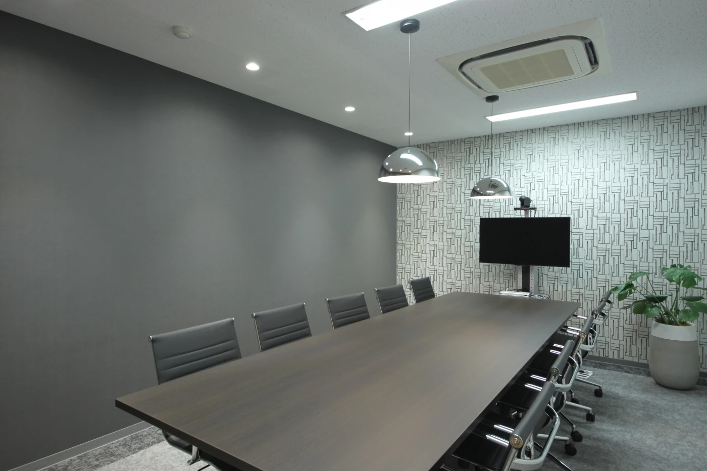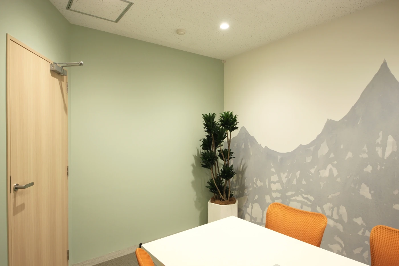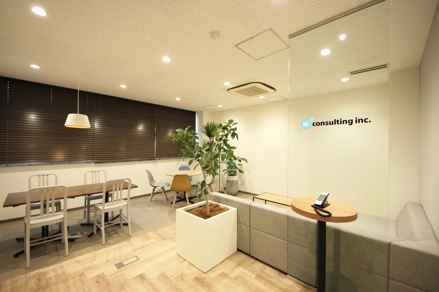 「社員に自由に快適に働いてほしい」という代表の想いから"My places"というコンセプトをつくり、各々が心地よいと感じられる空間を選択できるようなオフィス空間を目指しました。エントランスは閉塞感を感じさせないように床にリズムをつけ、ガラスや植栽で解放感を演出しました。全体的にカジュアルで明るいカフェのような開放的な雰囲気にしております。2つの会議室は、クロスのデザインで都会的な雰囲気と明るく開放的な自然を感じられる雰囲気と、対照的なお部屋に仕上げました。