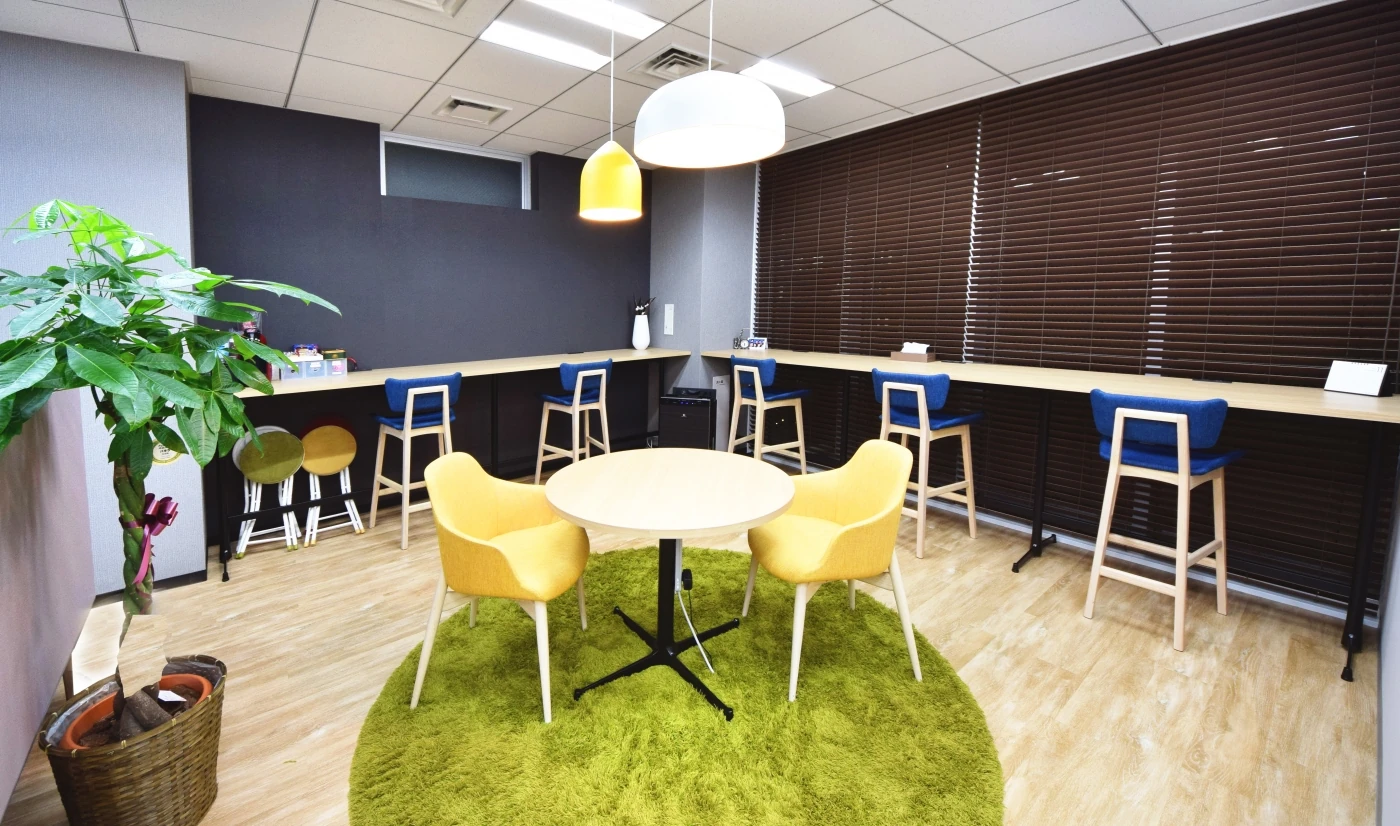 限られたスペースの中で、集中して働ける場と社員様の交流が図れる場をいかにレイアウトするかを意識しました。スペース効率を考えワークスペースとリフレッシュの床材をあえて同じにする事で全体的につながりと広がりを表現しています。リフレッシュスペースにはアクセントとしてラグとペンダントに差し色を入れる事で、空間自体にメリハリを持たせております。様々なマテリアルを使う事で各部屋にメリハリを出し、レイアウトでデザインをリンクさせた空間に仕上がっています。