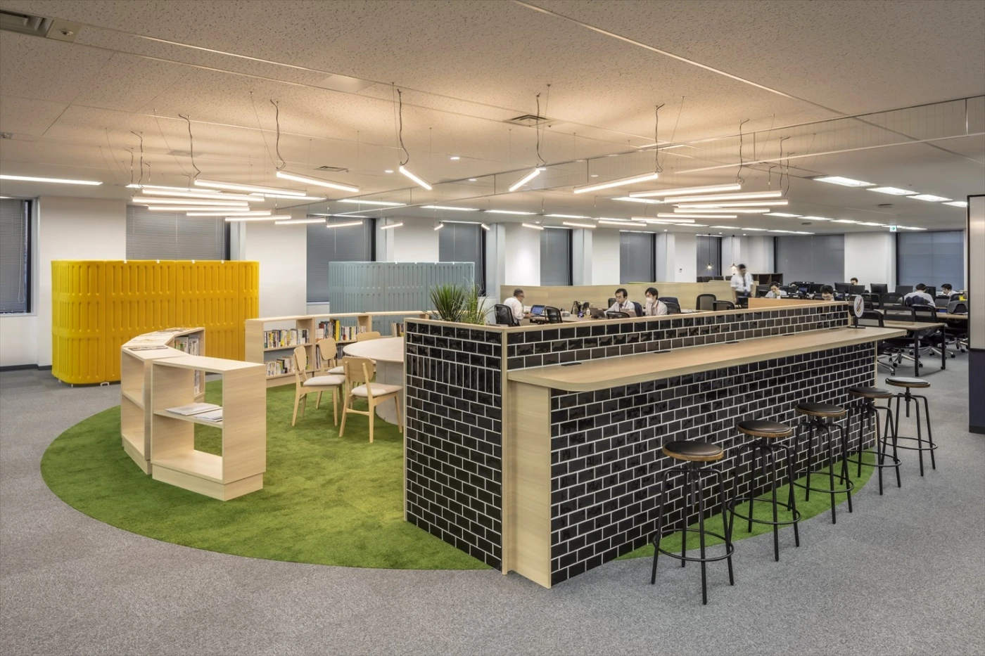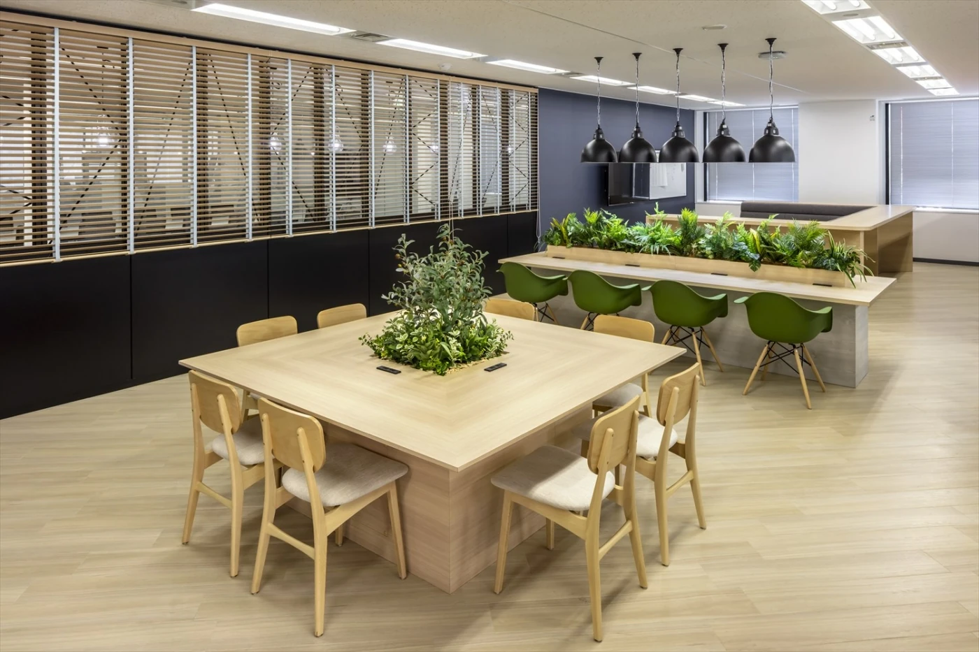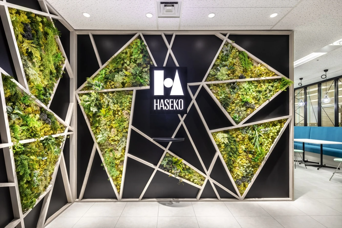 イノベーションの創出と、グループ全体の働き方改革の先駆けとなる、新たな部門のオフィスを開設するという本プロジェクト。「旅するオフィス」をコンセプトに、カフェテーブルやバーカウンター、大小のコの字ソファ、立ちミーティングスペース、集中カウンター等、ワーカーが自由に働き方を選べるオフィスを設計しました。ベースとなるワークデスクも可動式のフリーアドレスデスクを採用し、その配線もフレキシブルに動かせる仕組みを導入しています。エントランス正面のウォールグリーンは世界地図をモチーフにしたり、各エリアの植栽を地域別に分けたりと、デザイン面でも「旅」を意識しました。来客スペースには長谷工様のロゴマークを構成する四角・丸・三角をモチーフとしてさりげなく配置しました。