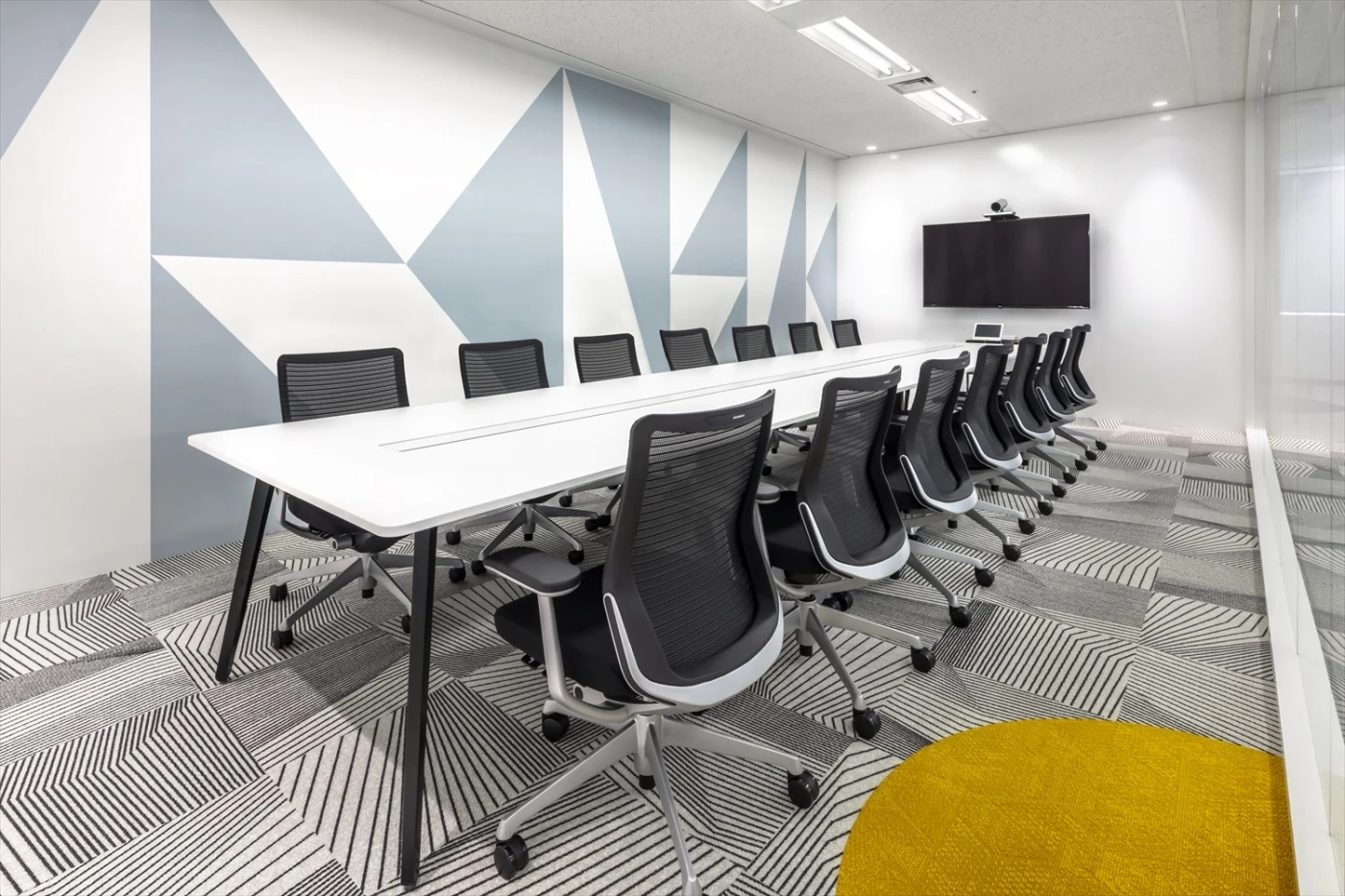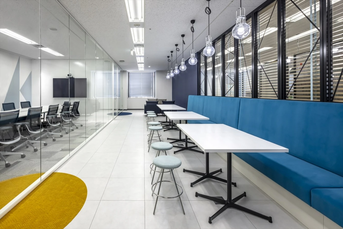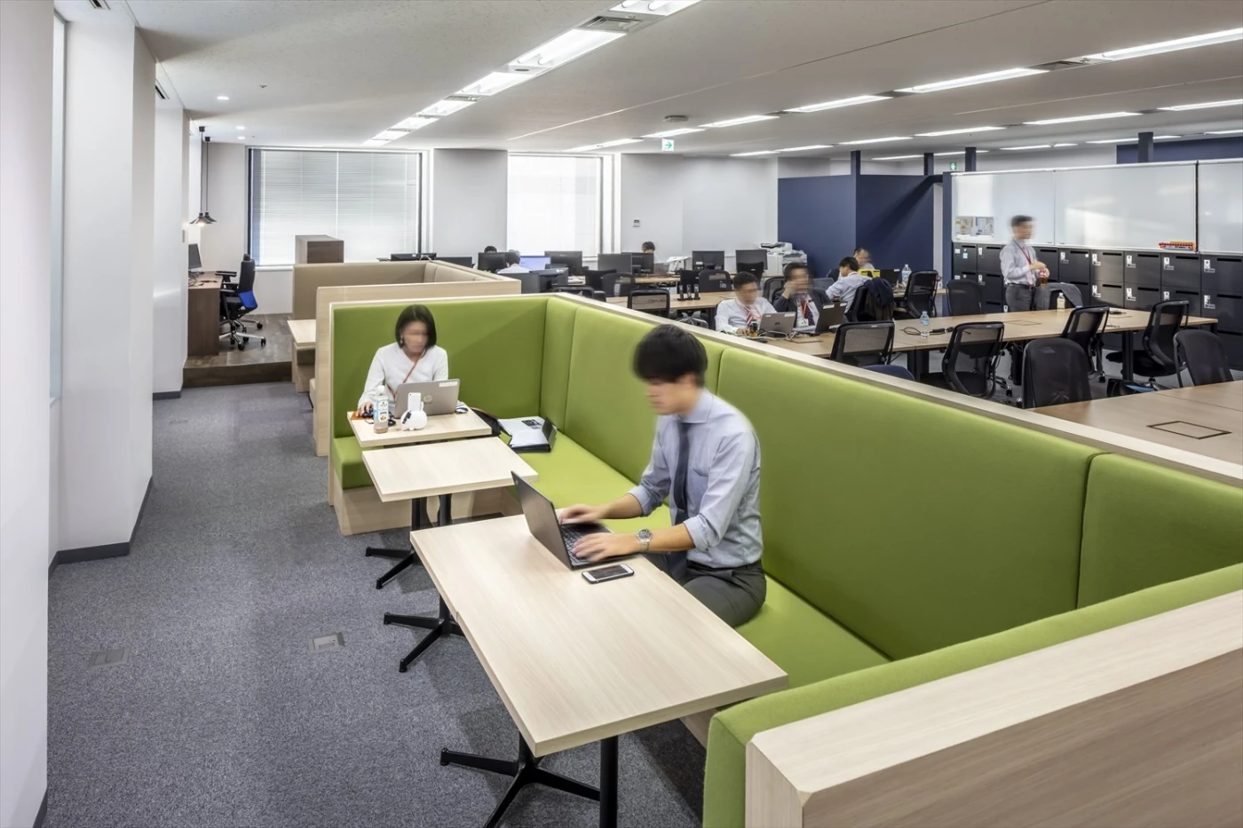 イノベーションの創出と、グループ全体の働き方改革の先駆けとなる、新たな部門のオフィスを開設するという本プロジェクト。「旅するオフィス」をコンセプトに、カフェテーブルやバーカウンター、大小のコの字ソファ、立ちミーティングスペース、集中カウンター等、ワーカーが自由に働き方を選べるオフィスを設計しました。ベースとなるワークデスクも可動式のフリーアドレスデスクを採用し、その配線もフレキシブルに動かせる仕組みを導入しています。エントランス正面のウォールグリーンは世界地図をモチーフにしたり、各エリアの植栽を地域別に分けたりと、デザイン面でも「旅」を意識しました。来客スペースには長谷工様のロゴマークを構成する四角・丸・三角をモチーフとしてさりげなく配置しました。