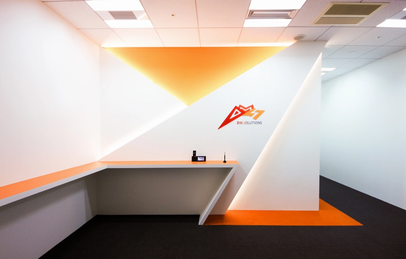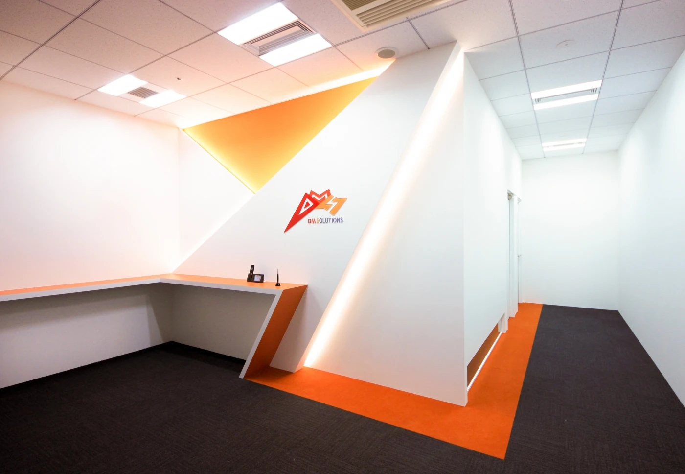 お客様をお出迎えするエントランスは白を基調とし、コーポレートカラーのオレンジと間接照明で社名を演出、床にも一部オレンジを取り入れました。エントランスに入った瞬間に成長中で勢いのあるディーエムソリューションズ様らしさを感じられる空間になっています。