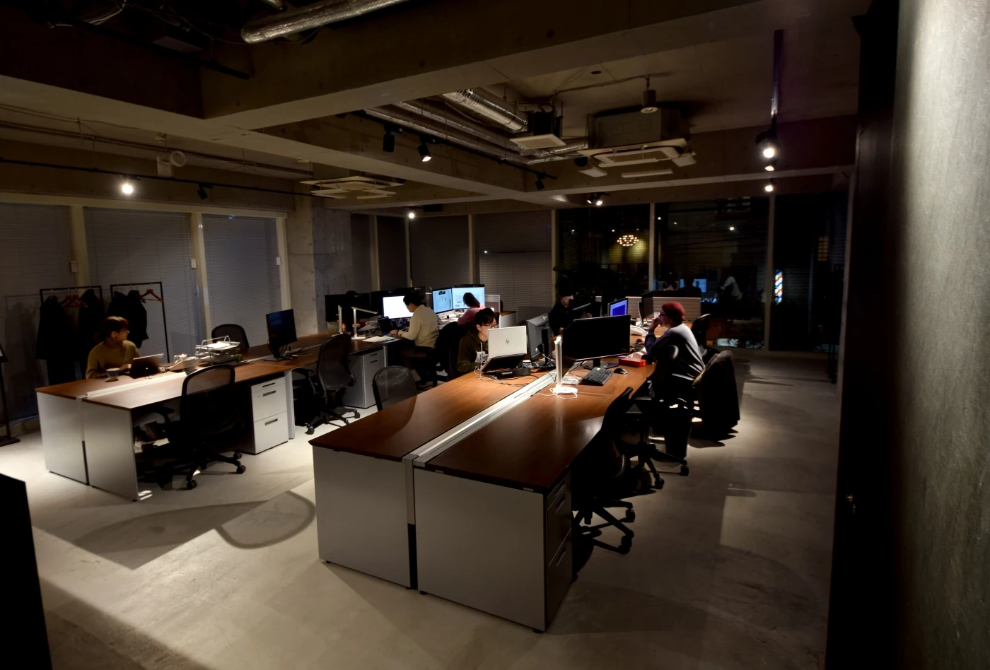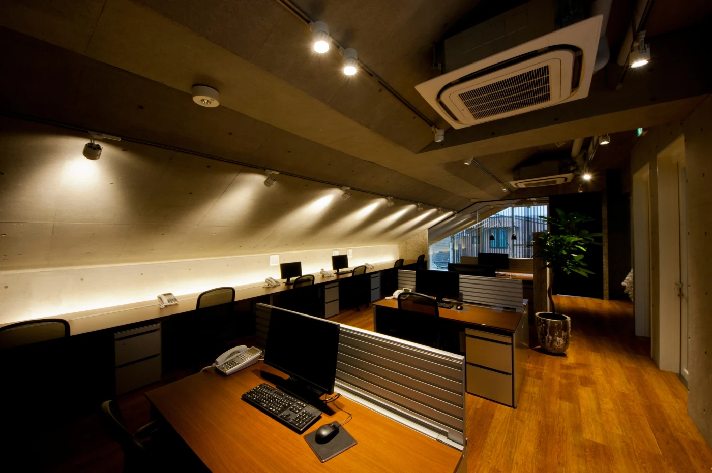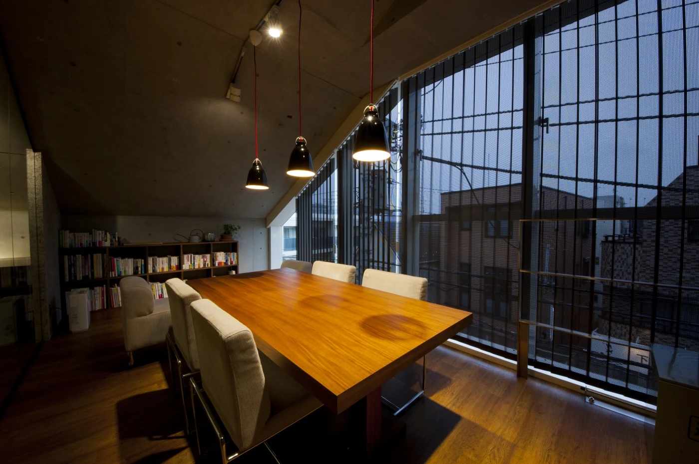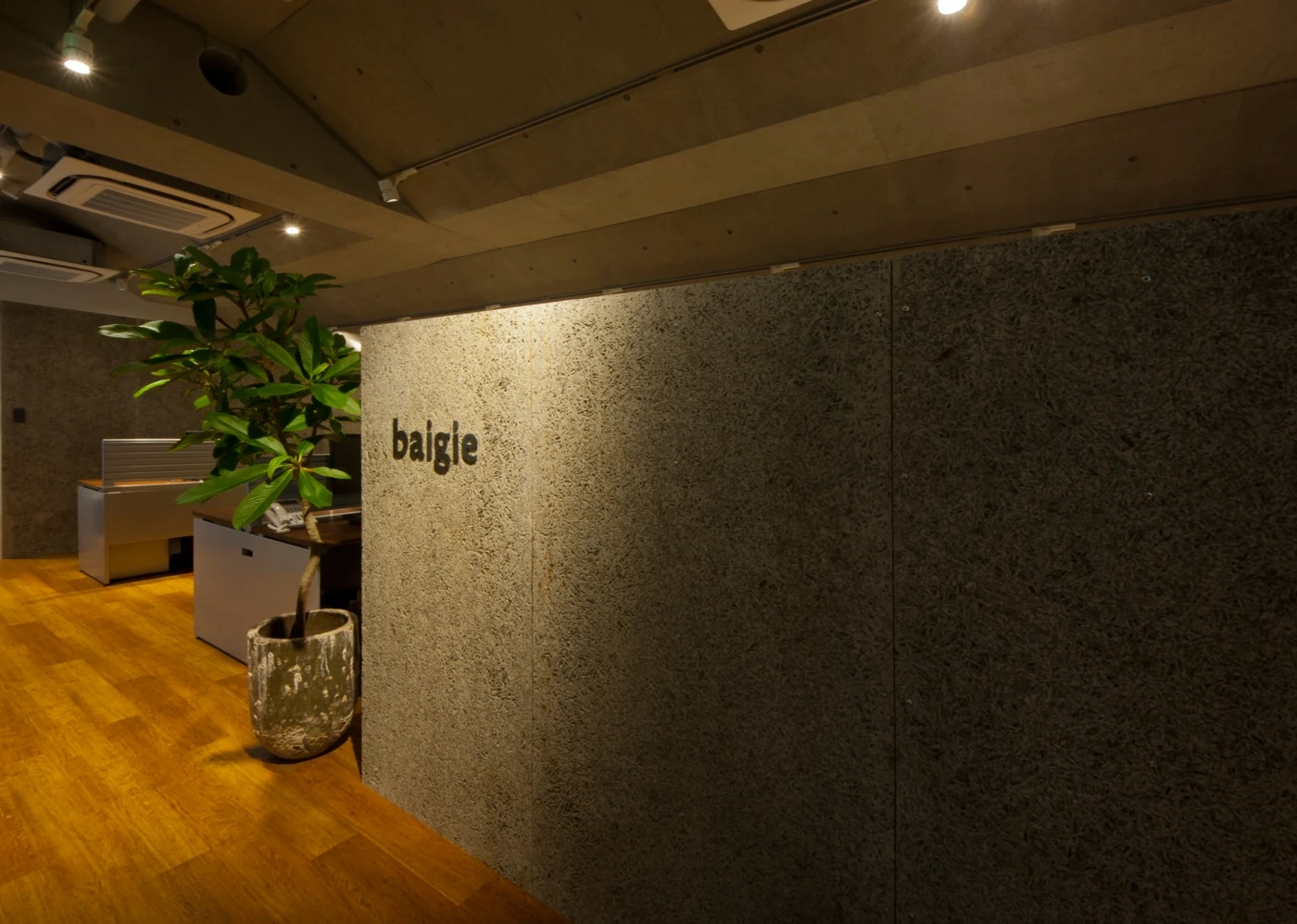 木毛セメント・黒・木目、最低限の色と素材をデフォルトとして、コンクリート打ちっぱなしの空間に施した3Fのオフィスと全体イメージを統一させ、さらにインテリアや家具にこだわり洗練された空間をデザインいたしました。ダイナミックな本棚で空間を仕切り、素材にこだわった家具のスペースでお客様をお迎えいたします。ワークスペースは、オフィスとしての機能をシンプルに持たせ、統一感のあるデザイナーズオフィスを作り上げました。