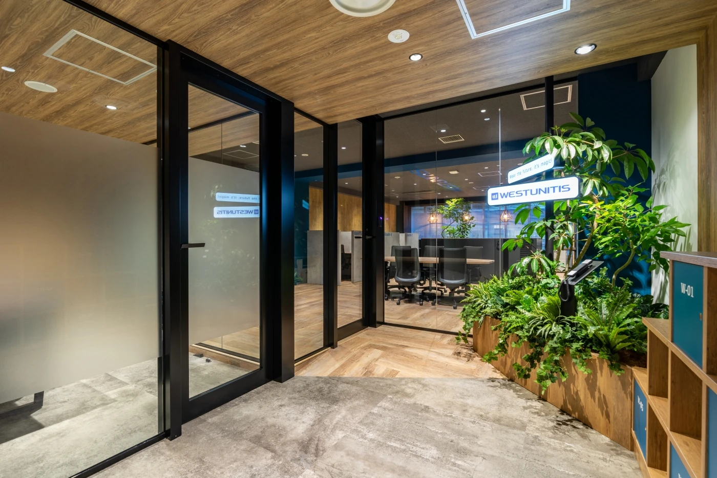 大阪本社に続き、東京オフィスのデザインをさせていただきました。大阪とはガラッと雰囲気を変え、ブラックを基調としながら少しくすみがかったスモーキーなカラーをバランスよく配色しています。来客エリアとワークスペースの間仕切りは全てガラスにし、エントランスに足を踏み入れた瞬間にオフィスの雰囲気を感じられるオープンな空間になっています。また、エントランスのサインはショップのような発光サインを採用し、インパクトのあるグリーンとも相性抜群です。ワークスペース内もオフィス什器はほとんど使用せず、まるで社外のカフェのように、リラックスと集中の両方が備わったセレクタブルオフィスが完成しました。