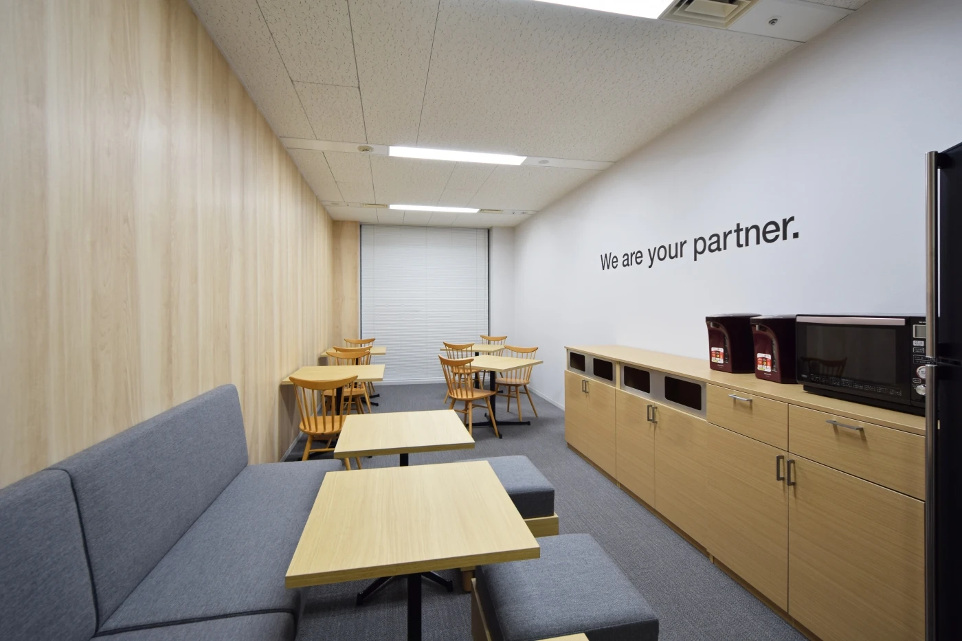 精緻且つ知的創造性の高い仕事を行っている会社様に相応しく、個人席は充分な広さと収納量を確保しながらローパーティションで仕切り、高度な集中を要する仕事に過不足ない空間を構築しました。一方、社内エリアの各所にはカフェ風のコワーキングエリアや、立ちミーティングやファミレスブース等の打合せスペース、ゆったりとくつろげる別室のリフレッシュルームを設け、ワーカー一人一人が自立しながら、気分や仕事内容に合わせて過ごせる場所を選択できる様に設計しました。