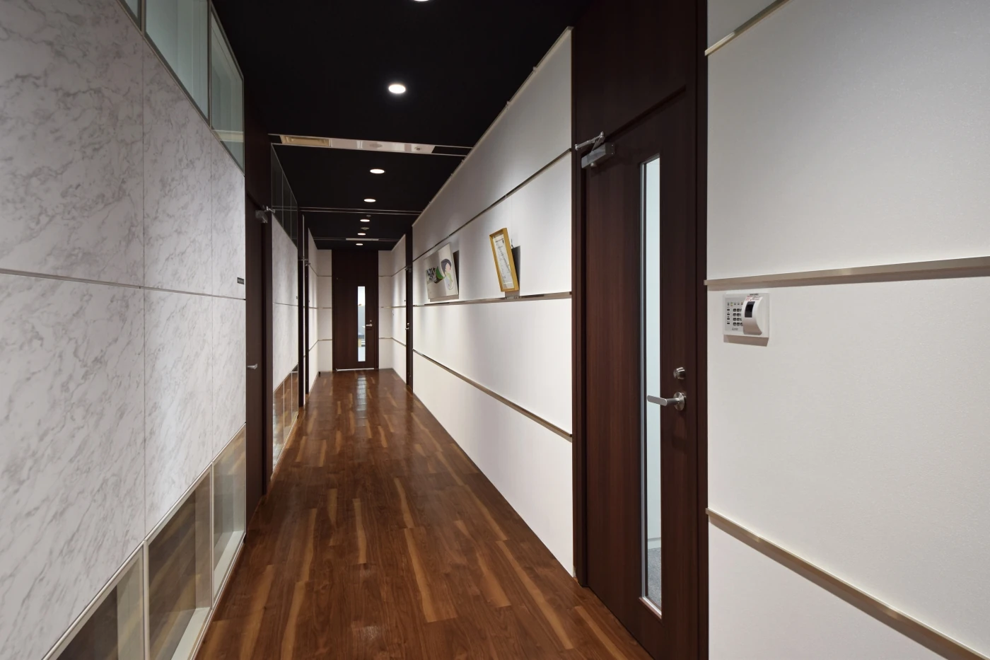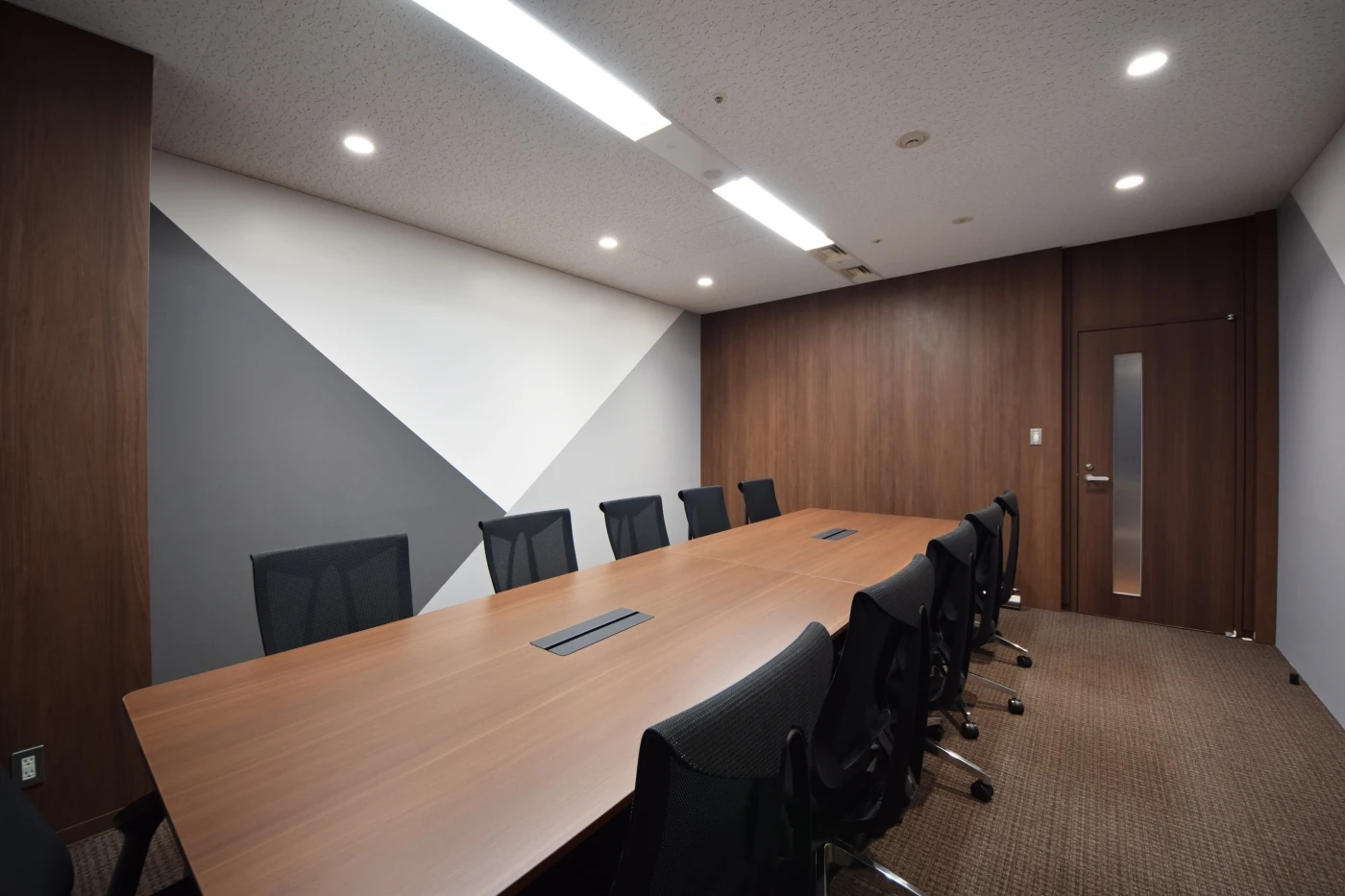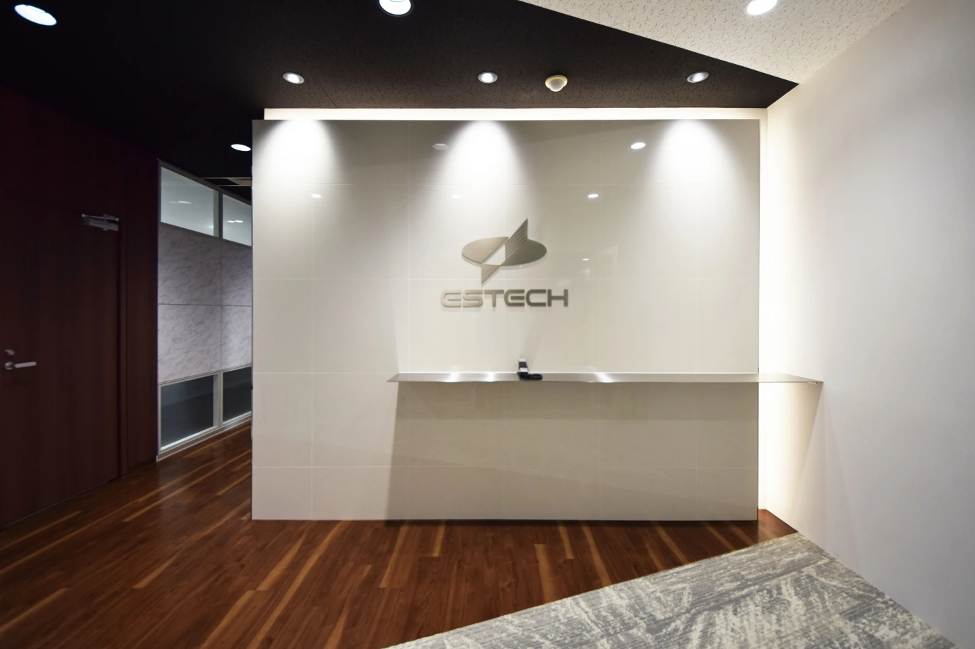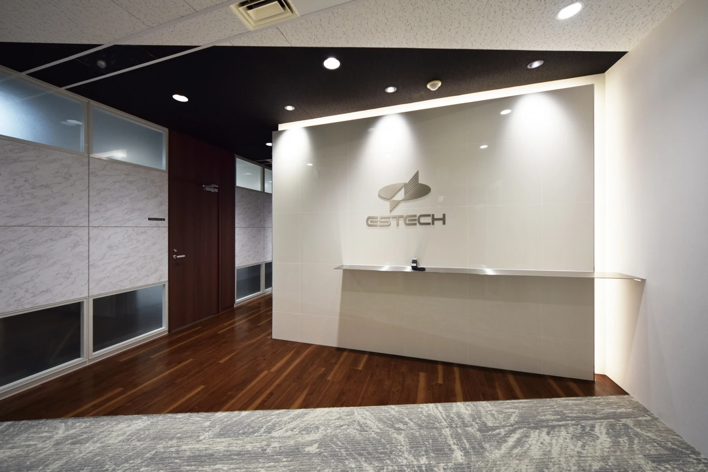 来客エリアのデザインは、高度な仕事を行う信頼性を体現する為に磁器タイルや大理石調、濃い木目等で重厚な雰囲気を創出し、コーポレートロゴのモチーフでもあるカッティングエッジ(最先端)をイメージして随所に斜めのフォルムを盛り込みました。