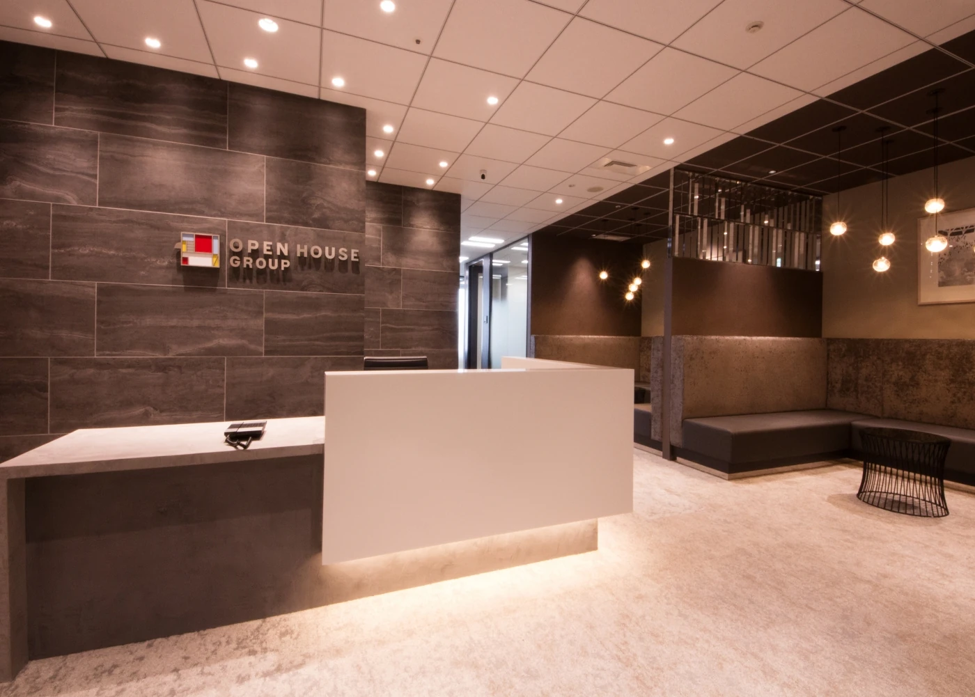 JR名古屋駅直結の新築ビルへのご移転プロジェクト。立地、品格、共にエリア最高グレードである建物にふさわしい“おもてなし”ができるよう、“modern hotel”をテーマに、空間をデザイン致しました。全体をホワイトとグレーを基調とした落ち着いたトーンで構成しながら、壁面のストーンタイル、有機的なパターンのフロア、カウンターのモルタル風塗装、空間に合わせたアートなど、素材やアクセントで変化をつけ、空間にグレード感を付加させました。