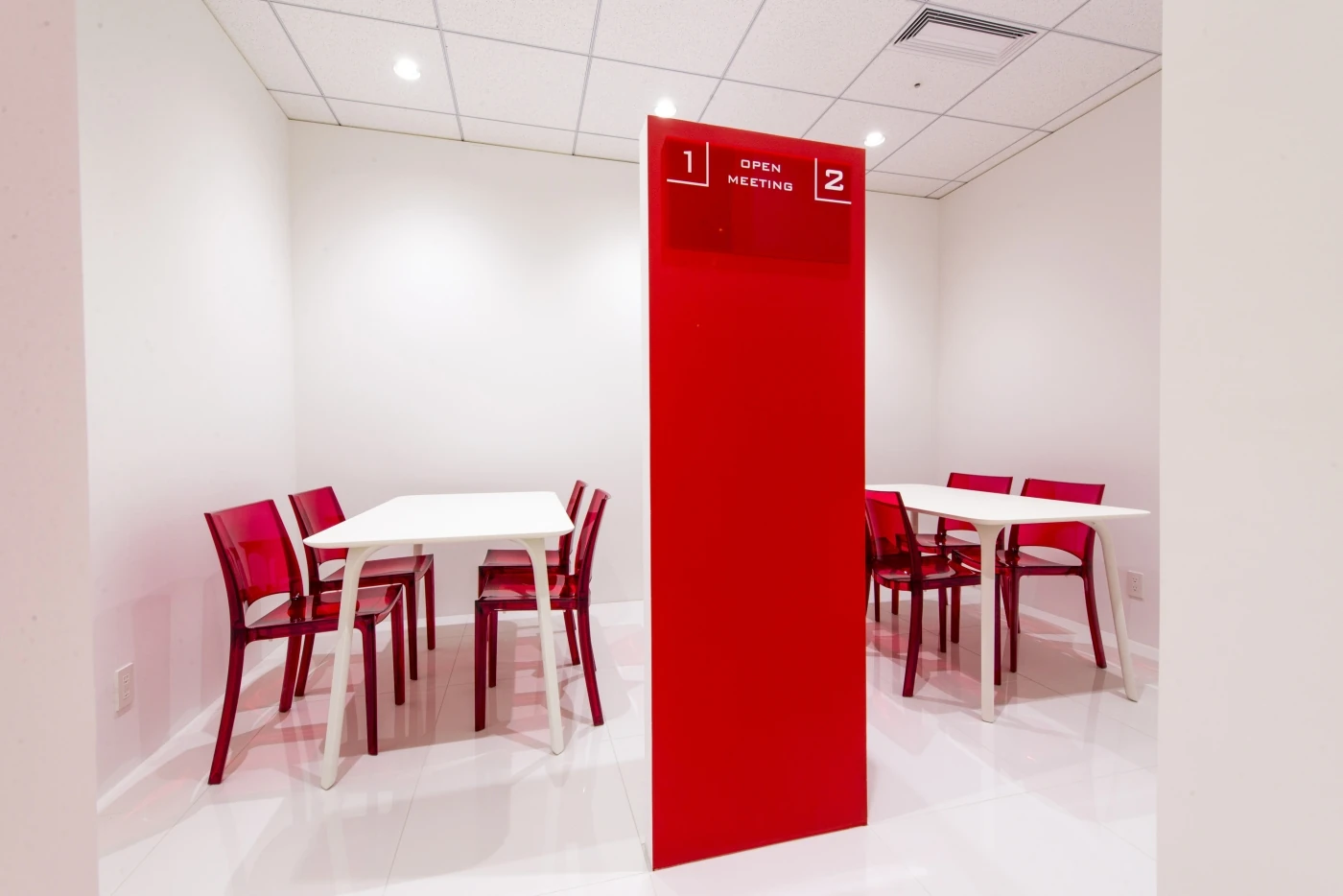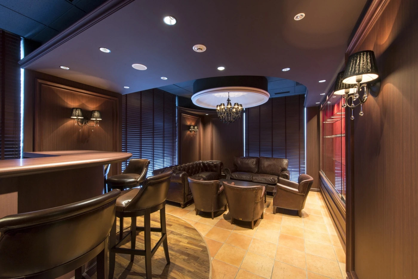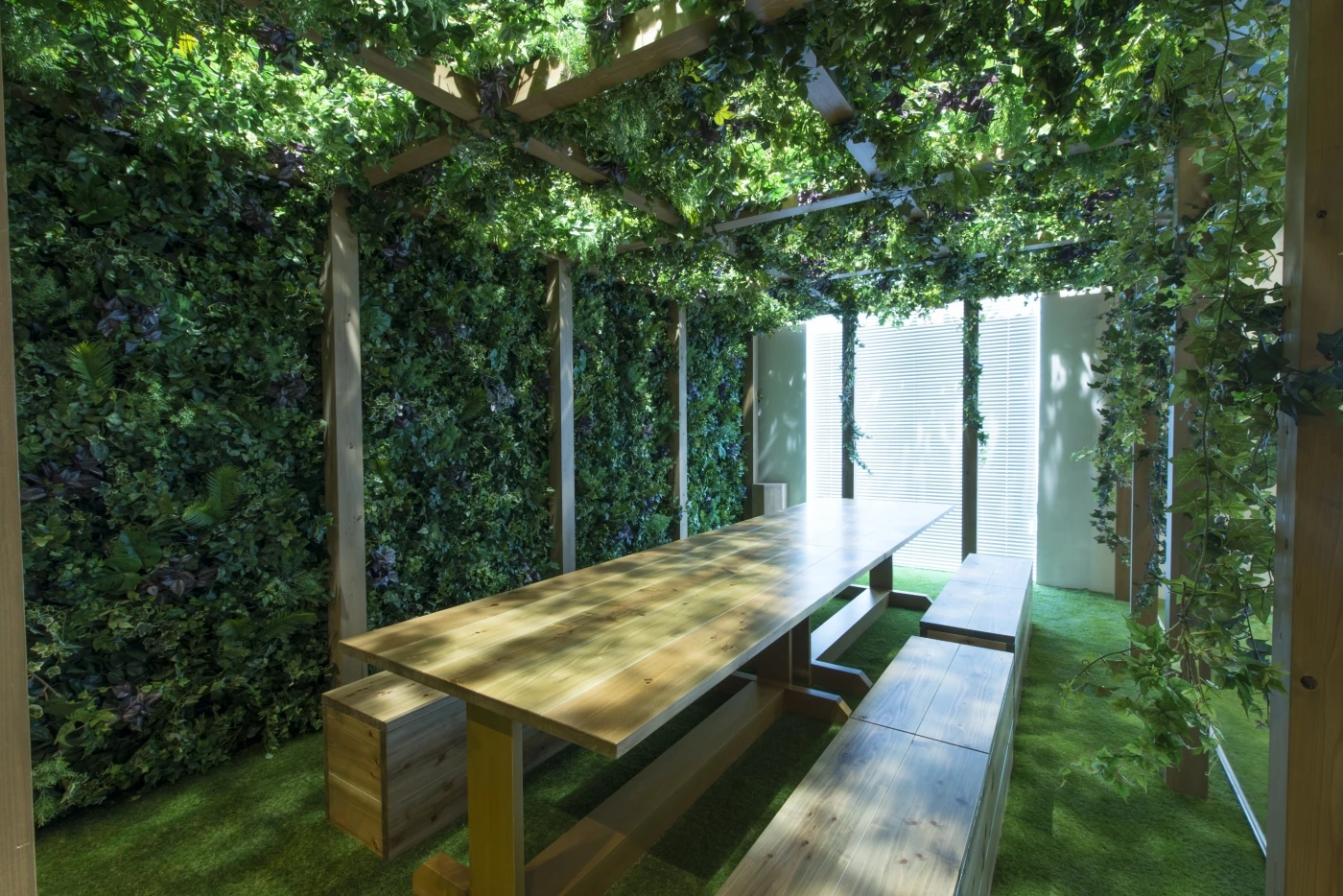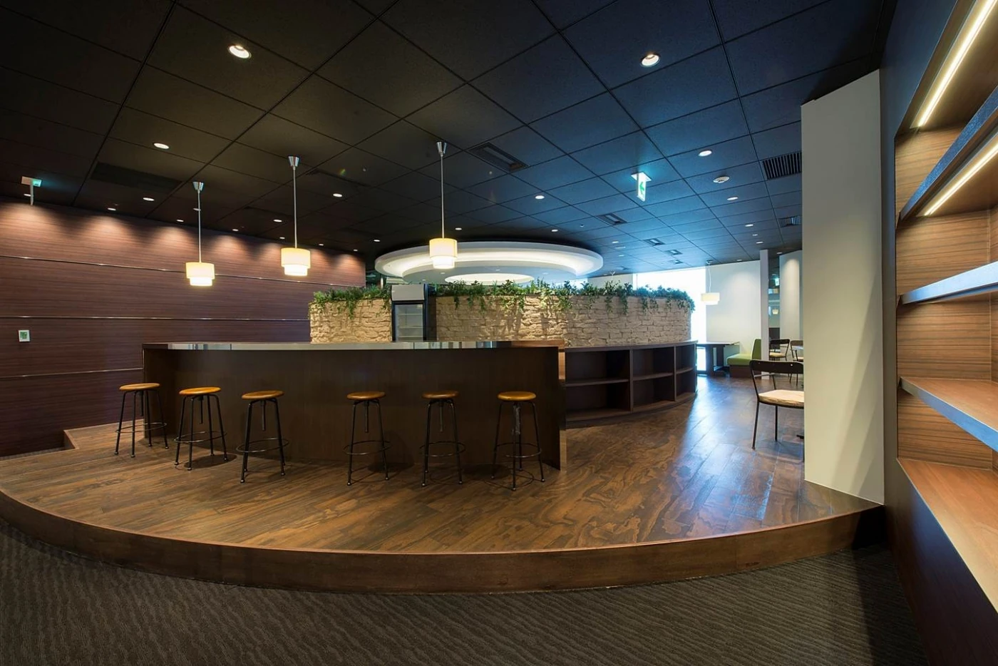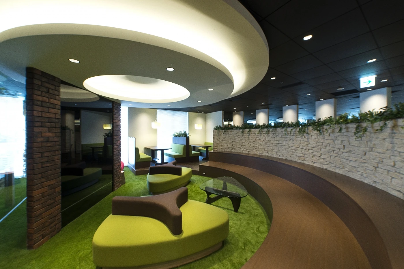 ご移転に伴う交通アクセスの向上により、昔からの大切なお客様はもちろん、社員の家族の方にももっと気軽に来てほしい。そんな想いから、みんなが自然に集まる空間として、カフェスペースを設けました。木の温かみと緑の映えるこの本格的なカフェは、オフィスであることを忘れて、来社された方にくつろいでいただける空間を提供します。オフィスエントランスはCIに基づいたカラーリングでブランドの向上を図り、ワークスペースは社員の方が活き活きと働ける機能性とリフレッシュのバランスを実現しました。