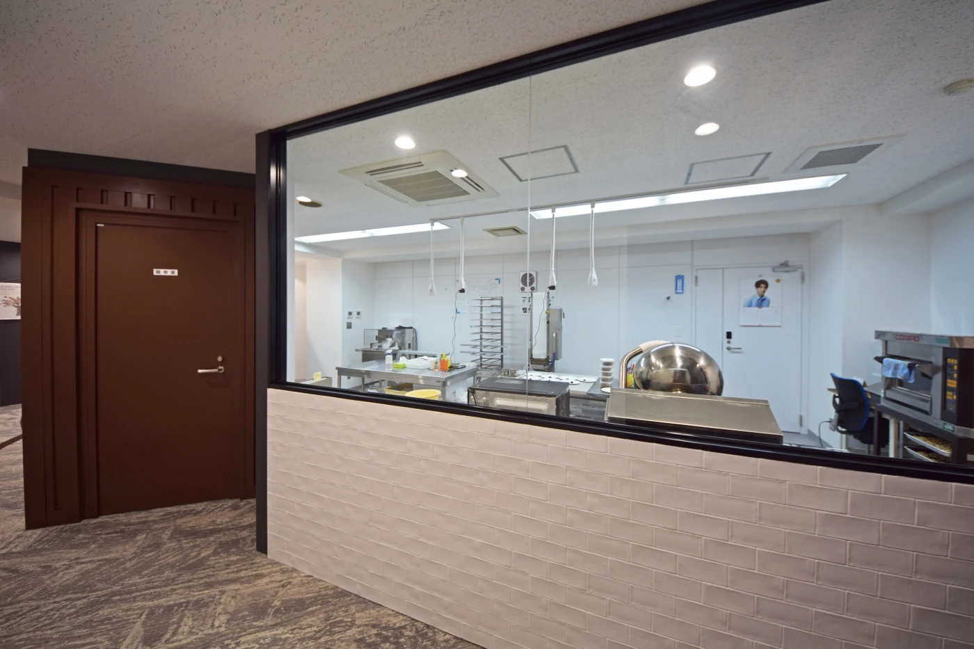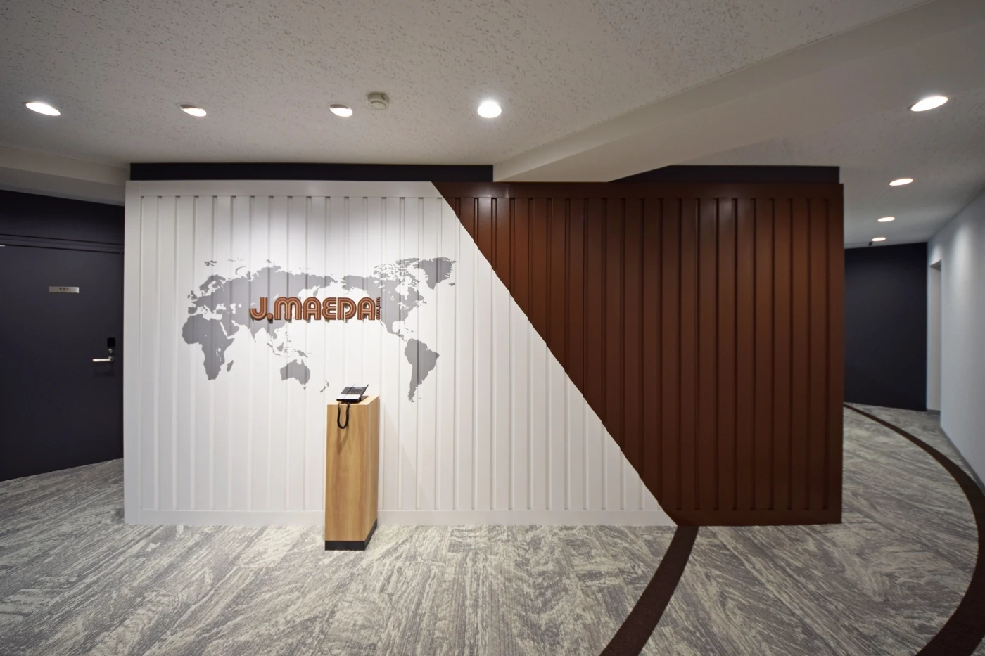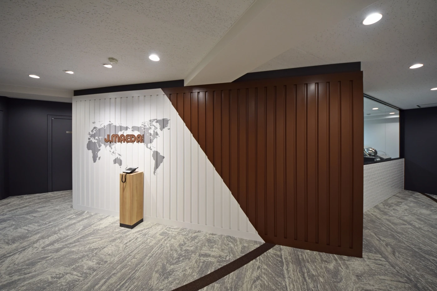 オフィスの顔となるエントランスには貿易業を感じて頂けるようにコンテナを設け、取り扱っているチョコレートカラーのブラウンを用いることでブランディングしています。またグローバル企業というのが感じられるようコンテナには世界地図を施しました。床の張り分けはアーチ状にすることで世界へ広げるという想いを表現し、これからのさらなる発展が感じられる空間となっております。コンテナ裏側から通じる開発室の壁は腰上ガラスとタイルで構成しており、来社されたお客様が通路から様子を見られるようにしました。