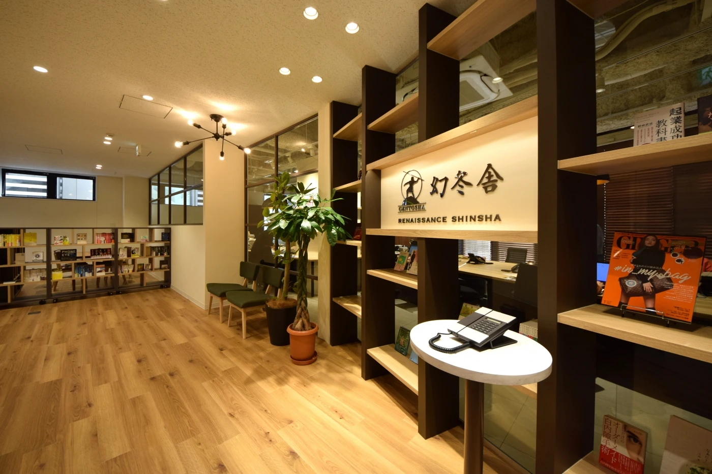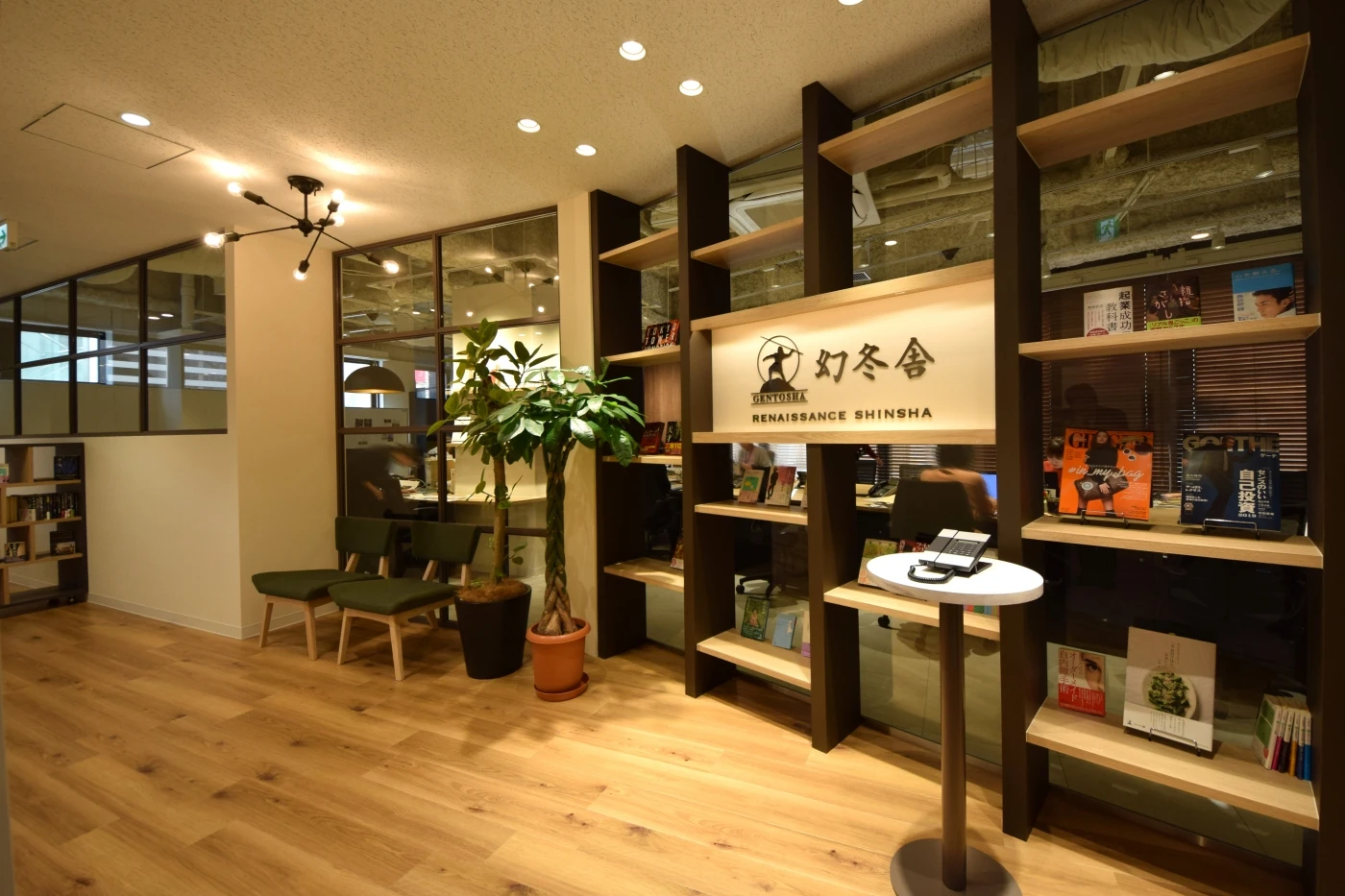 大阪のオフィスに引き続き、東京のオフィス移転もお手伝いさせていただきました。企業のイメージを表すように、大きなブックシェルフをエントランスとし、話題の書籍や雑誌をディスプレイしています。奥にはガラス越しにワークスペースのぞけるようになっており、限られた空間をより広く開放的に。ミーティングスペースは、これも可動式のブックシェルフで区切られており、時にはセミナーにも使えるようにフレキシブルな空間としています。ワークスペースにはデッドスペースになりがちな柱を中心に、ひとつなぎの大きな造作デスクを配置。さらにスケルトン天井にして白く塗装をしているので、画一的ではなくユニークなワークスペースとなっています。全体的にトレンドを取り入れつつも、非常に落ち着きのある空間で、幻冬舎様の歴史と温かさを表現したオフィスとなりました。 大阪オフィスはコチラ