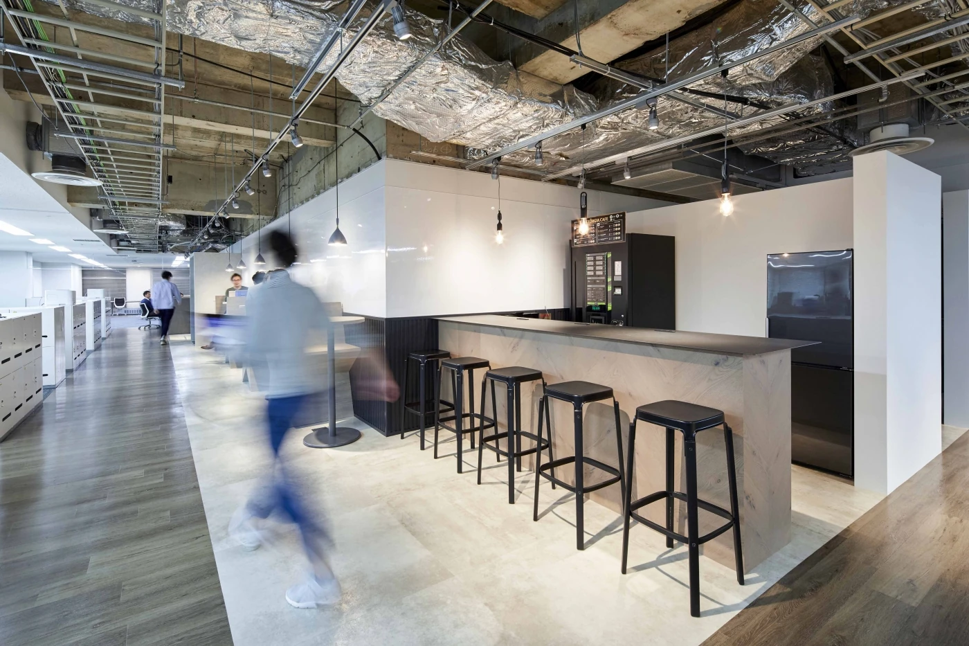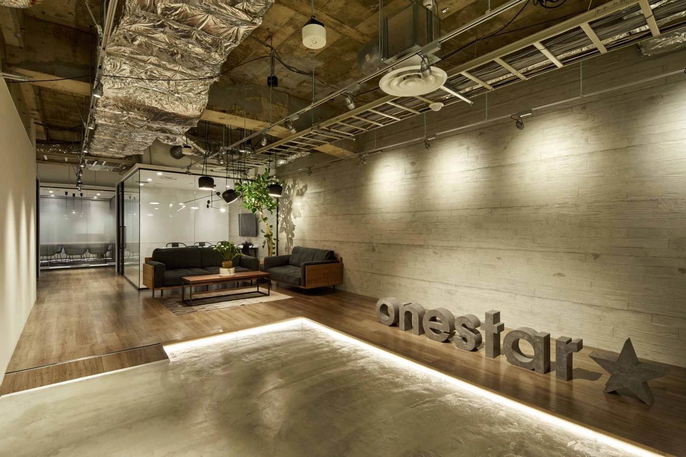 企業理念である”BeSTAR”命名の由来をもとに、”オフィスで働くひとりひとりが、自らが輝く太陽(恒星)のように、自らの輝きで周囲を照らすように”という想いを込め、オフィスをデザインしました。エントランスは壁面エイジング塗装やモルタルの床で無骨な雰囲気を、フリーエリアはカジュアルな雰囲気の中に、ライン照明とスケルトン天井でスタイリッシュさを演出しています。また、各エリアに特徴的なペンダントライトを配置したり、星型の1on1ベンチで遊び心を演出したりと、見所満載のオフィスを仕上げました。