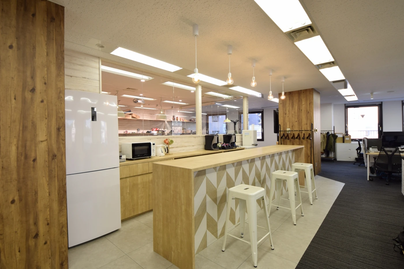 2社が共創し、無機質材(ガラス)と有機質材(木)が融合するオフィス