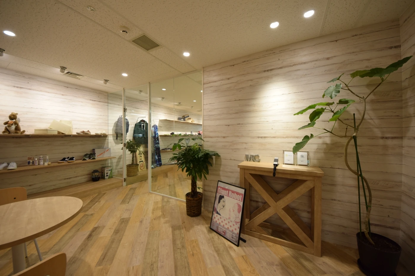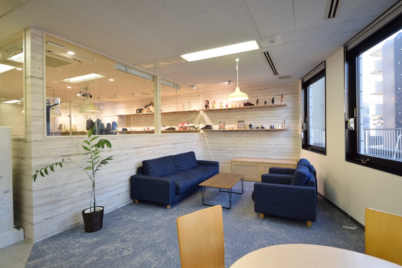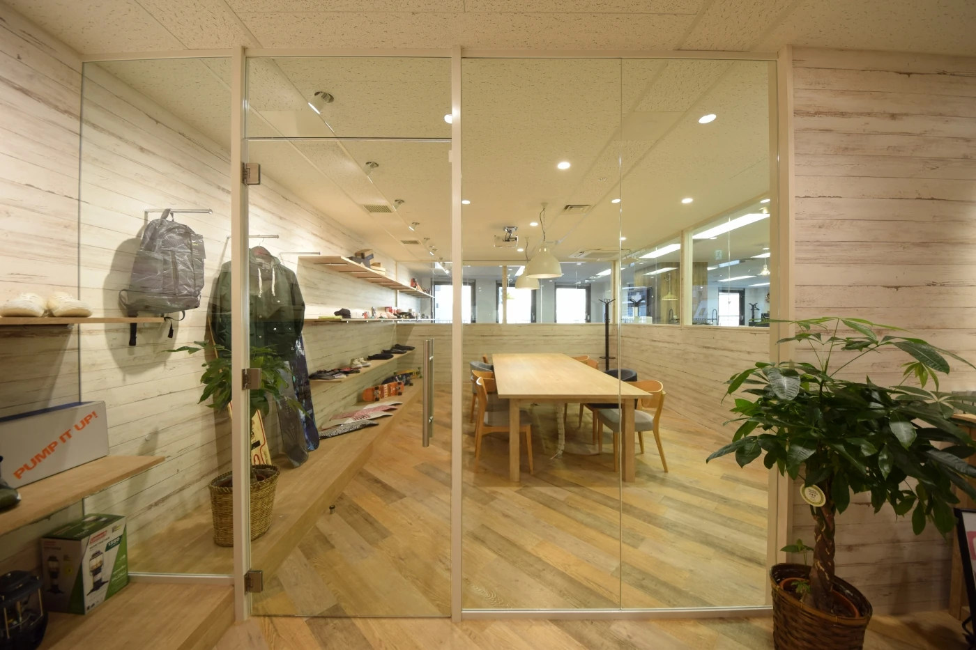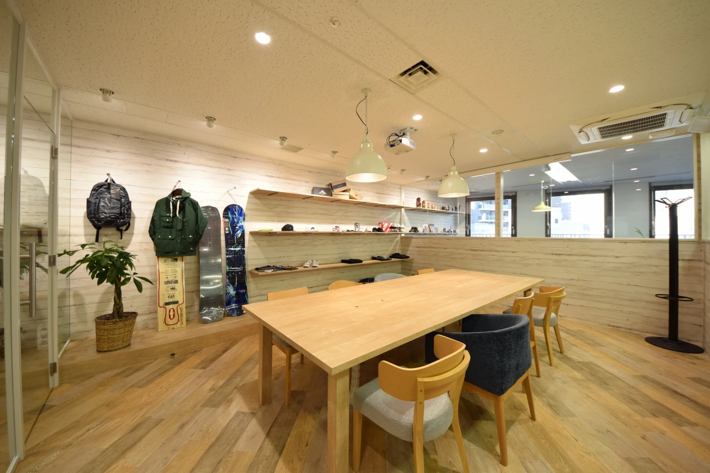 業種の異なる2社が同じ空間に集約して働くことから、それぞれが気持ちよく働ける共創の場を目指しました。デザインは明るく開放感のある空間を目指し、ガラスと木目を効果的に使用したデザインとしております。まさに、共創と融合がキーワードのオフィスです。サーフィンやスノーボードなど、スポーツファッション・スポーツ用品等の販売事業も運営している企業も入ることから、西海岸風の広々とリラックスした雰囲気を取り入れつつ、エントランスから会議室、社内のリフレッシュスペースへと壁一面をディスプレイ棚で繋ぐなど、空間の奥行を感じることができる設えとしました。