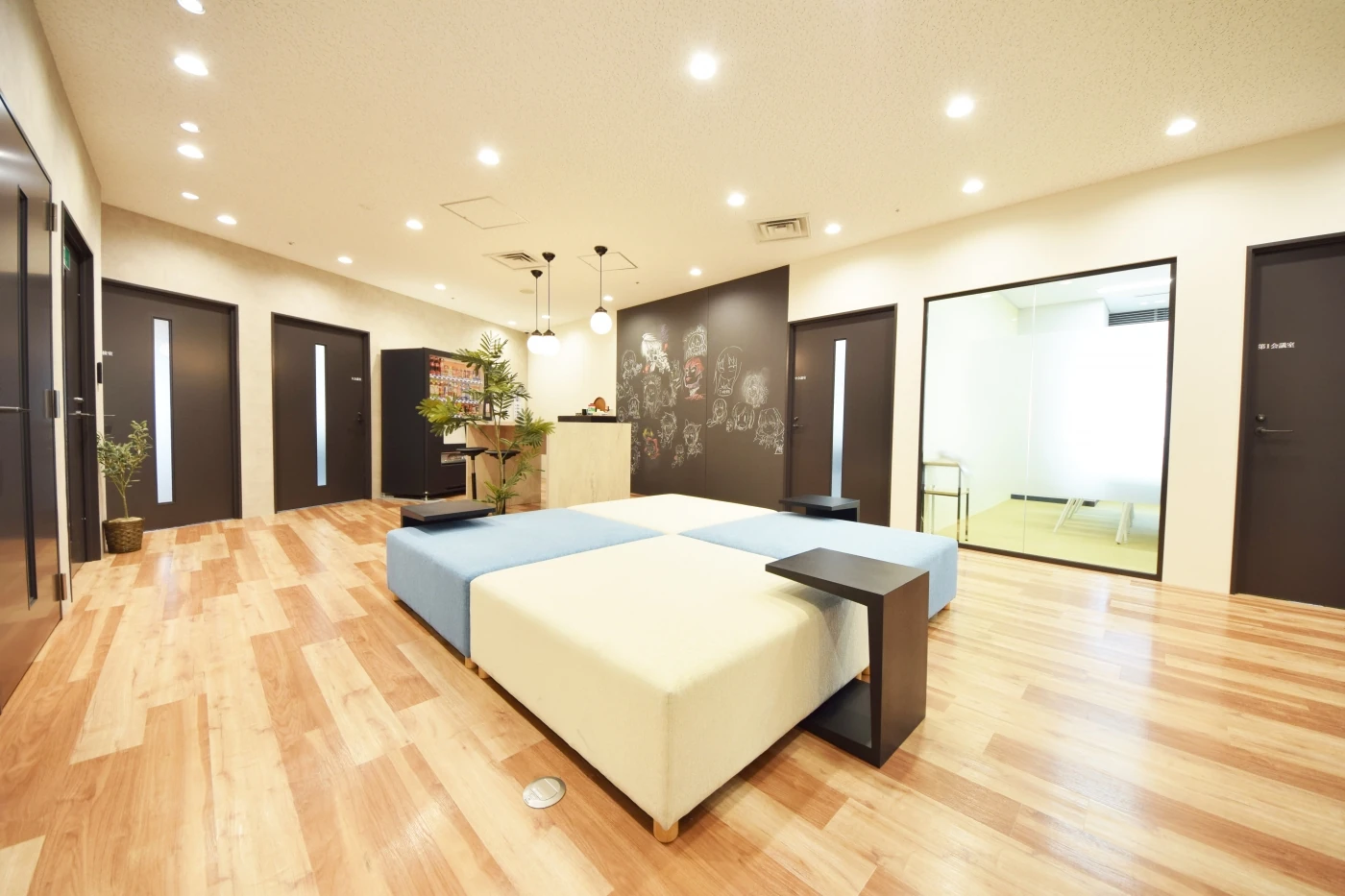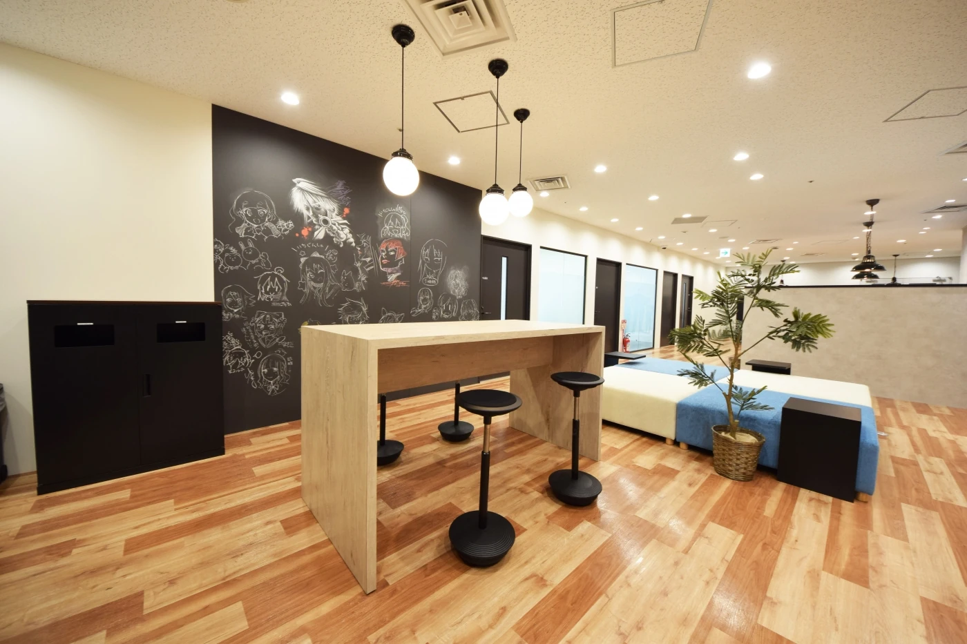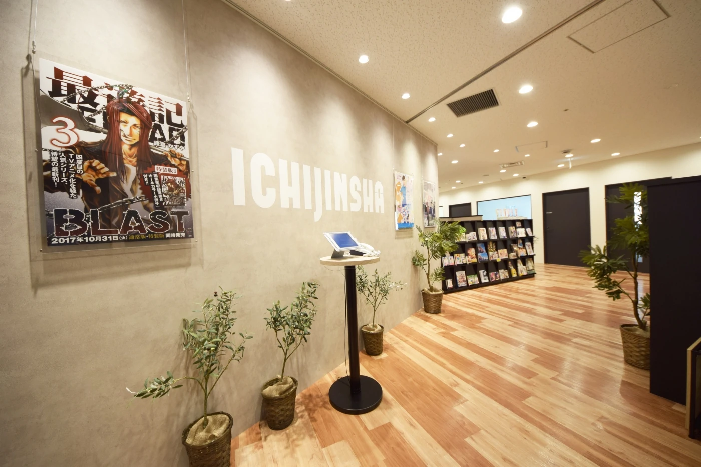 "これからの一迅社様"を感じられるオフィスとして、『Spin off』をコンセプトに、コミュニケーションを多くとれる導線を考慮したレイアウト・デザインにしました。来客エリアであるエントランスや会議室には、ポスターや作品展示スペースを設けて、一迅社様の作品に触れあえる工夫を散りばめました。中でも黒板クロスで設けたコミュニケーションボードは、作家の方々に自由に絵を描いて頂き、オフィスの象徴的な場にしております。以前のオフィスで不足していた会議室は、会議管理システムの導入と、用途に合わせて規模を変えた6つの部屋に加えて、4つのオープンブースを設けて、運用効率とスペース効率を図りました。全体的に木目とシンプルな色合いを使い、温かみのあるオフィス空間に仕上げました。