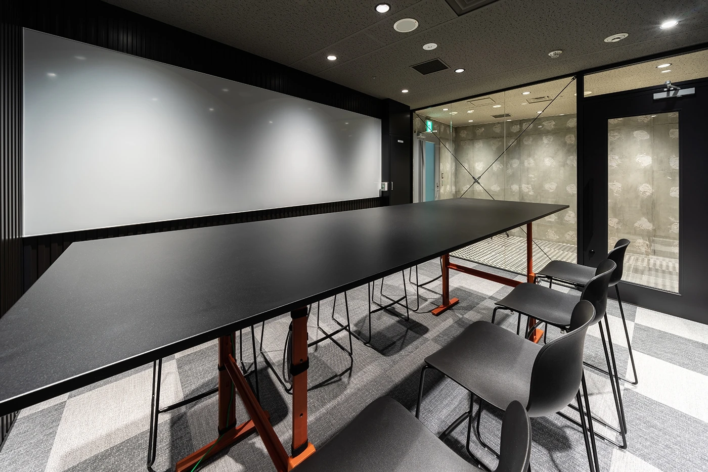 ギックス様ならではの意図(機能と意味)を前面に出したコンセプチュアル・デザインのオフィスへ。事業拡大を進められる中で、一人ひとりの空間の確保やチーム毎での働き方を考えられた結果、お客様と一緒にニーズに合わせたサイズや仕様を考え、ワークデスクをオリジナルで製作しました。以前のオフィスとはガラッと変え、執務室は明るく、全体的にはインダストリアルな雰囲気を作りました。会議テーブルは橋の部材から作られた脚を使った製品で、脚の赤が空間に映えます。ご移転と同じタイミングで新しくなったロゴマークはステンシルで味のあるタッチで施工されています。スイッチプレートや設備パネルの色等、細部までこだわったオフィスが出来上がりました。
