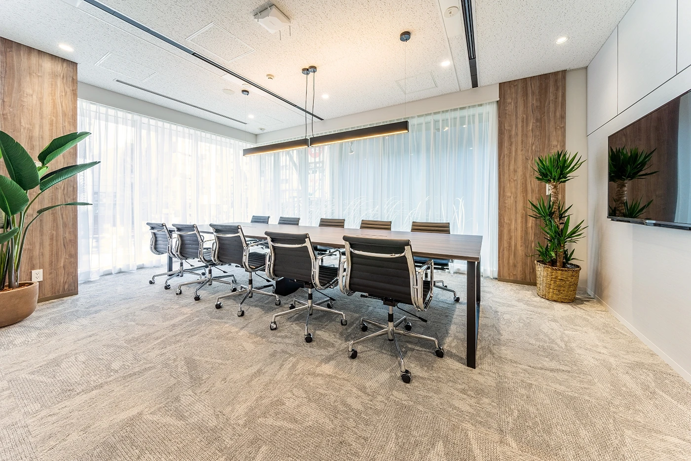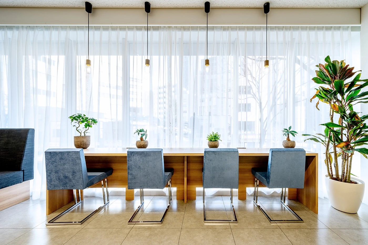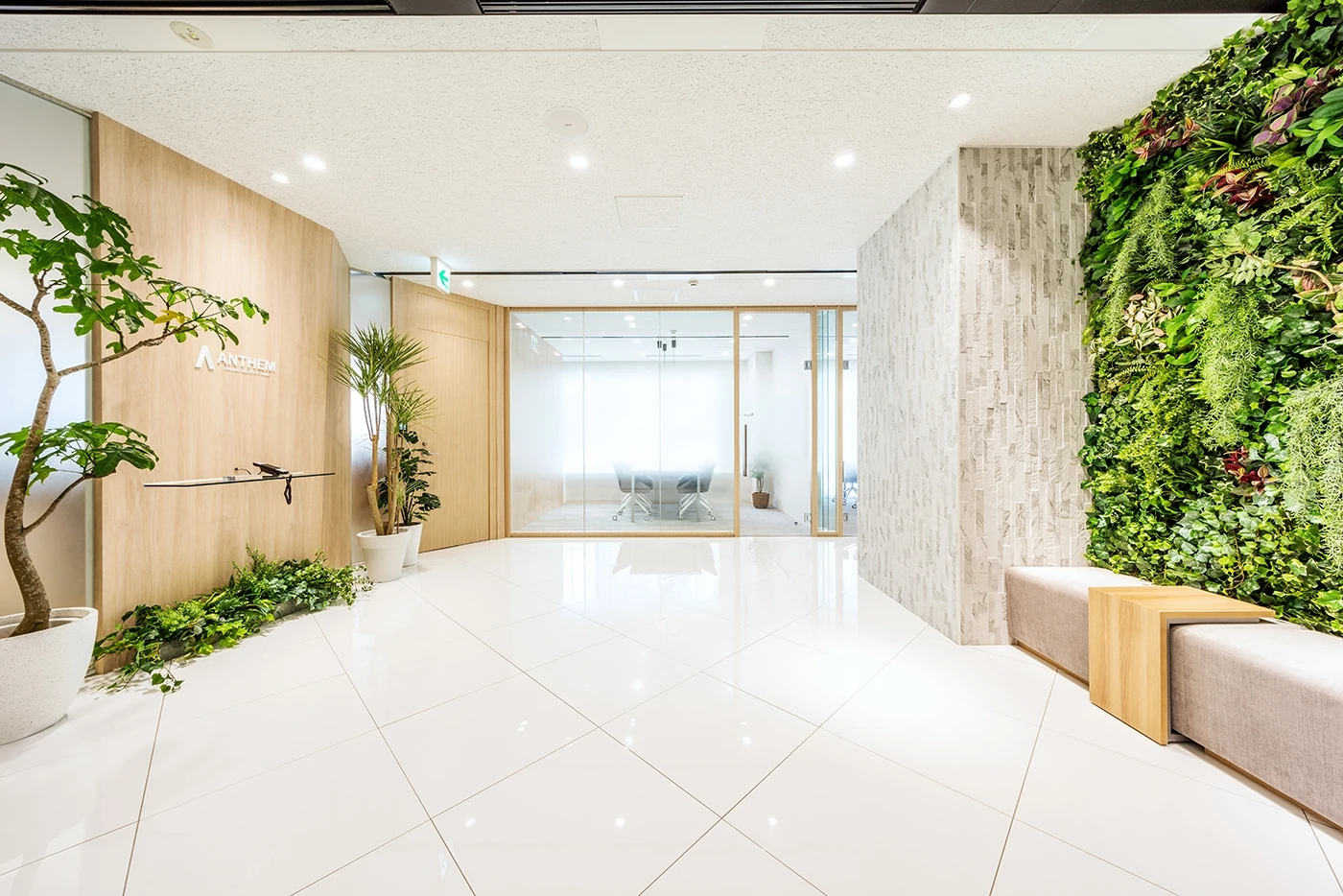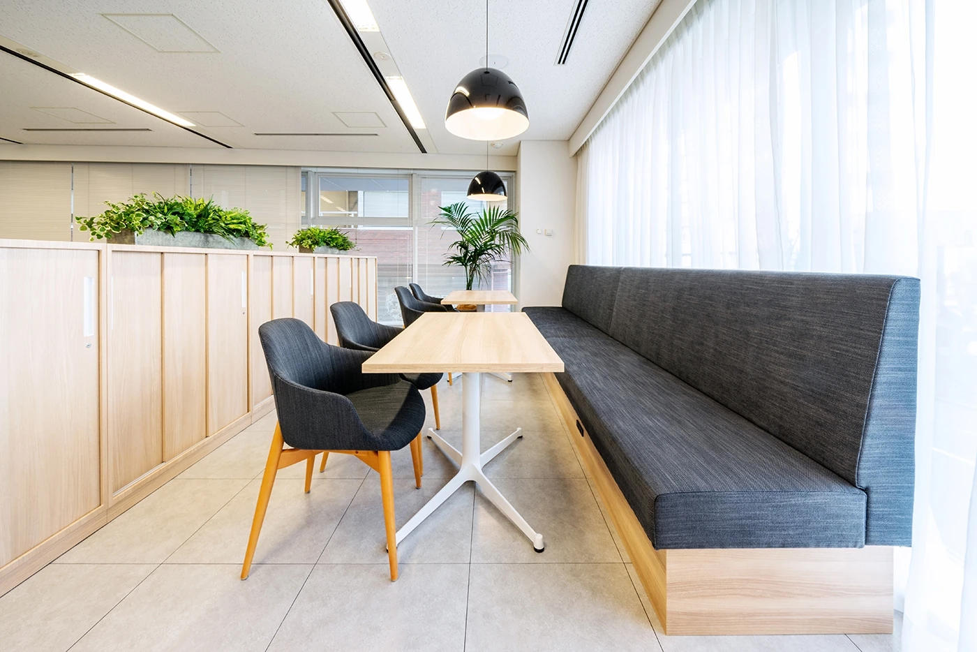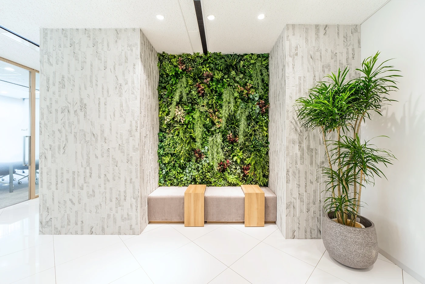 外光が差し込む、明るく洗練されたオフィス空間ができあがりました。エントランスの壁一面に広がる植栽はインパクトがあり、お客様や社員の皆さまを気持ちよく迎えてくれます。エントランスの木目の色味や床材のタイルなどはイメージを何度もご確認いただき、こだわりを持った空間になっています。家具1台にしても数回にわたってショールームに足を運んでいただき、張り地や脚の形状も何がベストなのか、一緒に悩み最終決定いたしました。デザインだけでなく、旧オフィスで悩みを持たれていた収納に関しても、倉庫スペースや余ったスペースを十分に生かし無駄なスペースがないようプランニングいたしました。