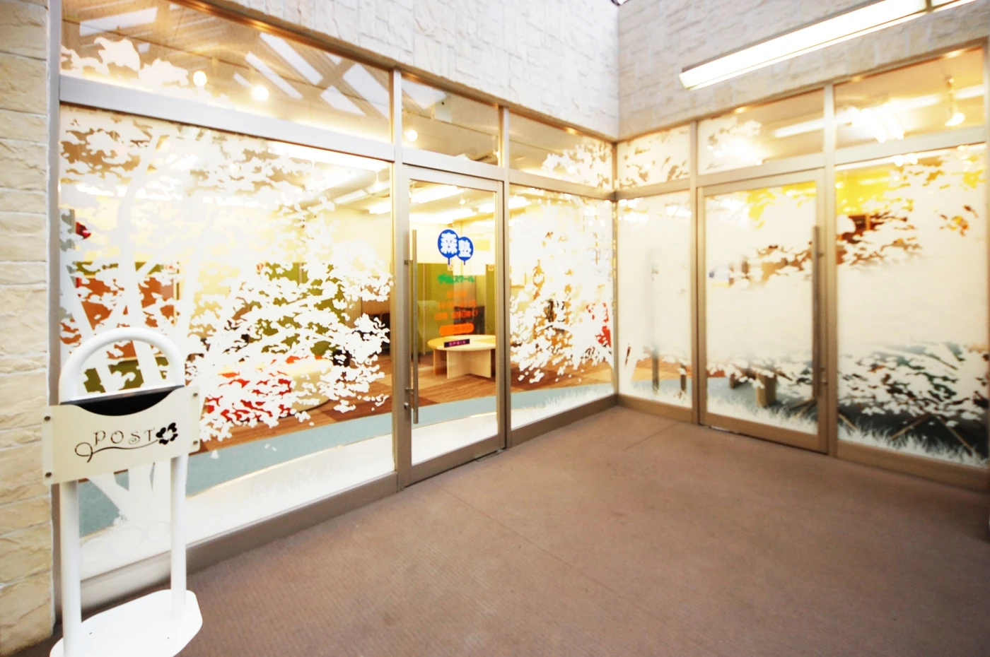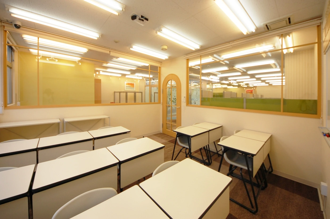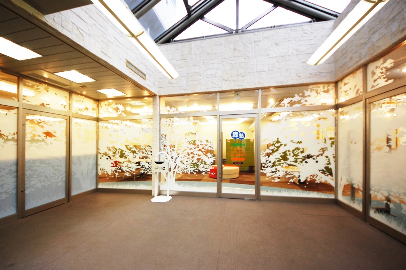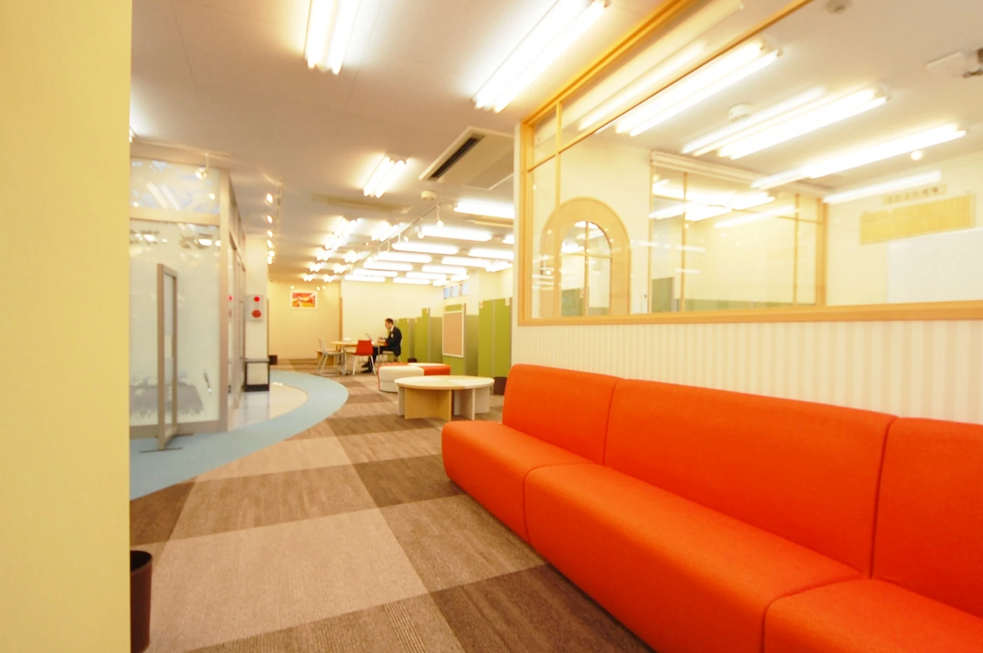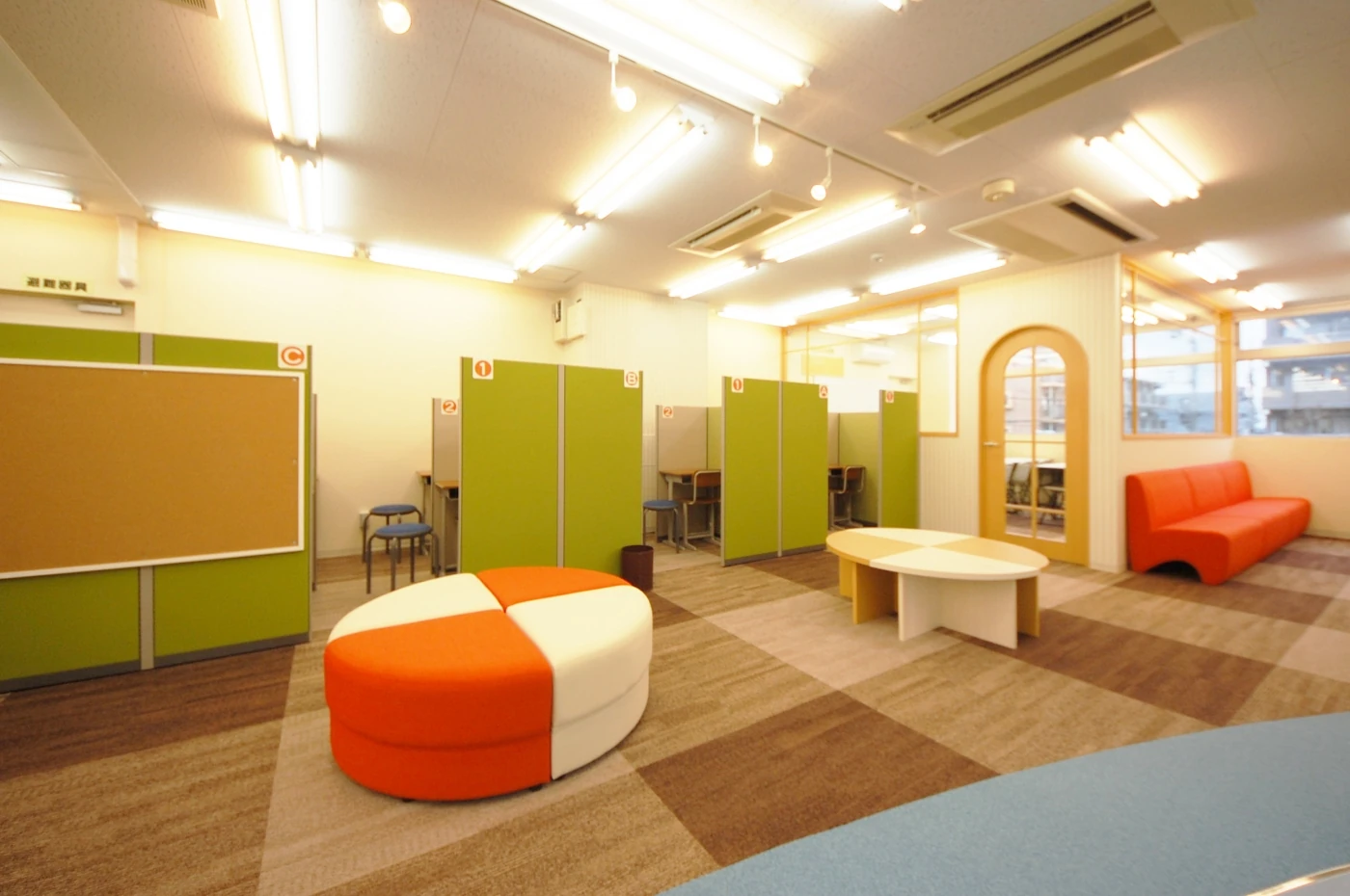 多様な個性や能力を尊重した楽しく通える塾”をテーマに、空間全体のプロデュースをさせていただきました。入口ホールは、ガラス壁に白い木々のグラフィックシートを施し、洗練された印象に。一歩中へ入ると、湖のようなブルーとやわらかい土のようなベージュのチェック柄タイルカーペット、オレンジ色のソファ、グリーンのパーテーションなど、カラフルな空間が広がります。森の中の小屋をイメージした自習室の扉は半円アーチとなっており、入退室の際もワクワクさせてくれます。まるで森の中で学習しているような、温かくのびのびと過ごせる空間になりました。