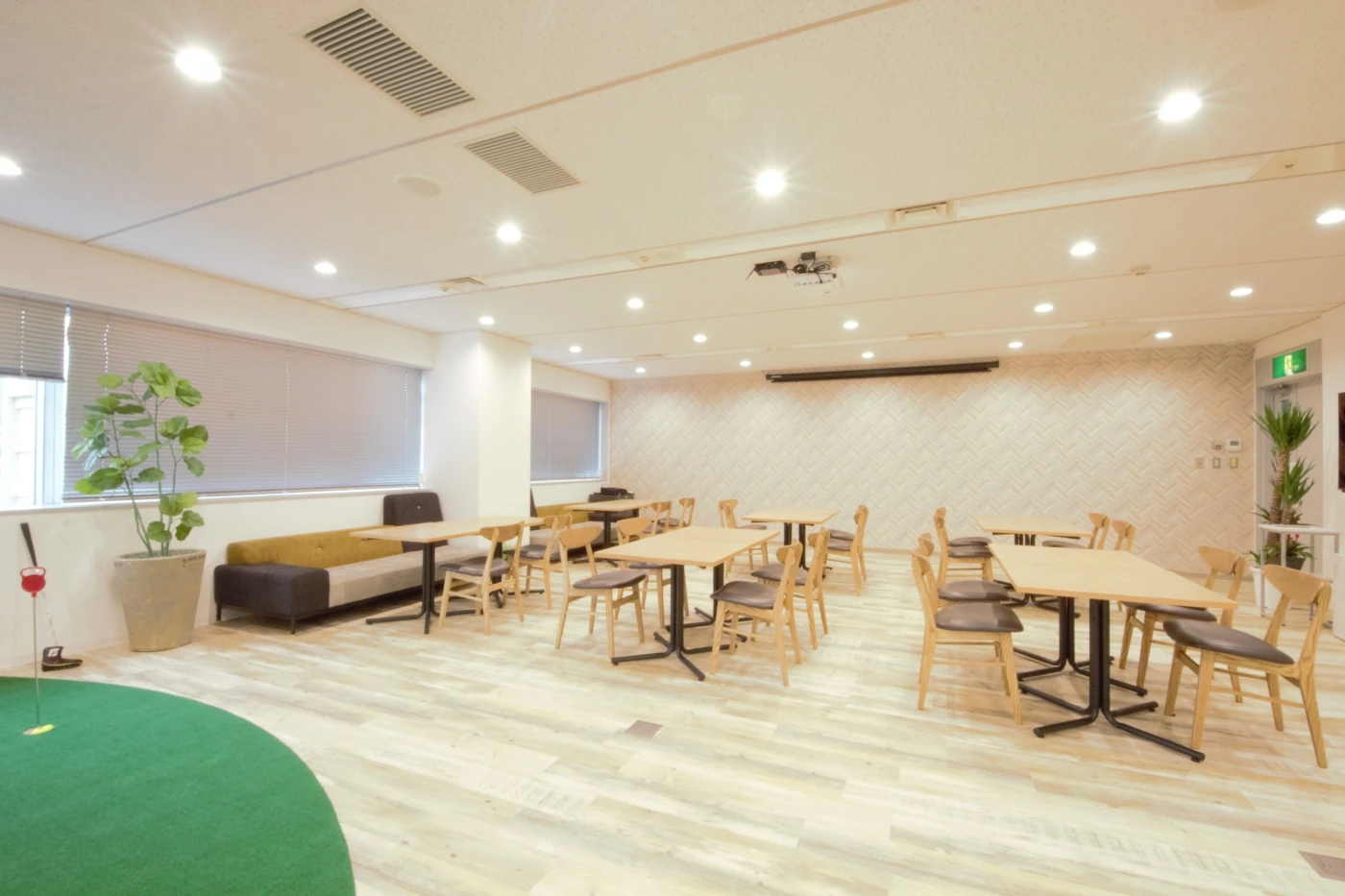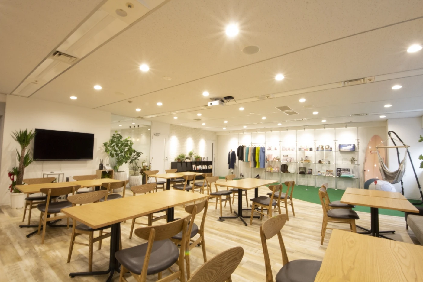 空間全体にわたり、パイン系ウッドとホワイトブリックをベースマテリアルに使用。芝生や家具にアクセントを持たせることで、心地よく、アメイズプラス様らしい遊び心のある空間になりました。