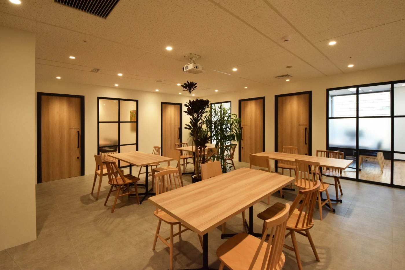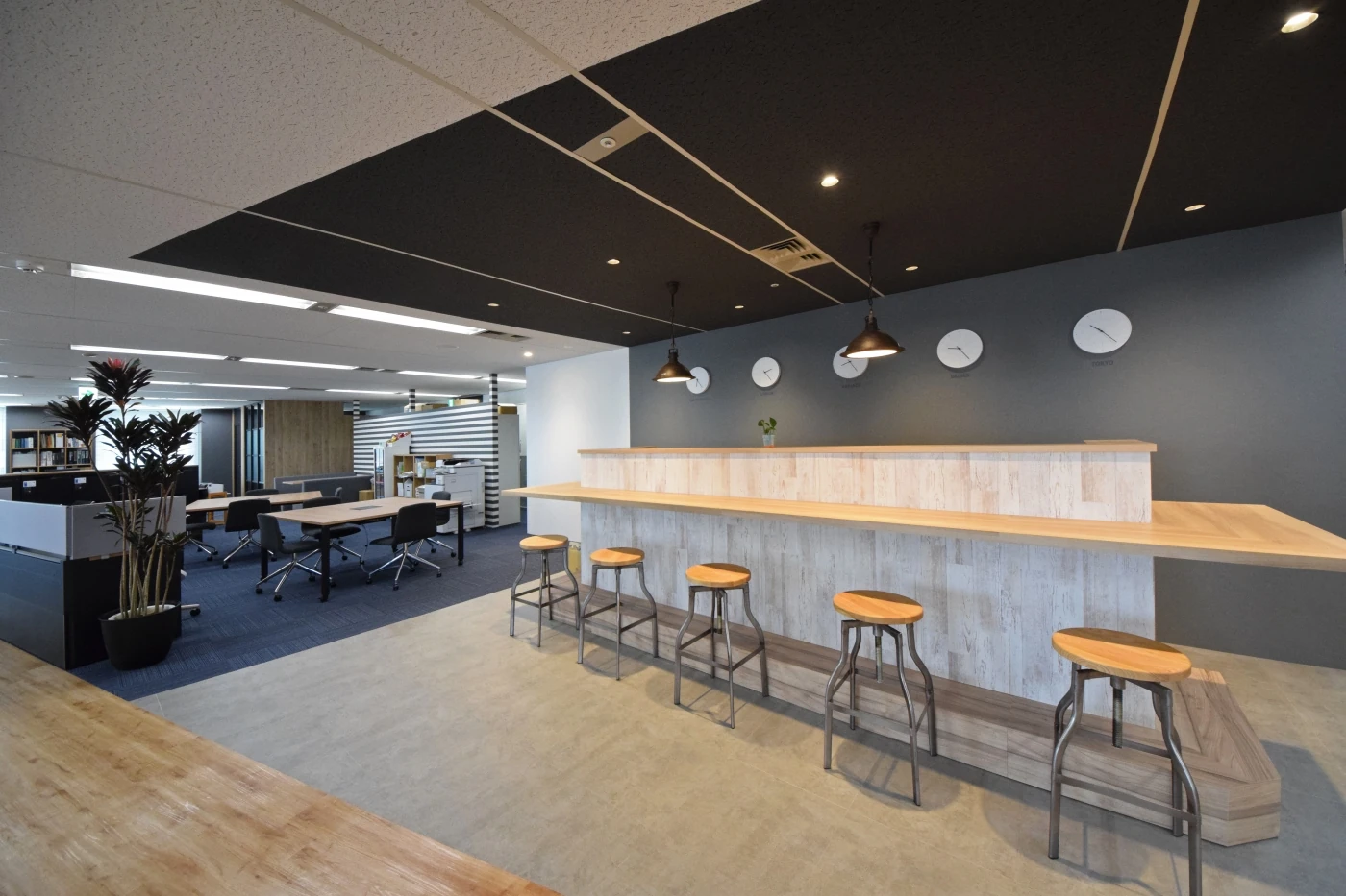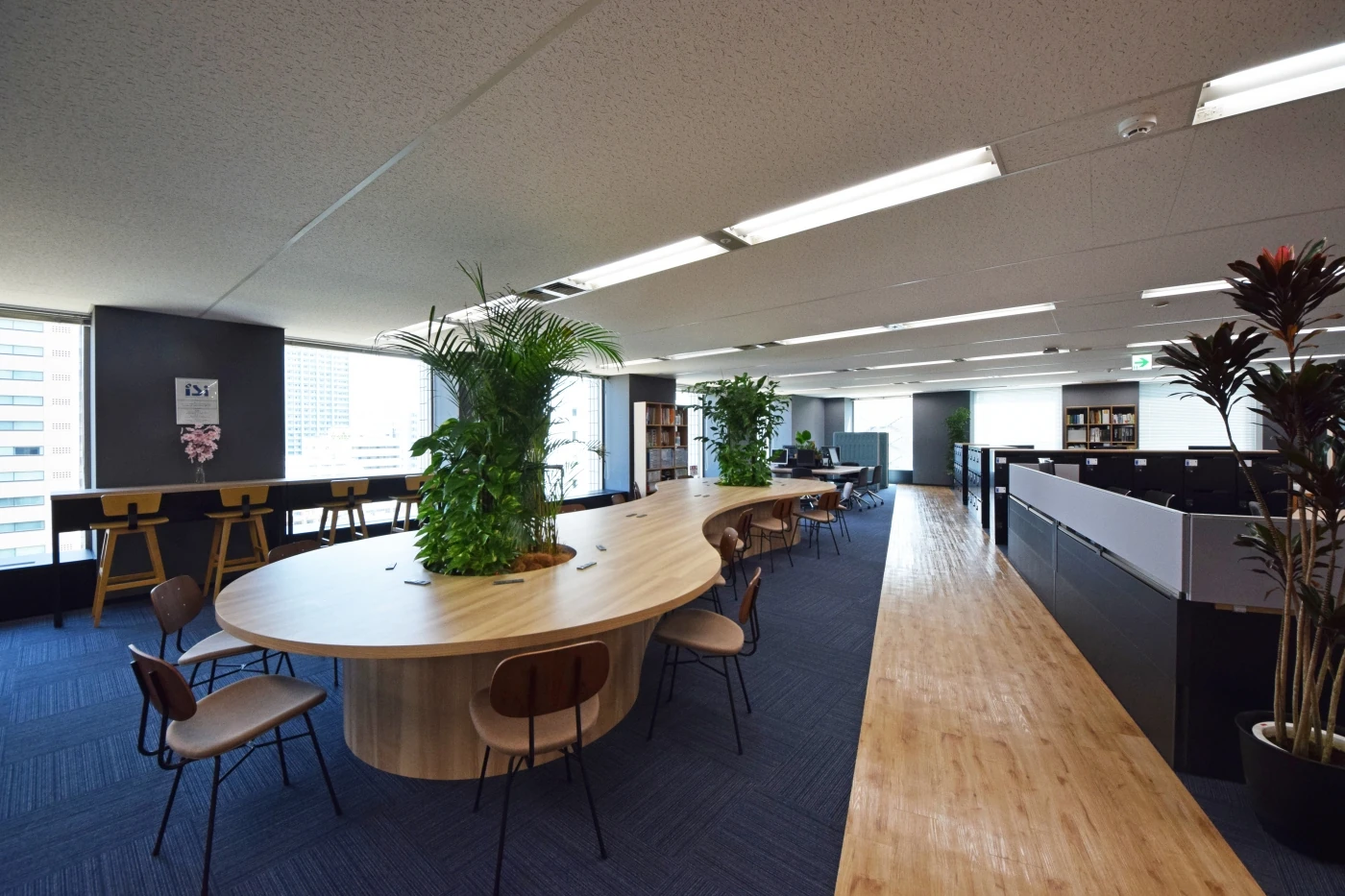 ご移転を機にフリーアドレスを導入し、社内のコミュニケーションを更に活発にしたいというご要望からINTERACTIVE PARKというコンセプトを導きました。8の字型のビッグテーブルやハイカウンター、正方形のデスク、ソファなど異なったシチュエーションに合わせて働く場所を選ぶことができるようにしました。会議室に囲われたオープンなスペースは打合せだけでなくセミナー等もできるように自由度の高いテーブルとチェアで構成しています。パントリーカウンターを中央に設けることで、コミュニケーションの場としてマグネットスペースの役割を持たせました。多様な文化、多様な個性がお互いを刺激し合い成長していくオフィス空間です。